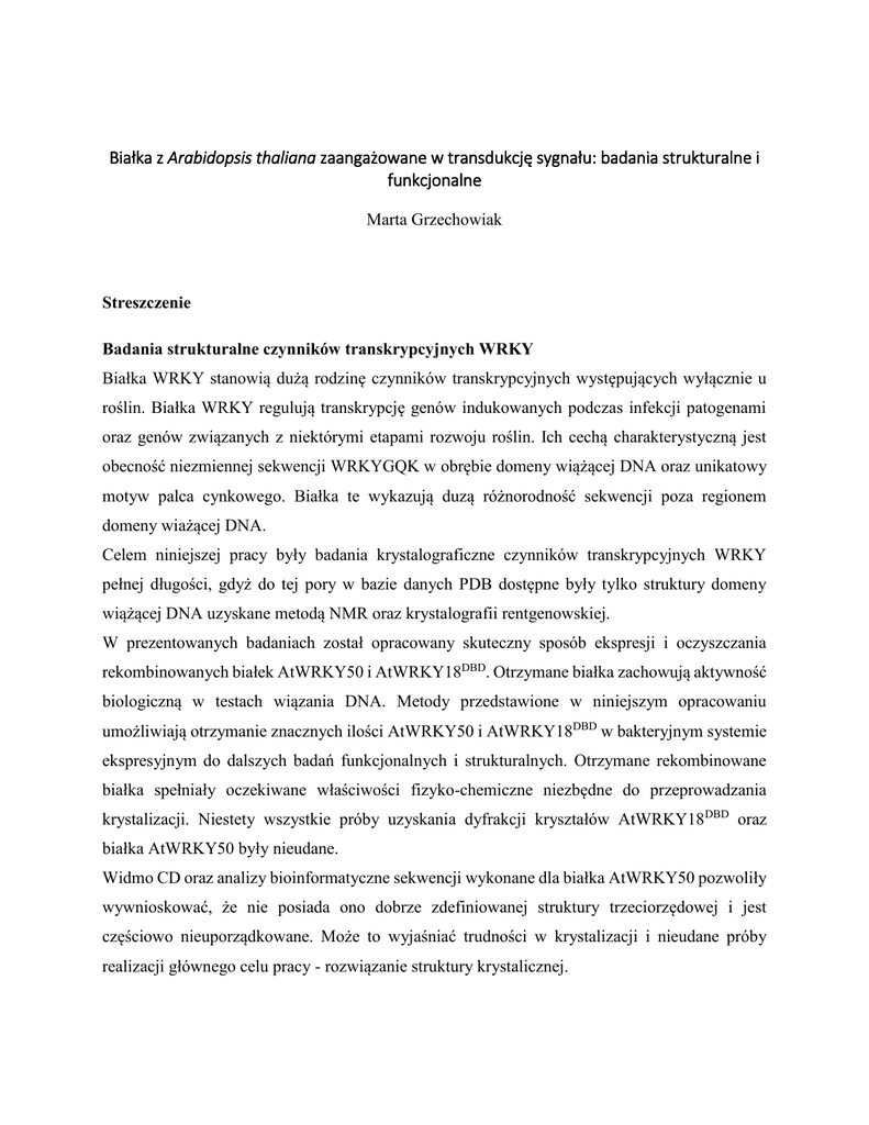 Białka z Arabidopsis thaliana zaangażowane w transdukcję sygnału: badania strukturalne i funkcjonalne Marta Grzechowiak Streszczenie Badania strukturalne czynników transkrypcyjnych WRKY Białka WRKY stanowią dużą rodzinę czynników transkrypcyjnych występujących wyłącznie u roślin. Białka WRKY regulują transkrypcję genów indukowanych podczas infekcji patogenami oraz genów związanych z niektórymi etapami rozwoju roślin. Ich cechą charakterystyczną jest obecność niezmiennej sekwencji WRKYGQK w obrębie domeny wiążącej DNA oraz unikatowy motyw palca cynkowego. Białka te wykazują duzą różnorodność sekwencji poza regionem domeny wiażącej DNA. Celem niniejszej pracy były badania krystalograficzne czynników transkrypcyjnych WRKY pełnej długości, gdyż do tej pory w bazie danych PDB dostępne były tylko struktury domeny wiążącej DNA uzyskane metodą NMR oraz krystalografii rentgenowskiej. W prezentowanych badaniach został opracowany skuteczny sposób ekspresji i oczyszczania rekombinowanych białek AtWRKY50 i AtWRKY18DBD. Otrzymane białka zachowują aktywność biologiczną w testach wiązania DNA. Metody przedstawione w niniejszym opracowaniu umożliwiają otrzymanie znacznych ilości AtWRKY50 i AtWRKY18DBD w bakteryjnym systemie ekspresyjnym do dalszych badań funkcjonalnych i strukturalnych. Otrzymane rekombinowane białka spełniały oczekiwane właściwości fizyko-chemiczne niezbędne do przeprowadzania krystalizacji. Niestety wszystkie próby uzyskania dyfrakcji kryształów AtWRKY18 DBD oraz białka AtWRKY50 były nieudane. Widmo CD oraz analizy bioinformatyczne sekwencji wykonane dla białka AtWRKY50 pozwoliły wywnioskować, że nie posiada ono dobrze zdefiniowanej struktury trzeciorzędowej i jest częściowo nieuporządkowane. Może to wyjaśniać trudności w krystalizacji i nieudane próby realizacji głównego celu pracy - rozwiązanie struktury krystalicznej. Wykonane analizy ITC i EMSA potwierdziły biologiczną aktywność rekombinowanych białek AtWRKY50 i AtWRKY18DBD do wiązania DNA. Badania strukturalne enzymów zaangażowanych w metabolizm fosforanów Pirofosfataza jest enzymem hydrolizującym nieorganiczny pirofosforan PPi do fosforanu Pi w obecności dwuwartościowych jonów metali. W reakcji z udziałem PPazy w komórce odzyskiwany jest fosforan z pirofosforanu, powstający w wyniku degradacji ATP. Enzym ten jest obecny u wszystkich organizmów, a reakcja hydrolizy pirofosforanu pełni istotną rolę w obiegu fosforu w komórce. W genomie Arabidopsis thaliana zidentyfikowano 5 genów kodujących homologi pirofosfataz cytoplazmatycznych. Do tej pory nie było żadnych danych strukturalnych dotyczących pirofosfataz roślinnych. Głównym celem mojej pracy były badania strukturalne pirofosfatazy AtPPA1. Gen Atppa1 kodujący ten enzym został wklonowany do bakteryjnego wektora ekspresyjnego i poddany ekspresji w komórkach E. coli w celu produkcji białka rekombinowanego ze znacznikiem histydynowym (His-tag). Rekombinowane białko zostało oczyszczone z bakteryjnego lizatu w dwóch kolejnych etapach: chromatografii powinowactwa na oraz filtracji żelowej a następnie poddane krystalizacji. Struktura krystaliczna pirofosfatazy AtPPA1 została rozwiązana z wysoką rozdzielczością (1.9 Å) metodą podstawienia cząsteczkowego i udokładniona (wskaźnik rozbieżności R poniżej 15,6%). Współrzędne struktury AtPPA1 zostały zdeponowane w bazie danych PDB (kod: 4lug). Ogólna struktura białka AtPPA1 wykazuje duże podobieństwo do znanych wcześniej pirofosfataz z bakterii i drożdzy mimo tego, że pirofosfataza z A. thaliana wykazuje ok. 40% identyczności (na poziomie sekwencji aminokwasowej) z enzymami bakteryjnymi i tylko ok. 20% identyczności z pirofosfatazami z innych organizmów eukariotycznych nie uwzględniając roślin. Ponadto, pirofosfatazy z różnych grup organizmów wykazują odmienną oligomeryczną organizację: bakteryjne tworzą heksamery, drożdżowe tworzą dimery, natomiast roślinna pirofosfataza AtPPA1 jest trimerem o masie 75 kDa. Test aktywności enzymatycznej wykazał, ze otrzymane przeze mnie rekombinowane białko AtPPA1 jest biologicznie aktywne. Przygotowane 2 warianty tego białka z mutacjami w obrębie centrum aktywnego (D98N i D103N) nie wykazywały aktywności aktywności enzymatycznej. Dodatkowo zaobserwowałam, że podczas krystalizacji dochodzi do odcięcia 30 N-terminalnych reszt aminokwasowych. W celu zidentyfikowania miejsca cięcia zostało wykonane oznaczenie sekwencji N-końca pirofosfatazy AtPPA1. Interesujące jest to, że w przypadku mutantów, odcinanie N-terminalnego fragmentu białka zachodzi wolniej. Analiza bioinformatyczna sekwencji AtPPA1 przewidziała, że to białko posiada N-końcowy peptyd sygnalny, z miejscem cięcia po Val31, kierujący to białko do mitochondrium.