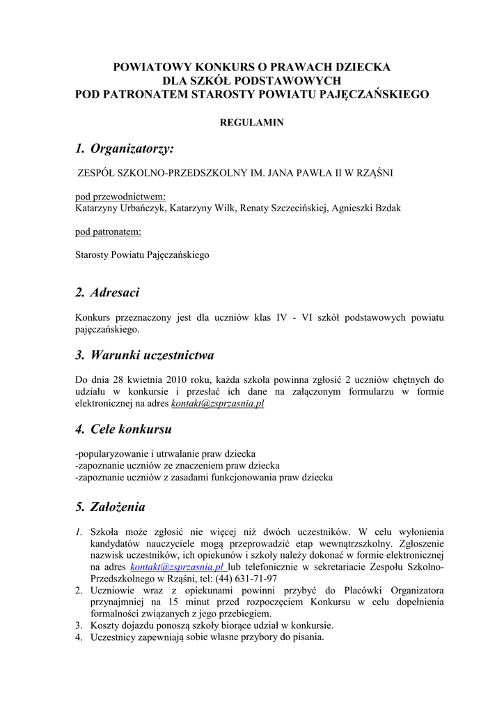 POWIATOWY KONKURS O PRAWACH DZIECKA DLA SZKÓŁ PODSTAWOWYCH POD PATRONATEM STAROSTY POWIATU PAJĘCZAŃSKIEGO REGULAMIN 1. Organizatorzy: ZESPÓŁ SZKOLNO-PRZEDSZKOLNY IM. JANA PAWŁA II W RZĄŚNI pod przewodnictwem: Katarzyny Urbańczyk, Katarzyny Wilk, Renaty Szczecińskiej, Agnieszki Bzdak pod patronatem: Starosty Powiatu Pajęczańskiego 2. Adresaci Konkurs przeznaczony jest dla uczniów klas IV - VI szkół podstawowych powiatu pajęczańskiego. 3. Warunki uczestnictwa Do dnia 28 kwietnia 2010 roku, każda szkoła powinna zgłosić 2 uczniów chętnych do udziału w konkursie i przesłać ich dane na załączonym formularzu w formie elektronicznej na adres [email protected] 4. Cele konkursu -popularyzowanie i utrwalanie praw dziecka -zapoznanie uczniów ze znaczeniem praw dziecka -zapoznanie uczniów z zasadami funkcjonowania praw dziecka 5. Założenia 1. Szkoła może zgłosić nie więcej niż dwóch uczestników. W celu wyłonienia kandydatów nauczyciele mogą przeprowadzić etap wewnątrzszkolny. Zgłoszenie nazwisk uczestników, ich opiekunów i szkoły należy dokonać w formie elektronicznej na adres [email protected] lub telefonicznie w sekretariacie Zespołu SzkolnoPrzedszkolnego w Rząśni, tel: (44) 631-71-97 2. Uczniowie wraz z opiekunami powinni przybyć do Placówki Organizatora przynajmniej na 15 minut przed rozpoczęciem Konkursu w celu dopełnienia formalności związanych z jego przebiegiem. 3. Koszty dojazdu ponoszą szkoły biorące udział w konkursie. 4. Uczestnicy zapewniają sobie własne przybory do pisania. 5. Nad prawidłowym przebiegiem konkursu czuwać będzie powołana komisja konkursowa. 6. Wyniki ogłoszone zostaną w dniu konkursu. 7. Na zwycięzców czekają nagrody książkowe za zajęcie I, II i III miejsca. Nie przewiduje się miejsc ex eaquo. Nauczycielom zostaną wręczone podziękowania. 8. Organizatorzy zastrzegają sobie prawo wnoszenia poprawek do Regulaminu Konkursu mając na celu wyłącznie jego prawidłowy przebieg. Informacje o wprowadzonych zmianach zostaną niezwłocznie przekazane zainteresowanym stronom. 6. Termin i miejsce konkursu Konkurs odbędzie się 11 maja w ZESPÓŁ SZKOLNO-PRZEDSZKOLNY IM. JANA PAWŁA II W RZĄŚNI ul. 1 Maja 16 7. Przebieg konkursu Rozpoczęcie Konkursu – 9.00 Konkurs składa się z dwóch części Etap I – część pisemna (składający się z pytań zamkniętych i otwartych) Przerwa Etap II – część ustna ( udzielanie odpowiedzi na wylosowane pytania) 8. Zakres materiału Znajomość KONWENCJI PRAW DZIECKA z uwzględnieniem czasu i miejsca powstania. Zgłoszenie uczniów do POWIATOWEGO KONKURSU O PRAWACHDZIECKA DLA SZKÓŁ PODSTAWOWYCH POD PATRONATEM STAROSTY POWIATU PAJĘCZAŃSKIEGO w roku szkolnym 2009/2010 Lp. 1. 2. Imię i nazwisko ucznia klasa Nazwisko nauczyciela opiekuna Pełna nazwa szkoły (adres/telefon) POWIATOWY KONKURS PLASTYCZNY O PRAWACH DZIECKA DLA SZKÓŁ PODSTAWOWYCH POD PATRONATEM STAROSTY POWIATU PAJĘCZAŃSKIEGO REGULAMIN 9. Organizatorzy: ZESPÓŁ SZKOLNO-PRZEDSZKOLNY IM. JANA PAWŁA II W RZĄŚNI pod przewodnictwem: Katarzyny Urbańczyk, Katarzyny Wilk, Renaty Szczecińskiej, Agnieszki Bzdak pod patronatem: Starosty Powiatu Pajęczańskiego 10. Adresaci Konkurs przeznaczony jest dla uczniów klas I-III szkół podstawowych powiatu pajęczańskiego 3. Cele konkursu -popularyzowanie i utrwalanie praw dziecka (na podstawie Konwencji o Prawach Dziecka) - rozwijanie zdolności artystycznych 4. Założenia 1. W konkursie mogą brać udział uczniowie klas I-III szkół podstawowych powiatu pajęczańskiego. 2. Udział w konkursie jest bezpłatny. 3. Nadesłane prace muszą być pracami własnymi, wcześniej nigdzie nie publikowanymi i nie przedstawianymi na innych konkursach. Wysłanie pracy na konkurs jest równoznaczne ze złożeniem deklaracji o w/w faktach. 4. Praca może mieć formę plakatu, wykonanego na papierze o rozmiarach A3 lub A4. 5. Technika plastyczna dowolna. 6. Plakat powinien mieć taki charakter, aby jednoznacznie jego treść kojarzyła się z PRAWAMI DZIECKA np.: - PRAWO DO śYCIA BEZ WYZYSKU I WYKORZYSTYWANIA nikt mnie siłą nie ma prawa zmuszać do niczego, a szczególnie do zrobienia czegoś złego - PRAWO DO NAUKI, WYPOCZYNKU I CZASU WOLNEGO mogę uczyć się wszystkiego, co mnie zaciekawi, mam prawo sam wybierać z kim się będę bawić -PRAWO DO śYCIA BEZ PRZEMOCY I PONIśANIA nikt nie moŜe mnie poniŜać, krzywdzić, bić, wyzywać, i kaŜdego mogę na ratunek wzywać - PRAWO DO WYCHOWANIA W RODZINIE jeśli mama lub tata juŜ nie mieszka z nami , nikt nie moŜe mi zabronić spotykać ich czasami - PRAWO DO TAJEMNICY KORESPONDENCJI, PRYWATNOŚCI I DO SWOBODY WYPOWIEDZI nikt nie moŜe moich listów czytać bez pytania, mam prawo do tajemnic i własnego zdania - PRAWO DO POSZANOWANIA PRAW DZIECKA, TOLERANCJI I TOśSAMOŚCI mogę Ŝądać Ŝeby kaŜdy uznał moje prawa a gdy róŜnię się od innych to jest moja sprawa 7. Każdy plakat powinien być z tyłu podpisany. Pracę trzeba dostarczyć wraz z zamkniętą kopertą, w której należy umieścić następujące dane: imię i nazwisko autora oraz nazwę i adres szkoły autora pracy. 8. Udział w konkursie jest jednoznaczny ze zgodą autora na bezpłatne udzielenie prawa do publikowania i publicznej prezentacji jego prac przez organizatora. 9. Kwestie nieobjęte niniejszym regulaminem rozstrzyga organizator konkursu. 10. Prace należy składać osobiście, przysyłać pocztą lub przesyłką kurierską (na koszt wysyłającego) do 11 maja 2010 roku na adres: Zespół Szkolno-Przedszkolny im. Jana Pawła II ul.1 Maja 16 98-332 Rząśnia z dopiskiem „ Konkurs Plastyczny o PRAWACH DZIECKA” 11. Prace zgłoszone do konkursu nie będą zwracane. Wybrane prace finałowe mogą być eksponowane na wystawach oraz w budynku Zespołu Szkolno-Przedszkolnego w Rząśni. 5. Ocena prac 1. Oceny prac dokona Komisja Konkursowa powołana przez Organizatora. 2. Komisja Konkursowa dokona oceny prac według następ