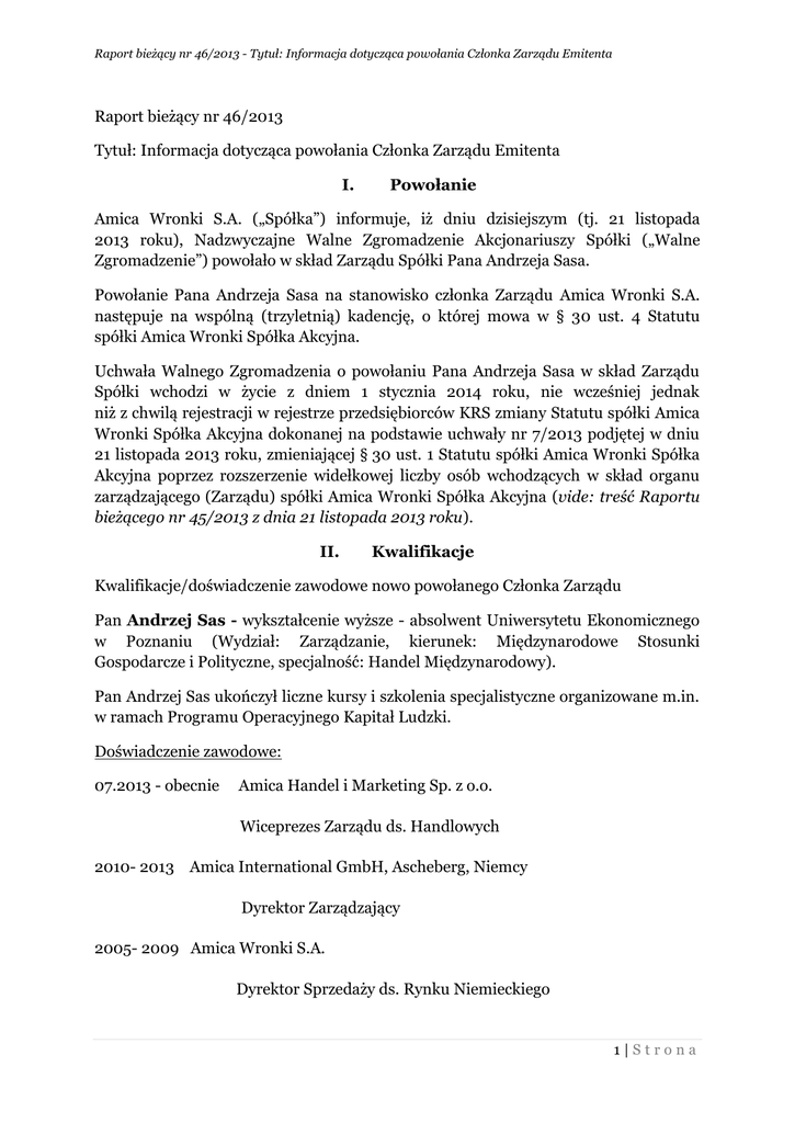 Raport bieżący nr 46/2013 - Tytuł: Informacja dotycząca powołania Członka Zarządu Emitenta Raport bieżący nr 46/2013 Tytuł: Informacja dotycząca powołania Członka Zarządu Emitenta I. Powołanie Amica Wronki S.A. („Spółka”) informuje, iż dniu dzisiejszym (tj. 21 listopada 2013 roku), Nadzwyczajne Walne Zgromadzenie Akcjonariuszy Spółki („Walne Zgromadzenie”) powołało w skład Zarządu Spółki Pana Andrzeja Sasa. Powołanie Pana Andrzeja Sasa na stanowisko członka Zarządu Amica Wronki S.A. następuje na wspólną (trzyletnią) kadencję, o której mowa w § 30 ust. 4 Statutu spółki Amica Wronki Spółka Akcyjna. Uchwała Walnego Zgromadzenia o powołaniu Pana Andrzeja Sasa w skład Zarządu Spółki wchodzi w życie z dniem 1 stycznia 2014 roku, nie wcześniej jednak niż z chwilą rejestracji w rejestrze przedsiębiorców KRS zmiany Statutu spółki Amica Wronki Spółka Akcyjna dokonanej na podstawie uchwały nr 7/2013 podjętej w dniu 21 listopada 2013 roku, zmieniającej § 30 ust. 1 Statutu spółki Amica Wronki Spółka Akcyjna poprzez rozszerzenie widełkowej liczby osób wchodzących w skład organu zarządzającego (Zarządu) spółki Amica Wronki Spółka Akcyjna (vide: treść Raportu bieżącego nr 45/2013 z dnia 21 listopada 2013 roku). II. Kwalifikacje Kwalifikacje/doświadczenie zawodowe nowo powołanego Członka Zarządu Pan Andrzej Sas - wykształcenie wyższe - absolwent Uniwersytetu Ekonomicznego w Poznaniu (Wydział: Zarządzanie, kierunek: Międzynarodowe Stosunki Gospodarcze i Polityczne, specjalność: Handel Międzynarodowy). Pan Andrzej Sas ukończył liczne kursy i szkolenia specjalistyczne organizowane m.in. w ramach Programu Operacyjnego Kapitał Ludzki. Doświadczenie zawodowe: 07.2013 - obecnie Amica Handel i Marketing Sp. z o.o. Wiceprezes Zarządu ds. Handlowych 2010- 2013 Amica International GmbH, Ascheberg, Niemcy Dyrektor Zarządzający 2005- 2009 Amica Wronki S.A. Dyrektor Sprzedaży ds. Rynku Niemieckiego 1|Strona Raport bieżący nr 46/2013 - Tytuł: Informacja dotycząca powołania Członka Zarządu Emitenta Regionalny Menedżer Sprzedaży Eksportowej 1998- 2004 Lafot, Jan Lalek, na stanowiskach: Dyrektor Zarządzający Kierownik Działu Handlowego [Pan Andrzej Sas nie jest wpisany do Rejestru Dłużników Niewypłacalnych (rejestru prowadzonego na podstawie Ustawy z dnia 20 sierpnia 1997 roku – o Krajowym Rejestrze Sądowym), oraz nie wykonuje działalności konkurencyjnej w stosunku do Spółki, nie jest wspólnikiem konkurencyjnej spółki cywilnej, osobowej, ani też nie jest członkiem organu konkurencyjnej spółki kapitałowej]. 2|Strona