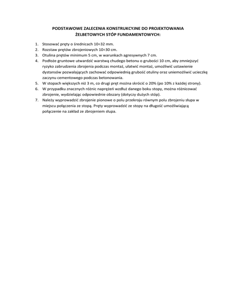 PODSTAWOWE ZALECENIA KONSTRUKCYJNE DO PROJEKTOWANIA ŻELBETOWYCH STÓP FUNDAMENTOWYCH: 1. 2. 3. 4. Stosować pręty o średnicach 10÷32 mm. Rozstaw prętów zbrojeniowych 10÷30 cm. Otulina prętów minimum 5 cm, w warunkach agresywnych 7 cm. Podłoże gruntowe utwardzić warstwą chudego betonu o grubości 10 cm, aby zmniejszyć ryzyko zabrudzenia zbrojenia podczas montaż, ułatwić montaż, umożliwić ustawienie dystansów pozwalających zachować odpowiednią grubość otuliny oraz uniemożliwić ucieczkę zaczynu cementowego podczas betonowania. 5. W stopach większych niż 3 m, co drugi pręt można skrócić o 20% (po 10% z każdej strony). 6. W przypadku znacznych różnic naprężeń wzdłuż danego boku stopy, można różnicować zbrojenie, wydzielając odpowiednie obszary (dotyczy dużych stóp). 7. Należy wyprowadzić zbrojenie pionowe o polu przekroju równym polu zbrojeniu słupa w miejscu połączenia ze stopą. Pręty wyprowadzić ze stopy na długość umożliwiającą połączenie na zakład ze zbrojeniem słupa.