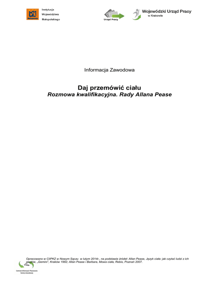 Informacja Zawodowa Daj przemówić ciału Rozmowa kwalifikacyjna. Rady Allana Pease Opracowano w CIiPKZ w Nowym Sączu w lutym 2014r., na podstawie źródeł: Allan Pease, Język ciała: jak czytać ludzi z ich gestów, „Gemini”, Kraków 1992; Allan Pease i Barbara, Mowa ciała, Rebis, Poznań 2007. DAJ PRZEMÓWIĆ CIAŁU Autor sprzedanej juŜ w ponad 33 mln egzemplarzy ksiąŜki „Język ciała” Allan Pease uwaŜa, Ŝe 60 – 80 procent procesu komunikowania się przebiega bez słów. Wykorzystał tę teorię zarówno w kreowaniu postaci do serialu „Sąsiedzi”, jak i w nauczaniu premierów odpowiednich gestów. Właśnie Pease jest obiektem szczególnej uwagi kadrowców podczas europejskich konferencji organizowanych w brytyjskim Harrogate przez Instytut ds. Kadr i Rozwoju. W wywiadzie dla „Sunday Timesa” Pease radził, jak zachować się, a przede wszystkim jak wyglądać podczas rozmowy kwalifikacyjnej. – Zaczyna się ona zanim usiądziemy, aby porozmawiać z przedstawicielem potencjalnego pracodawcy – uwaŜa Allan Pease. Wynika to stąd, Ŝe – jego zdaniem – w kierunku rozmówcy wysyłamy trzy rodzaje informacji niewerbalnych: sygnały stałe (np. płeć, wzrost, wiek), ozdoby (sposób, w jaki się ubieramy) i gesty. Oto główne zalecenia Pease`a. Wyczuj firmę Przygotowania do rozmowy zaleŜą od firmy, do której się wybierasz. Niestety, nie wolno zadzwonić do recepcjonistki po radę, jak się ubrać. Trzeba się zdać na własne wyczucie. Nie ma co jednak zmieniać stereotypów co do strojów przyjętych w danym miejscu – jeśli więc idziesz na rozmowę np. do firmy, która się zajmuje działalnością artystyczną, nie ubieraj się zbyt skromnie. Równaj krok W pobliŜu siedziby firmy – radzi Pease – bez względu na to, czy widzisz, Ŝe ktoś cię obserwuje, czy nie, staraj się kontrolować sposób chodzenia. Zdumiewające, jak często ludzie idący na rozmowę kwalifikacyjną trzęsą się, wyglądają na niezorganizowanych, wahających się. Gotuj prawicę W recepcji nie siadaj, nawet, gdy ci to zaproponują – gdy będziemy wstawać, aby się przywitać, nieodpowiednia pozycja przepony sprawi, Ŝe twój głos będzie brzmiał nienaturalnie. Poza tym odruchowo zaczniesz poprawiać ubranie, a to nie robi dobrego wraŜenia. Pamiętaj teŜ o noszeniu teczki czy torebki w lewej ręce, dzięki czemu prawica będzie wolna do przywitania i nie będzie spocona. Aby zaznaczyć, Ŝe spotkanie będzie przebiegało na zasadach „równy z równym”, dostosuj uścisk dłoni do mocy uścisku rozmówcy. Wejdź mocno Po wejściu siądź naprzeciw rozmówcy – ale nie twarzą w twarz, bo to sytuacja konfrontacji, która nie sprzyja rozmowie. Przesuń krzesło pod kątem 45 stopni do rozmówcy – wtedy konwersacja trwa dłuŜej. Widok dla ciebie Lepiej nie komentować rzeczy oczywistych. Jeśli uderzy cię piękny widok z okna, nie mów o tym głośno, bo jest bardzo prawdopodobne, Ŝe kaŜdy, kto tam wchodzi zaczyna od tego rozmowę. Twoje zachowanie straci więc unikatowy charakter. Wyjście smoka Równie waŜne jest wyjście. To pierwszy raz, gdy rozmówca zobaczy cię od tyłu – moŜe zwrócić uwagę na niedoprasowany strój, nie doczyszczone buty. Wyjdź spokojnie, stanowczo. Opracowano w CIiPKZ w Nowym Sączu w lutym 2014r., na podstawie źródeł: Allan Pease, Język ciała: jak czytać ludzi z ich gestów, „Gemini”, Kraków 1992; Allan Pease i Barbara, Mowa ciała, Rebis, Poznań 2007. Pewnie do toalety Jeśli nie wiesz, jak dostać się z powrotem do recepcji, wejdź pewnie do toalety. To lepsze niŜ wałęsanie się bez celu po korytarzu. I juŜ Według Pease`a zrobiłeś juŜ wszystko, co najwaŜniejsze. – Ciągle wierzę, Ŝe przeprowadzający rozmowę podejmuje decyzję w ciągu czterech pierwszych minut, gdy wysyłamy mu niewerbalne sygnały – uwaŜa autor „Języka ciała”. Zapamiętaj i skorzystaj! Opracowano w CIiPKZ w Nowym Sączu w lutym 2014r., na podstawie źródeł: Allan Pease, Język ciała: jak czytać ludzi z ich gestów, „Gemini”, Kraków 1992; Allan Pease i Barbara, Mowa ciała, Rebis, Poznań 2007.