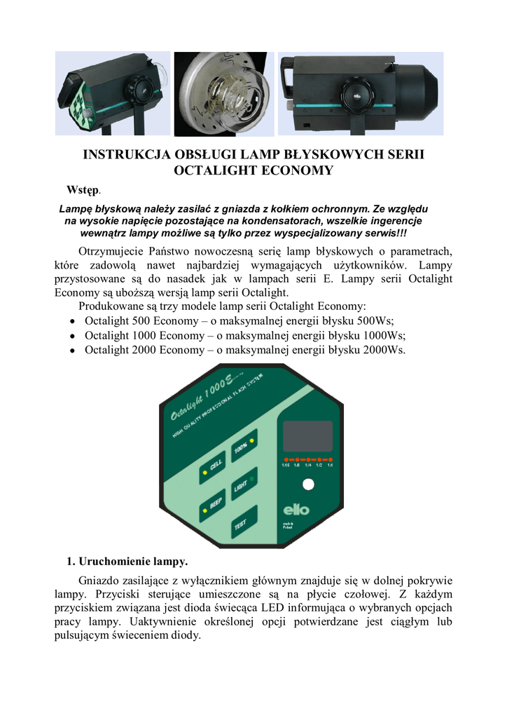 INSTRUKCJA OBSŁUGI LAMP BŁYSKOWYCH SERII OCTALIGHT ECONOMY Wstęp. Lampę błyskową należy zasilać z gniazda z kołkiem ochronnym. Ze względu na wysokie napięcie pozostające na kondensatorach, wszelkie ingerencje wewnątrz lampy możliwe są tylko przez wyspecjalizowany serwis!!! Otrzymujecie Państwo nowoczesną serię lamp błyskowych o parametrach, które zadowolą nawet najbardziej wymagających użytkowników. Lampy przystosowane są do nasadek jak w lampach serii E. Lampy serii Octalight Economy są uboższą wersją lamp serii Octalight. Produkowane są trzy modele lamp serii Octalight Economy: Octalight 500 Economy – o maksymalnej energii błysku 500Ws; Octalight 1000 Economy – o maksymalnej energii błysku 1000Ws; Octalight 2000 Economy – o maksymalnej energii błysku 2000Ws. 1. Uruchomienie lampy. Gniazdo zasilające z wyłącznikiem głównym znajduje się w dolnej pokrywie lampy. Przyciski sterujące umieszczone są na płycie czołowej. Z każdym przyciskiem związana jest dioda świecąca LED informująca o wybranych opcjach pracy lampy. Uaktywnienie określonej opcji potwierdzane jest ciągłym lub pulsującym świeceniem diody. 2. Funkcje lampy 2.1. Nastawianie energii błysku Regulacji energii błysku dokonuje się, pokrętłem umieszczonym na płycie czołowej. Ustawiona energia prezentowana jest na wyświetlaczu w postaci dwucyfrowej liczby w zakresie: od 4.0 do 8.0 w modelu Octalight 2000 Economy; od 3.0 do 7.0 w modelu Octalight 1000 Economy; od 2.0 do 6.0 w modelu Octalight 500 Economy. Energia podawana jest w jednostkach względnych z podziałem co 0,1 przysłony. Zmiana wyświetlanej wartości o 1,0 oznacza zmianę energii o przysłonę. Wyświetlanym mniejszym wartościom odpowiadają mniejsze wartości energii. Taki sposób określania energii zapewnia, że niezależnie od modelu nastawa energii np. 4.3 w dowolnej lampie serii Octalight opowiada tej samej bezwzględnej energii błysku. Wyświetlacz świeci pulsującym światłem w czasie ładowania lub rozładowywania lampy. Gotowość do błysku sygnalizowana jest ciągłym świeceniem wyświetlacza. Ustawiona energia prezentowana jest również na linijkowym wyświetlaczu (10 diod LED), który łatwo pozwala zorientować się w jakim obszarze energii lampy aktualnie się poruszamy. Zwiększaniu energii towarzyszy wydłużanie świecącej części linijki. W celu łatwiejszej orientacji elementy linijki stanowią okrągłe i prostokątne elementy umieszczone na przemian. 2.2. Oświetlenie modelujące Ze sterowaniem światłem modelującym związane są trzy przyciski i odpowiadające im diody świecące LED oznaczone: 100%, LIGHT. Przycisk LIGHT. Przycisk LIGHT jest przyciskiem trójfunkcyjnym, tzn. kolejne naciśnięcia powodują cykliczne wybranie jednego z trzech trybów oświetlenia modelującego. Każdy tryb sygnalizowany jest za pomocą zielonej diody LED. W pozycji wyłączonej, dioda nie świeci i światło modelujące jest wyłączone. W następnym trybie świeci się zielona dioda, lampa modelująca jest włączona i nie gaśnie po błysku. Po kolejnym naciśnięciu pulsuje dioda zielona, lampa modelująca jest włączona i gaśnie po błysku na czas ładowania. Kolejne naciśnięcie powoduje powrót do pozycji wyłączonej. Przycisk 100%. Przycisk 100% jest przyciskiem trójfunkcyjnym, który działa tylko przy włączonym przycisku LIGHT. Każda funkcja sygnalizowana jest za pomocą żółtej diody LED. Gdy dioda nie świeci wartość światła pilotującego jest proporcjonalna do wartości energii błysku. Naciśnięcie przycisku umożliwia załączenie żarówki modelującej na maksymalną wartość co sygnalizowane jest świeceniem diody. Kolejne naciśnięcie przycisku powoduje przejście do stanu skorygowanej wartości maksymalnej żarówki modelującej, co sygnalizuje pulsująca żółta dioda świecąca. Wartość skorygowaną ustawia się następująco: dłuższe przytrzymanie przycisku 100% powoduje przejście do stanu, w którym zgaśnie wyświetlacz, a świeci się linijka. Pokręcając pokrętłem wybieramy żądaną wartość świecenia żarówki. Zmiany nastawy można dokonać w ciągu 3 sekund. Po tym czasie następuje wyjście ze stanu ustawiania i przejście do opcji pracy z pilotem o skorygowanej wartości maksymalnej. 2.3. Sterowanie fotokomórką Przycisk CELL jest przyciskiem dwufunkcyjnym tzn. kolejne naciśnięcia powodują cykliczne wybranie jednego z dwóch trybów pracy fotokomórki. Fotokomórka może znajdować się w następujących stanach: wyłączona, dioda przy przycisku CELL nie świeci się; włączona, dioda przy przycisku CELL świeci się na żółto. 2.4. Sygnalizacja dźwiękowa Przycisk BEEP jest przyciskiem trój funkcyjnym tzn. kolejne naciśnięcia powodują cykliczne wybranie jednego z trzech trybów pracy sygnalizacji dźwiękowej. Każdy tryb sygnalizowany jest za pomocą żółtej diody LED. Pierwsze naciśnięcie sygnalizowane świeceniem diody w sposób ciągły, spowoduje że każdemu przyciśnięciu dowolnego przycisku klawiatury towarzyszyć będzie krótki sygnał dźwiękowy. Po każdym naładowaniu lampy usłyszymy dłuższy sygnał dźwiękowy. Przy powtórnym naciśnięciu przycisku BEEP (dioda pulsuje) lampa będzie dodatkowo informować o ładowaniu przerywanym dźwiękiem. Sygnalizację dźwiękową można wyłączyć, wówczas dioda nie będzie świecić. 3. Sygnalizacja awaryjna. Lampa posiada rozbudowany wewnętrzny system zabezpieczeń. Na wyświetlaczu mogą pojawić dwie sygnalizacje nieprawidłowej pracy lampy: Er – nastąpiło wewnętrzne uszkodzenie głównych obwodów lampy lub zakłócona została praca mikroprocesorów. Można lampę wyłączyć i ponownie załączyć po kilku minutach. Jeżeli objaw ustąpił to możemy kontynuować pracę. Jeżeli nie lampę trzeba oddać do serwisu; Of – nastąpiło przegrzanie lampy w wyniku intensywnej eksploatacji lub przy pracy w szczególnie trudnych warunkach. Po osty