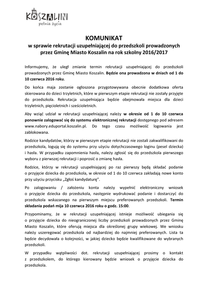 KOMUNIKAT w sprawie rekrutacji uzupełniającej do przedszkoli prowadzonych przez Gminę Miasto Koszalin na rok szkolny 2016/2017 Informujemy, że uległ zmianie termin rekrutacji uzupełniającej do przedszkoli prowadzonych przez Gminę Miasto Koszalin. Będzie ona prowadzona w dniach od 1 do 10 czerwca 2016 roku. Do końca maja zostanie ogłoszona przygotowywana obecnie dodatkowa oferta skierowana do dzieci trzyletnich, które w pierwszym etapie rekrutacji nie zostały przyjęte do przedszkola. Rekrutacja uzupełniająca będzie obejmowała miejsca dla dzieci trzyletnich, pięcioletnich i sześcioletnich. Aby wziąć udział w rekrutacji uzupełniającej należy w okresie od 1 do 10 czerwca ponownie zalogować się do systemu elektronicznej rekrutacji dostępnego pod adresem www.nabory.eduportal.koszalin.pl. Do tego czasu możliwość logowania jest zablokowana. Rodzice kandydatów, którzy w pierwszym etapie rekrutacji nie zostali zakwalifikowani do przedszkola, logują się do systemu przy użyciu dotychczasowego loginu (pesel dziecka) i hasła. W przypadku zapomnienia hasła, należy zgłosić się do przedszkola pierwszego wyboru z pierwszej rekrutacji i poprosić o zmianę hasła. Rodzice, którzy w rekrutacji uzupełniającej po raz pierwszy będą składać podanie o przyjęcie dziecka do przedszkola, w okresie od 1 do 10 czerwca zakładają nowe konto przy użyciu przycisku „Zgłoś kandydaturę”. Po zalogowaniu / założeniu konta należy wypełnić elektroniczny wniosek o przyjęcie dziecka do przedszkola, następnie wydrukować podanie i dostarczyć do przedszkola wskazanego na pierwszym miejscu preferowanych przedszkoli. Termin składania podań mija 10 czerwca 2016 roku o godz. 15:00. Przypominamy, że w rekrutacji uzupełniającej istnieje możliwość ubiegania się o przyjęcie dziecka do nieograniczonej liczby przedszkoli prowadzonych przez Gminę Miasto Koszalin, które oferują miejsca dla określonej grupy wiekowej. We wniosku należy uszeregować przedszkola od najbardziej do najmniej preferowanych. Lista ta będzie decydowała o kolejności, w jakiej dziecko będzie kwalifikowane do wybranych przedszkoli. W przypadku wątpliwości dot. rekrutacji uzupełniającej prosimy o kontakt z przedszkolem, do którego kierowany będzie wniosek o przyjęcie dziecka do przedszkola.