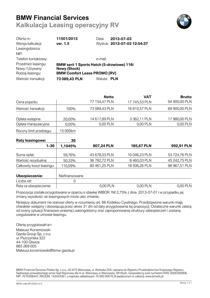 BMW Financial Services Kalkulacja Leasing operacyjny RV Oferta nr: Wersja kalkulacji: Leasingobiorca: NIP: Telefon kontaktowy: Przedmiot leasingu: Nowy / Używany: Rodzaj leasingu: 11501/2013 ver. 1.5 Wartość transakcji: 73 089,43 PLN Data: 2013-07-03 Wydruk: 2013-07-03 12:54:37 e-mail: BMW serii 1 Sports Hatch (5-drzwiowe) 116i Nowy (Stock) BMW Comfort Lease PROMO [RV] Waluta: PLN Netto 77 154,47 PLN VAT 17 745,53 PLN Brutto 94 900,00 PLN 100% 73 089,43 PLN 16 810,57 PLN 89 900,00 PLN 20,00% 0,00% 14 617,89 PLN 0,00 PLN 3 362,11 PLN 0,00 PLN 17 980,00 PLN 0,00 PLN 1,1045% 807,24 PLN 185,67 PLN 992,91 PLN Suma opłat: 59,76% 43 678,53 PLN 10 046,23 PLN 53 724,76 PLN Wartość rezydualna: 50,33% 36 782,72 PLN 8 460,03 PLN 45 242,75 PLN 110,09% 80 461,25 PLN 18 506,26 PLN 98 967,51 PLN 0,00 PLN 0,00 PLN 0,00 PLN Cena pojazdu: Wartość transakcji: Opłata wstępna: Opłata manipulacyjna: Roczny limit przebiegu: Raty leasingowe: 15 000km 36 1-36 Całkowity koszt leasingu: Ubezpieczenie: Liczba rat: Rata za ubezpieczenie: Niefinansowane 0 Propozycja została przygotowana w oparciu o stawkę WIBOR 1M 2,75% z dnia 2013-07-01 i w przypadku jej zmiany wysokość rat leasingowych może ulec zmianie. Niniejszy dokument nie stanowi oferty w rozumieniu art. 66 Kodeksu Cywilnego. Przedstawione warunki mają charakter wstępny i obowiązują przez okres 31 dni od daty przygotowania tej propozycji. Ostateczne warunki zależą od oceny sytuacji finansowo-prawnej Leasingobiorcy oraz zaproponowanej struktury zabezpieczeń i zostaną uregulowane w umowie leasingu. Ofertę przygotował<a>: Mateusz Korzeniowski Gazda Group Sp. z o.o. ul. Pszczyńska 322 44-100 Gliwice 885 269 005 [email protected] BMW Financial Services Polska Sp. z o.o., 02-675 Warszawa, ul. Wołoska 22A, wpisana do Rejestru Przedsiębiorców Krajowego Rejestru Sądowego prowadzonego przez Sąd Rejonowy dla m.st. Warszawy w Warszawie, XIII Wydz. Gospodarczy pod numerem KRS: 0000392806, NIP: 7010308447, REGON: 143424261, o kapitale zakładowym 10 000 000 PLN (wpłaconym w całości). www.bmwfs.pl DRUK: webLSP (2320 v4.1) Strona 1 z 1