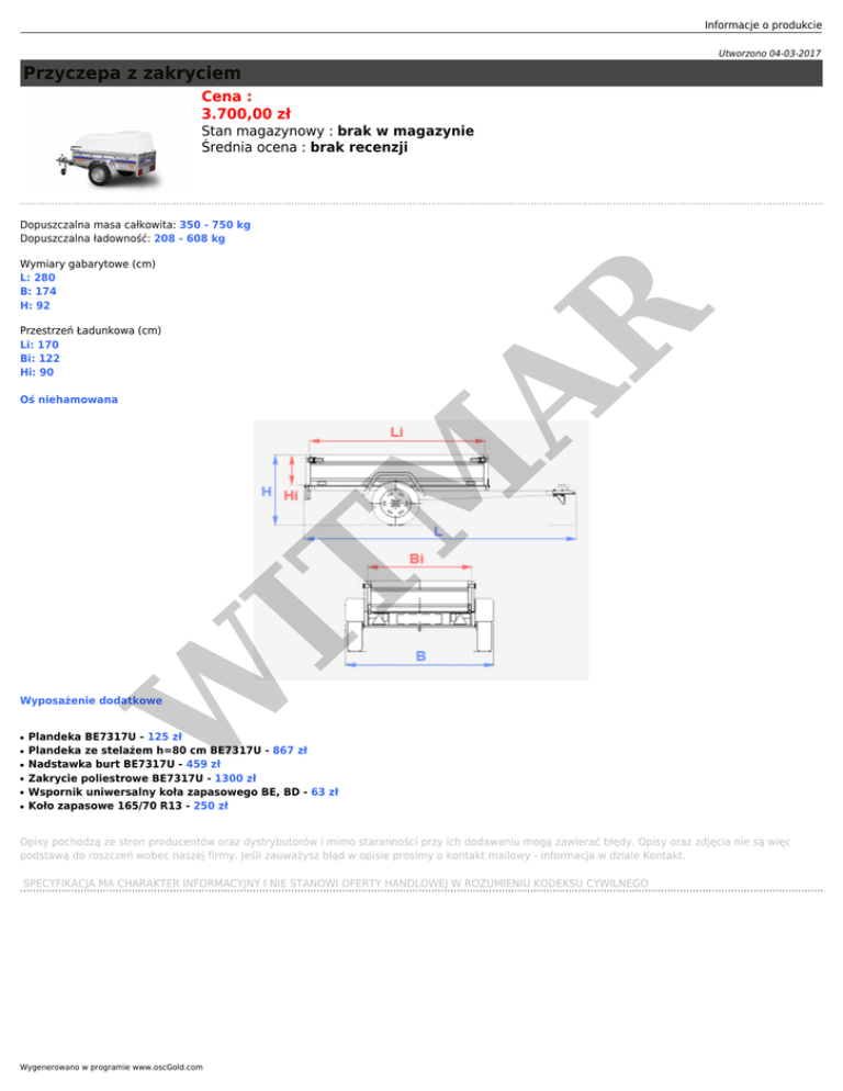 Informacje o produkcie Utworzono 04-03-2017 Przyczepa z zakryciem Cena : 3.700,00 zł Stan magazynowy : brak w magazynie Średnia ocena : brak recenzji Dopuszczalna masa całkowita: 350 - 750 kg Dopuszczalna ładowność: 208 - 608 kg AR Wymiary gabarytowe (cm) L: 280 B: 174 H: 92 Przestrzeń Ładunkowa (cm) Li: 170 Bi: 122 Hi: 90 W IT M Oś niehamowana Wyposażenie dodatkowe ● ● ● ● ● ● Plandeka BE7317U - 125 zł Plandeka ze stelażem h=80 cm BE7317U - 867 zł Nadstawka burt BE7317U - 459 zł Zakrycie poliestrowe BE7317U - 1300 zł Wspornik uniwersalny koła zapasowego BE, BD - 63 zł Koło zapasowe 165/70 R13 - 250 zł Opisy pochodzą ze stron producentów oraz dystrybutorów i mimo staranności przy ich dodawaniu mogą zawierać błędy. Opisy oraz zdjęcia nie są więc podstawą do roszczeń wobec naszej firmy. Jeśli zauważysz błąd w opisie prosimy o kontakt mailowy - informacja w dziale Kontakt. SPECYFIKACJA MA CHARAKTER INFORMACYJNY I NIE STANOWI OFERTY HANDLOWEJ W ROZUMIENIU KODEKSU CYWILNEGO Wygenerowano w programie www.oscGold.com