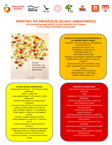 POMYSŁY NA PROMOCJĘ SZLAKU JABŁKOWEGO WYGENEROWANIE PRZEZ UCZESTNIKÓW SPOTKANIA 27 STYCZNIA DWOREK NA DŁUGIEJ Drzewo Pomysłów – na promocję Szlaku Jabłkowego W SIECI SZLAKU JABŁKOWEGO -lokale gastronomiczne – informacje o szlaku jabłkowym -piknik – jabłko fest -słupy ogłoszeniowe – informacje o szlaku jabłkowym -namiot informacyjny na miejscowych imprezach -promocja indywidualna / prywatnych osób -tablice o Szlaku Jabłkowym kody QR -mała naklejka z logo Sz.J. na produktach -folder ogólny + ulotki na poszczególne punkty -znaczek i magnes zakup w punkcie -torby ekologiczne z logo Szl.J. z adresem strony -cykliczne spotkania z informacjami w skrzynce -paszport turystyczny zdobywanie pieczątek -informacje słowne w danych punktach/ informacja o innych członkach sieci -instytucje na szlaku – muzeum informacje o szlaku -możliwość zakupu różnych produktów POMYSŁY NA PROMOCJĘ WEWNĘTRZNĄ TJ. NA TERENIE GMINY WARKA -produkty z adresem www np. soki jabłkowe -stacja PKP tabl. Inf. -Klodnaik hotel ulotki + inf. -PODZAMCZE ulotki tab. Inf. -SIELANKA tablice inf. -CESiR BASEN informacja -Naklejki na samochody I (jabłuszko) WARKA -KAJAKI tablice informacyjne o szlaku np. przystań -Zaproszenia do gmin sąsiednich szkoły -logo z odsyłaczem na stronach inst. Pub. Szkoły - TV WARKA film promocyjny -URZĄD MIASTA – informacja -ZAMEK CZERSK tablice inf. PROMOCJA ZEWNĘTRZNA -informacje turystyczne przy trasie S7 (tabliczki) -radio -współpraca z dużymi firmami (piekarnia, WARWIN) -telewizja programy poranne, kulinarne -prasa branżowa kurator -stworzenie ofert dla szkół (jednodniowych kilkudniowych) -festyny festiwal jabłka -targi turystyczne -promocja plotkarska sensacja - Facebook -wzajemna promocja ( sieciowanie) np. Kraina Rzeki Jeziorki -promocja internetowa znajomi na zew. Facebook -promocja w miejscach turystycznych wokół warki -informacje turystyczne (ulotki) na stacjach benzynowych -biura turystyczne (ulotki)