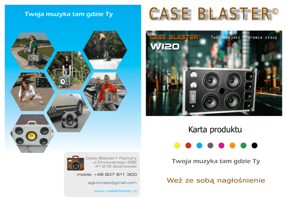 Twoja muzyka tam gdzie Ty © CASE BLASTER Karta produktu Case Blaster © Factory ul.Dmowskiego 28E 41-219 Sosnowiec mobile: +48 607 611 300 [email protected] www.caseblaster.pl Twoja muzyka tam gdzie Ty Weź ze sobą nagłośnienie © CASE BLASTER waga 15kg moc wzmacniacza 40W moc muzyczna 240W analogowy UV METER DANE TECHNICZNE W120 regulacja barwy dźwięku 8 głośników 16 godzin pracy przy pełnym naładowaniu akumulatora wskaźnik wysterowania UV METER regulacja głośności barwa dźwięku gniazdo ładowania wejście audio