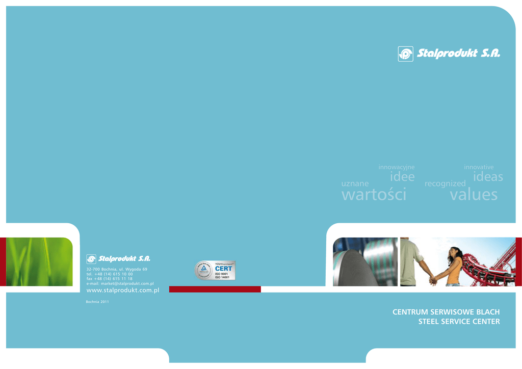 innowacyjne uznane idee wartości innovative recognized ideas values 32-700 Bochnia, ul. Wygoda 69 tel. +48 (14) 615 10 00 fax +48 (14) 615 11 18 e-mail: [email protected] www.stalprodukt.com.pl Bochnia 2011 CENTRUM SERWISOWE BLACH STEEL SERVICE CENTER CENTRUM SERWISOWE BLACH / STEEL SERVICE CENTER innowacyjne uznane idee wartości innovative recognized ideas values Stale nastawieni na innowacje, dbamy jednocześnie o zachowanie tradycyjnych wartości. Constantly focused on innovations we take care simultaneously for preserving traditional values. 1 Stalprodukt to doświadczony i sprawdzony partner w biznesie. Nasza wykwalifikowana kadra, jej wiedza oraz wykorzystywanie nowoczesnych technologii stanowią gwarancję najwyższej jakości produktów oraz świadczonych usług. Stalprodukt is an experienced and reliable partner in business. Our qualified staff, their knowledge and application of modern technology guarantees the highest quality of products and services rendered. Jesteśmy wiodącym producentem i eksporterem wysoko przetworzonych wyrobów ze stali: blach elektrotechnicznych transformatorowych, kształtowników giętych na zimno, barier drogowych i rdzeni toroidalnych. Nasza Spółka posiada też własną, rozwiniętą sieć dystrybucji wyrobów hutniczych. Tworzą ją składy handlowe i biura w kilkunastu miastach na terenie Polski. We are a leading manufacturer and exporter of highly processed steel products: grain oriented electical steels, cold formed profiles, road safety barriers and toroidal cores. Moreover, our company has a developed distribution network of metallurgical products. It comprises of commercial warehouses and offices in several cities in the territory of Poland. Od 1997 r. akcje Stalproduktu notowane są na rynku podstawowym Giełdy Papierów Wartościowych w Warszawie i dzięki temu informacja o kondycji finansowej Spółki jest transparentna i dostępna. Shares of Stalprodukt have been quoted on the primary market of the Warsaw Stock Exchange since 1997 and therefore the information on financial standing of the Company is transparent and available. Stalprodukt S.A. posiada certyfikaty: Systemu Zarządzania Jakością ISO 9001 oraz Systemu Zarządzania Środowiskowego ISO 14001, wydane przez TÜV CERT Rheinland. Stalprodukt S.A. was granted the following certificates: ISO 9001 Quality Management System and ISO 14001 Environmental Management System, issued by TÜV CERT Rheinland. Naszą misją jest wspieranie rozwoju naszych Klientów poprzez zapewnienie najwyższej jakości produktów i usług. Dążymy do uzyskania pozycji preferowanego dostawcy i zaufanego partnera biznesowego naszych Klientów. Oferta centrum serwisowego obejmuje blachy zimnowalcowane oraz gorącowalcowane w krążkach, arkuszach i taśmach ciętych. Our mission is to support our Clients’ development through assurance of the highest quality products and services. We strive to achieve the position of a preferred supplier and trusted business partner of our clients. Steel Service Center offers cold and hot rolled coils, sheets and strips. 2 CENTRUM SERWISOWE BLACH / STEEL SERVICE CENTER innowacyjne tradycyjne idee wartości innovative traditional ideas values ZASTOSOWANIA I KORZYŚCI / APPLICATION AND BENEFITS Blachy walcowane na gorąco i blachy walcowane na zimno w arkuszach, taśmach i krążkach Hot-rolled steel and cold-rolled steel in form of sheets, strips and coils Zastosowanie: Application: Blachy walcowane na gorąco i blachy walcowane na zimno w arkuszach, taśmach i krążkach znajdują nieograniczone zastosowanie we wszystkich konstrukcjach budowlanych i maszynowych. Przykłady: Hot-rolled steel and cold-rolled steel in form of sheets, strips and coils are widely used in all building and machine structures. Examples: • • • • • • • • • • • • • • • • • • • • pojemniki metalowe, kontenery maszyny rolnicze i leśne obudowy metalowe zbiorniki ciśnieniowe kanały wentylacyjne meble znaki drogowe kotły, piece naczepy, przyczepy konstrukcje budowlane Metal tanks, containers Agricultural and forest machines Metal enclosures Pressure tanks Ventilating ducts Furniture Road signs Boilers, furnaces Semitrailers, trailers Building structures Korzyści: Benefits: • Dla blach arkuszowych posiadamy możliwość pocięcia najbardziej odpowiedniego gatunku stali. Oferujemy blachy wykonane z wielu gatunków stali, począwszy od stali zwykłej jakości (S235), poprzez stale o podwyższonej wytrzymałości (S355), do stali o wysokiej wytrzymałości (do S700 włącznie, dla grubości blachy Ł 5 mm i maksymalnej granicy na rozciąganie Rm = 1000 N/mm2). • Dla taśm i krążków posiadamy możliwość pocięcia stali począwszy od stali zwykłej jakości (S235), aż do stali o podwyższonej wytrzymałości (S355). • Bardzo szeroki zakres asortymentowy zarówno pod względem szerokości, długości, jak i grubości taśmy. • Gwarancja jakości i dokładności wykonania, przekraczająca nawet wymagania norm (zawężone tolerancje). • Wysoka jakość powierzchni uzyskana w procesie szczotkowania oraz znacząca redukcja naprężeń sprężystych materiału powoduje, iż arkusze blach mogą być wykorzystywane do cięcia laserowego, plazmowego, jak również cięcia wodą. • Zastosowanie materiałów o wysokiej wytrzymałości umożliwia projektowanie znacznie lżejszych konstrukcji w porównaniu z dotychczas stosowanymi materiałami. Zależność przedstawiającą zmianę grubości materiałów o wysokiej wytrzymałości w stosunku do stali niskostopowych, przy zachowaniu tych samych parametrów wytrzymałościowych, przedstawia się następująco: • We are able to cut sheets of the most suitable grade of steel. We offer sheets made of many grades of steel, beginning with steel in regular quality (S235), through steel with increased resistance (S355), up to highresistance steel (up to S700 inclusively, for thickness of sheet Ł 5 mm and maximum 
