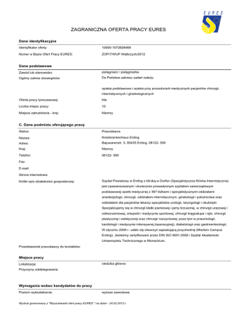 ZAGRANICZNA OFERTA PRACY EURES Dane identyfikacyjne Identyfikator oferty: 10000-1072828468 Numer w Bazie Ofert Pracy EURES: ZOP/7/WUP Wałbrzych/2012 Dane podstawowe Zawód lub stanowisko: pielęgniarz / pielęgniarka Ogólny zakres obowiązków: Do Państwa zakresu zadań należy: opieka podstawowa i opieka przy procedurach medycznych pacjentów chirurgii, internistycznych i ginekologicznych Oferta pracy tymczasowej: Nie Liczba miejsc pracy: 10 Miejsce zatrudnienia - kraj: Niemcy C. Dane podmiotu oferującego pracę Status: Pracodawca Nazwa: Kreiskrankenhaus Erding Adres: Bajuwarenstr. 5, 85435 Erding, 08122- 590 Kraj: Niemcy Telefon: 08122- 590 Fax: E-mail: Strona internetowa: Krótki opis działalności gospodarczej: Szpital Powiatowy w Erding z kliniką w Dorfen (Specjalistyczna Klinika Internistyczna) jest zaawansowanym i skutecznie prowadzonym szpitalem samorządowym podstawowej opieki medycznej z 367 łóżkami i specjalistycznymi oddziałami anestezjologii, chirurgii, oddziałem internistycznym, ginekologii i położnictwa oraz oddziałami dla pacjentów lekarzy specjalistów urologii, laryngologii i okulistyki. Specjalizujemy się w chirurgii klatki piersiowej i jamy brzusznej, w chirurgii urazowej i odtworzeniowej, ortopedii i medycynie sportowej, chirurgii kręgosłupa i ręki, chirurgii plastycznej i estetycznej oraz chirurgii naczyniowej; poza tym w pneumologii, kardiologii i medycynie intensywnej (operacyjnej), diabetologii oraz gastroenterologii. W styczniu 2009 r. udało się otworzyć sąsiadującą przychodnię (Medizin Campus Erding). Jesteśmy certyfikowani przez DIN ISO 9001:2008 i Szpital Akademicki Uniwersytetu Technicznego w Monachium. Przedstawiciel pracodawcy do kontaktów: Miejsce pracy Lokalizacja: siedziba główna Przyczyny oddelegowania: Wymagania wobec kandydatów do pracy Poziom wykształcenia: wyższe zawodowe Wydruk generowany z "Wyszukiwarki ofert pracy EURES " na dzień - 24.02.2012 r. Doświadczenie zawodowe: Min 3 letnie Wykształcenie pielęgniarskie - Wedle możliwości z doświadczeniem zawodowym, chętnie także początkujący w zawodzie. - doświadczenia w nadzorowaniu i pielęgnacji pacjentów lub gotowości do nabycia tego doświadczenia od naszych doświadczonych instruktorów Znajomość języków: niemiecki - poziom zadowalający - Uprawnienia/ dyplomy/ dokumenty: Umiejętności: Inne istotne wymagania: Wynagrodzenia i warunki zatrudnienia Gwarantowane wynagrodzenie brutto: 1845.00 Wynagrodzenie netto: - Waluta: euro System wynagradzania - rodzaj stawki stawka miesięczna Premie: Tak Dodatkowe świadczenia: zakwaterowanie – pracodawca zapewnia na własny koszt Rodzaj umowy: umowa o pracę Wymiar czasu pracy: praca na pełen etat Okres zatrudnienia - czas trwania umowy: nieokreślony Data wygaśnięcia umowy: - Rozkład czasu pracy - liczba godzin tygodniowo: 38 System czasu pracy - zmiany i praca w dni wolne: Data rozpoczęcia pracy: - Inne informacje: Sposób składania aplikacji Wymagane dokumenty: List motywacyjny, życiorys, dyplom, świadectwa pracy, zdjęcie Język składania dokumentów: niemiecki Do kogo należy wysłać dokumenty: do doradcy EURES z WUP Gdzie należy wysłać dokumenty: Anna Koza Dane teleadresowe: Dolnośląski Wojewódzki Urząd Pracy, Filia we Wrocławiu Al. Armii Krajowej 54 50-541 Wrocław lub na adres email: [email protected] Dodatkowe informacje Oferujemy: odpowiedzialne i wielostronne zadanie w zaangażowanym i zmotywowanym zespole, nowoczesne miejsce pracy z możliwością wewnętrznego i zewnętrznego szkolenia i doskonalenia zawodowego, Wydruk generowany z "Wyszukiwarki ofert pracy EURES " na dzień - 24.02.2012 r. wynagrodzenie adekwatne do zaangażowania, zgodne z porozumieniem zakładowym opierającym się na układzie zbiorowym pracy sektora publicznego (TVöD-K), bezskładkowy dodatkowy plan emerytalny (dodatkowe zaopatrzenie emerytalne Bayerische Versorgungskammer), różne możliwości dodatkowego zakładowego zaopatrzenia emerytalnego poprzez potrącanie części wynagrodzenia, atrakcyjna cenowo możliwość zakwaterowania w naszym internacie dla personelu, w Erding – mieście o wysokich walorach rekreacyjnych (największe termy w Europie, bliskość gór, jeziora w bliskiej okolicy) i dobrym skomunikowaniu (35 minut kolejką podmiejską (S-Bahn) do Monachium, 15 min. na lotnisko), wsparcie przy załatwianiu spraw urzędowych, poszukiwaniu mieszkania, etc. atrakcyjny pakiet powitalny Data publikacji: 2012-01-10 Data ważności oferty: 2012-04-10 Uprzejmie informujemy, że skontaktujemy się wyłącznie z wybranymi kandydatami. Uwaga: 1. Umowa z zagranicznym pracodawcą jest zawierana, co do zasady, zgodnie z prawem kraju zatrudnienia. Oznacza to, że wszystkie roszczenia odnośnie do warunków, które obejmuje umowa, można kierować wyłącznie do odpowiedniego sądu w kraju zatrudnienia. Publiczne służby zatrudnienia (EURES) nie mogą pośredniczyć ani reprezentować pracownika w sądzie kraju zatrudnienia w przypadku sporu z pracodawcą. 2. Publiczne służby zatrudnienia (EURES) dokładają wszelkich starań, aby zapewnić rzetelność i wiarygodność ofert pracy zgłoszonych w lokalnym urzędzie pracy. Należy wyjaśnić, że oferta pracy została zgłoszona przez stronę trzecią i EURES nie odpowiada za ewentualne rozbieżności między warunkami pracy określonymi w ofercie pracy i warunkami oferowanymi przez potencjalnego pracodawcę. 3. Publiczne służby zatrudnienia (EURES) informują, że będą zbierać, przetwarzać i przekazywać potencjalnym pracodawcom zgodnie z przepisami dotyczącymi ochrony danych osobowych wszystkie dane osobowe dostarczone przez osoby poszukujące pracy. Wydruk generowany z "Wyszukiwarki ofert pracy EURES " na dzień - 24.02.2012 r.