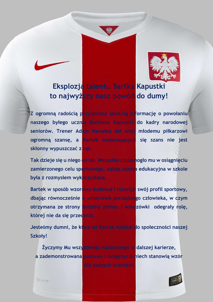 Eksplozja talentu Bartka Kapustki to najwyższy nasz powód do dumy! Z ogromną radością przyjęliśmy jesienią informację o powołaniu naszego byłego ucznia Bartosza Kapustki do kadry narodowej seniorów. Trener Adam Nawałka dał więc młodemu piłkarzowi ogromną szansę, a Bartek nadarzających się szans nie jest skłonny wypuszczać z rąk. Tak dzieje się u niego od lat. Wszystko co pomogło mu w osiągnięciu zamierzonego celu sportowego, każda szansa edukacyjna w szkole była z rozmysłem wykorzystana. Bartek w sposób wzorowy budował i rozwijał swój profil sportowy, dbając równocześnie o wizerunek porządnego człowieka, w czym otrzymana ze strony Rodziny pomoc i wskazówki odegrały rolę, której nie da się przecenić. Jesteśmy dumni, że kilka lat Bartek należał do społeczności naszej Szkoły! Życzymy Mu wszystkiego najlepszego w dalszej karierze, a zademonstrowana postawa i osiągnięcia niech stanowią wzór dla naszych uczniów!