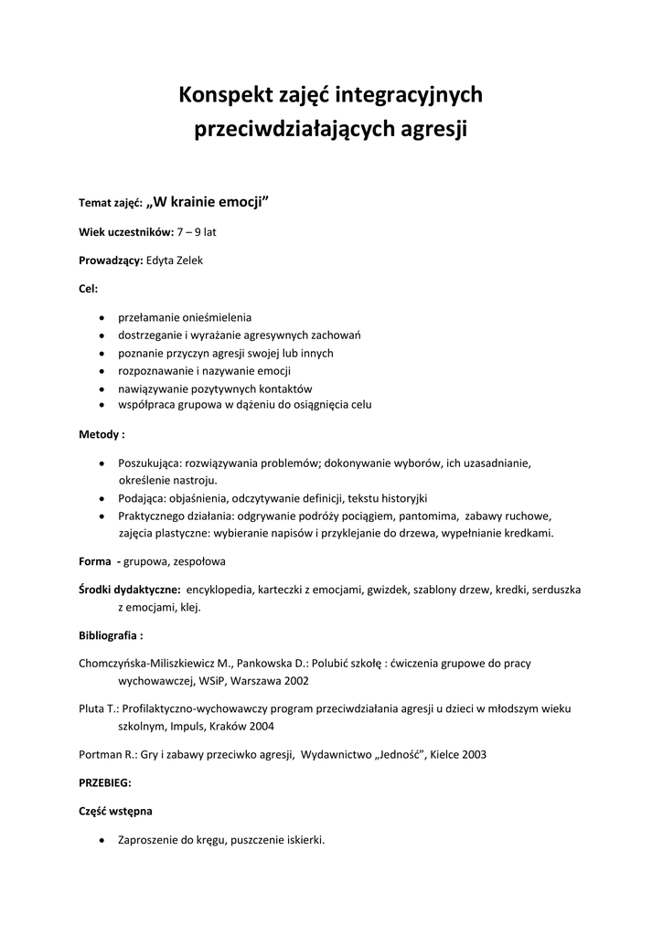 Konspekt zajęć integracyjnych przeciwdziałających agresji Temat zajęć: „W krainie emocji” Wiek uczestników: 7 – 9 lat Prowadzący: Edyta Zelek Cel: przełamanie onieśmielenia dostrzeganie i wyrażanie agresywnych zachowań poznanie przyczyn agresji swojej lub innych rozpoznawanie i nazywanie emocji nawiązywanie pozytywnych kontaktów współpraca grupowa w dążeniu do osiągnięcia celu Metody : Poszukująca: rozwiązywania problemów; dokonywanie wyborów, ich uzasadnianie, określenie nastroju. Podająca: objaśnienia, odczytywanie definicji, tekstu historyjki Praktycznego działania: odgrywanie podróży pociągiem, pantomima, zabawy ruchowe, zajęcia plastyczne: wybieranie napisów i przyklejanie do drzewa, wypełnianie kredkami. Forma - grupowa, zespołowa Środki dydaktyczne: encyklopedia, karteczki z emocjami, gwizdek, szablony drzew, kredki, serduszka z emocjami, klej. Bibliografia : Chomczyńska-Miliszkiewicz M., Pankowska D.: Polubić szkołę : ćwiczenia grupowe do pracy wychowawczej, WSiP, Warszawa 2002 Pluta T.: Profilaktyczno-wychowawczy program przeciwdziałania agresji u dzieci w młodszym wieku szkolnym, Impuls, Kraków 2004 Portman R.: Gry i zabawy przeciwko agresji, Wydawnictwo „Jedność”, Kielce 2003 PRZEBIEG: Część wstępna Zaproszenie do kręgu, puszczenie iskierki. - Zabawa „Powitanie” – uczestnicy siedzą. Prowadzący podaje hasła, a uczniowie, których dotyczy podane kryterium wstają (mogą wykonywać przy tym zabawne gesty), np. Witam wszystkich, którzy: Noszą okulary Mają na sobie coś białego Jedli jogurt na śniadanie Mają braciszka Po kilku poleceniach uczniowie mogą przejmować rolę prowadzącego Część główna: Zabawa – „Wściekłe początki zdania” Dzieci mają za zadanie dokończyć rozpoczęte przez prowadzącego zdania, np.: - Kiedy jestem wściekły, wtedy… Mój kolega złości mnie, gdy… Najbardziej złości mnie, gdy… Kiedy inne dzieci mnie złoszczą, to… Ciągle muszę… Mój tata mówi: kiedy inni mnie denerwują, wtedy… Moja mama mówi: kiedy inni mnie denerwują, wtedy… Kiedy inni są rozzłoszczeni, wtedy… Rozmowa kierowana, porównywanie dokończonych zdań, omawianie przez grupę, szukanie rozwiązań. Wspólne zastanowienie się nad tym: - na kogo najczęściej się złoszczę ? co lub kto mnie najczęściej złości i w jakich sytuacjach? jak wyrażam swoją złość? (rozróżnienie agresji słownej, fizycznej, psychicznej) czy można krzywdzić siebie samego? ( autoagresja) co mi daje złość? Po co się złoszczę? Wyszukanie w encyklopedii terminu „agresja” – wspólne odczytanie definicji Zabawa – „Mowa ciała” (pantomima) Każde dziecko otrzymuje karteczkę, na której zapisany został jakiś stan emocjonalny – wystraszony, obrażony, wściekły, delikatny, wesoły, smutny itd. – który musi pokazać. Kartki z poszczególnymi emocjami mogą zostać rozdane w kilku jednakowych egzemplarzach, aby cała grupa uczestniczyła w zabawie. Po każdej demonstracji dzieci próbują odgadnąć, jakie uczucie miało zostać wyrażone. Na koniec we wspólnej rozmowie dyskutujemy na temat tego, po czym można zidentyfikować różne stany emocjonalne. Jakie uczucia są łatwiejsze do pokazania ? Jakie uczucia wyrażane są w podobny sposób, tak że trzeba bardzo uważać, by ich nie pomylić? Zabawa ruchowa – „Chodzenie” – zabawa rozluźniająca, przygotowująca do odgrywania scenek. Uczestnicy chodzą swobodnie po Sali. Prowadzący zmienia co jakiś czas polecenia, np.: chodzimy z otwartym parasolem pod wiatr, po gorącym piasku, w śnieżnych zaspach, skacząc po kamieniach przez górski strumyk itp. 2 Zabawa - „Podróż do Krainy Wściekłości”. Prowadzący opowiada historyjkę, w trakcie której wykonywane są określone ruchy – wszystkie dzieci je powtarzają, mogą wymyślać też własne. Dzieci ustawiają się w rzędzie udając pociąg. Historyjka brzmi tak: „Udajemy się dziś w podróż do tajemniczego kraju. Jedziemy długo pociągiem. Wreszcie pociąg zatrzymuje się, dotarliśmy do Krainy Radości. Ludzie, którzy tu mieszkają, są zawsze radośni i uśmiechnięci. Cieszą się już od rana, jak tylko wstaną. Przeciągają się z zadowoleniem, witają się z nami uśmiechem, podskakują do góry z radości, obejmują nas i tańczą z nami dwójkami, trójkami, w dużym kole, żadne dziecko nie jest samo... Niestety, musimy jechać dalej. Wsiadamy do pociągu i jedziemy… Nagle robi się ciemno. Pociąg staje – dotarliśmy do Krainy Wściekłości. Tu mieszkają ludzie, którzy czują się obrażeni i niesprawiedliwie traktowani. Są źli i zdenerwowani, tupią nogami, potrząsają głowami, ściskają dłonie w pięści i wołają: Nie lubię cię! Wreszcie nasza lokomotywa sapie i wzywa nas do pociągu. Zatrzymujemy się, nabieramy dużo powietrza do płuc… i uspokajamy się. Wsiadamy do pociągu i jedziemy dalej… Pociąg zatrzymuje się na końcowej stacji – jesteśmy w Krainie Spokoju. Wszyscy ludzie uśmiechają się, poruszają się spokojnie i ostrożnie, delikatnie głaskają się nawzajem, prowadzą się za ręce albo siedzą spokojnie obok siebie. Jest cicho…” Można wymyślać inne krainy, albo przemieszczać się innym środkiem lokomocji. Podróż zawsze powinna zakończyć się w Krainie Spokoju. Rozmowa kierowana – jak czuły się dzieci w trakcie podróży? Jak czuja się po jej zakończeniu? Które emocje były przyjemne dla nas, a które nie? Zakończenie: Plastyczne przedstawienie emocji towarzyszących naszej podróży – DRZEWA EMOCJI. Emocje doznawane przez człowieka mogą cechować się określonym nasileniem i znakiem. Znak emocji pozwala kwalifikować je w dwie główne grupy: emocje negatywne np. złość, rozpacz, rozczarowanie oraz emocje pozytywne, np. zadowolenie, radość, rozkosz. Uczniowie przyklejają serduszka z napisanymi emocjami do odpowiedniego drzewa. Wybierają kolory do wypełni