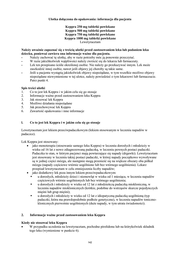 Ulotka dołączona do opakowania: informacja dla pacjenta Keppra 250 mg tabletki powlekane Keppra 500 mg tabletki powlekane Keppra 750 mg tabletki powlekane Keppra 1000 mg tabletki powlekane Lewetyracetam Należy uważnie zapoznać się z treścią ulotki przed zastosowaniem leku lub podaniem leku dziecku, ponieważ zawiera ona informacje ważne dla pacjenta. Należy zachować tę ulotkę, aby w razie potrzeby móc ją ponownie przeczytać. W razie jakichkolwiek wątpliwości należy zwrócić się do lekarza lub farmaceuty. Lek ten przepisano ściśle określonej osobie. Nie należy go przekazywać innym. Lek może zaszkodzić innej osobie, nawet jeśli objawy jej choroby są takie same. Jeśli u pacjenta wystąpią jakiekolwiek objawy niepożądane, w tym wszelkie możliwe objawy niepożądane niewymienione w tej ulotce, należy powiedzieć o tym lekarzowi lub farmaceucie. Patrz punkt 4. Spis treści ulotki 1. Co to jest lek Keppra i w jakim celu się go stosuje 2. Informacje ważne przed zastosowaniem leku Keppra 3. Jak stosować lek Keppra 4. Możliwe działania niepożądane 5. Jak przechowywać lek Keppra 6. Zawartość opakowania i inne informacje l. Co to jest lek Keppra i w jakim celu się go stosuje Lewetyracetam jest lekiem przeciwpadaczkowym (lekiem stosowanym w leczeniu napadów w padaczce). Lek Keppra jest stosowany: • jako monoterapia (stosowanie samego leku Keppra) w leczeniu dorosłych i młodzieży w wieku od 16 lat z nowo zdiagnozowaną padaczką, w leczeniu pewnych postaci padaczki. Padaczka to stan, w którym pacjenci mają powtarzające się napady (drgawki). Lewetyracetam jest stosowany w leczeniu takiej postaci padaczki, w której napady początkowo wywoływane są w jednej części mózgu, ale następnie mogą przenieść się na większe obszary obu półkul mózgu (napady częściowe wtórnie uogólnione lub bez wtórnego uogólnienia). Lekarz przepisał lewetyracetam w celu zmniejszenia liczby napadów; • jako dodatkowy lek poza innym lekiem przeciwpadaczkowym: u dorosłych, młodzieży dzieci i niemowląt w wieku od 1 miesiąca, w leczeniu napadów częściowych wtórnie uogólnionych lub bez wtórnego uogólnienia; u dorosłych i młodzieży w wieku od 12 lat z młodzieńczą padaczką miokloniczną, w leczeniu napadów mioklonicznych (krótkie, podobne do wstrząsów skurcze pojedynczych mięśni lub grup mięśni); u dorosłych i młodzieży w wieku od 12 lat z idiopatyczną padaczką uogólnioną (typ padaczki, która ma prawdopodobnie podłoże genetyczne), w leczeniu napadów tonicznoklonicznych pierwotnie uogólnionych (duże napady, w tym utrata świadomości). 2. Informacje ważne przed zastosowaniem leku Keppra Kiedy nie stosować leku Keppra • W przypadku uczulenia na lewetyracetam, pochodne pirolidonu lub na którykolwiek składnik tego leku (wymienione w punkcie 6). 142 Ostrzeżenia i środki ostrożności Przed rozpoczęciem stosowania leku Keppra należy zwrócić się do lekarza: • Jeśli stwierdzono u pacjenta chorobę nerek, lek Keppra należy stosować zgodnie z zaleceniami lekarza. Lekarz może podjąć decyzję o dostosowaniu dawkowania. • Jeśli zaobserwowano jakiekolwiek spowolnienie wzrostu lub niespodziewane przedwczesne dojrzewanie dziecka, należy skontaktować się z lekarzem. • U niektórych pacjentów leczonych lekami przeciwpadaczkowymi, takimi jak Keppra, występowały myśli o samookaleczeniu lub myśli samobójcze.W przypadku objawów depresji i (lub) myśli samobójczych, należy skontaktować się z lekarzem. Dzieci i młodzież • Nie jest wskazane stosowanie leku Keppra w monoterapii (samego leku Keppra) u dzieci i młodzieży w wieku poniżej 16 lat Keppra a inne leki Należy powiedzieć lekarzowi lub farmaceucie o wszystkich lekach przyjmowanych przez pacjenta obecnie lub ostatnio, a także o lekach, które pacjent planuje stosować. Nie należy przymować makrogolu (leku używanego w zaparciach) na godzinę przed i godzinę po zastosowaniu lewetyracetamu, ponieważ może to powstrzymać działanie lewetyracetamu. Ciąża i karmienie piersią Jeśli pacjentka jest w ciąży lub karmi piersią, przypuszcza że może być w ciąży lub gdy planuje mieć dziecko, powinna poradzić się lekarza lub farmaceuty przed zastosowaniem tego leku. Lek Keppra nie powinien być stosowany w ciąży, jeżeli nie jest to bezwzględnie konieczne. Nie można całkowicie wykluczyć ryzyka wad wrodzonych u płodu. W badaniach na zwierzętach lek Keppra podawany w dawkach większych niż stosowane w celu kontroli napadów drgawkowych, wykazał niepożądany wpływ na rozrodczość. Podczas leczenia nie zaleca się karmienia piersią. Prowadzenie pojazdów i obsługiwanie maszyn Lek Keppra może zaburzać zdolność prowadzenia pojazdów i obsługiwania narzędzi lub maszyn, gdyż stosowanie leku Keppra może powodować senność. Jest to bardziej prawdopodobne na początku leczenia lub po zwiększeniu dawki leku. Nie zaleca się prowadzenia pojazdów i obsługi maszyn, dopóki nie jest znany wpływ leku na zdolność pacjenta do wykonywania tych czynności. Tabletki Keppra 750 mg zawierają żółcień pomarańczową FCF lak glinowy (E110) Barwnik żółcień pomarańczowa FCF lak glinowy (E110) może wywoływać reakcję alergiczną. 3. Jak stosować lek Keppra Ten lek należy zawsze stosować zgodnie z zaleceniami lekarza lub farmaceuty. W razie wątpliwości należy zwrócić się do lekarza lub farmaceuty. Należy przyjmować liczbę tabletek zgodną z zaleceniemi lekarza. Lek Keppra musi być przyjmowany dwa razy na dobę, rano i wieczorem, mniej więcej o tej samej porze każdego dnia. Monoterapia • Dawka u dorosłych i młodzieży (w wieku od 16 lat): Zazwyczaj stosowana dawka: od 1000 mg do 3000 mg na dobę. Jeżeli pacjent przyjmuje lek po raz pierwszy, lekarz zaleci najpierw mniejszą dawkę przez 2 tygodnie, a dopiero potem najmniejszą zazwyczaj stosowaną dawkę. 143 Przykładowo, jeśli dawka dobowa wynosi 1000 m
