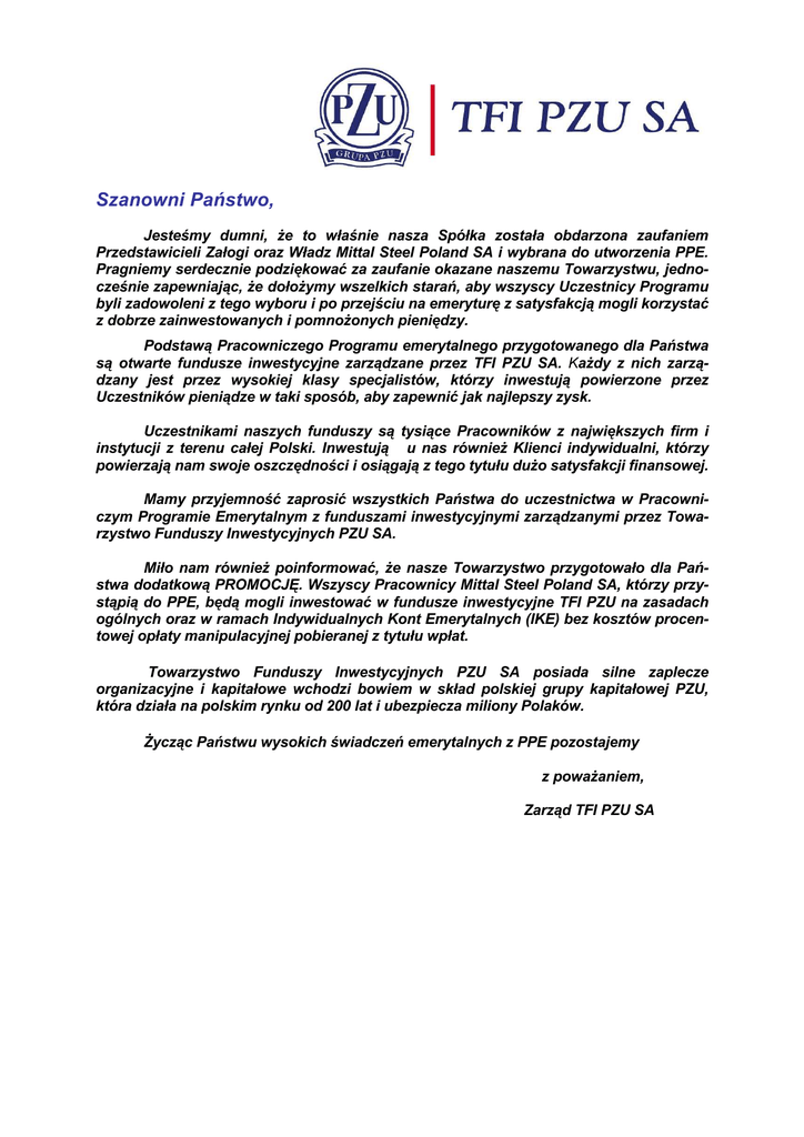 Szanowni Państwo, Jesteśmy dumni, Ŝe to właśnie nasza Spółka została obdarzona zaufaniem Przedstawicieli Załogi oraz Władz Mittal Steel Poland SA i wybrana do utworzenia PPE. Pragniemy serdecznie podziękować za zaufanie okazane naszemu Towarzystwu, jednocześnie zapewniając, Ŝe dołoŜymy wszelkich starań, aby wszyscy Uczestnicy Programu byli zadowoleni z tego wyboru i po przejściu na emeryturę z satysfakcją mogli korzystać z dobrze zainwestowanych i pomnoŜonych pieniędzy. Podstawą Pracowniczego Programu emerytalnego przygotowanego dla Państwa są otwarte fundusze inwestycyjne zarządzane przez TFI PZU SA. KaŜdy z nich zarządzany jest przez wysokiej klasy specjalistów, którzy inwestują powierzone przez Uczestników pieniądze w taki sposób, aby zapewnić jak najlepszy zysk. Uczestnikami naszych funduszy są tysiące Pracowników z największych firm i instytucji z terenu całej Polski. Inwestują u nas równieŜ Klienci indywidualni, którzy powierzają nam swoje oszczędności i osiągają z tego tytułu duŜo satysfakcji finansowej. Mamy przyjemność zaprosić wszystkich Państwa do uczestnictwa w Pracowniczym Programie Emerytalnym z funduszami inwestycyjnymi zarządzanymi przez Towarzystwo Funduszy Inwestycyjnych PZU SA. Miło nam równieŜ poinformować, Ŝe nasze Towarzystwo przygotowało dla Państwa dodatkową PROMOCJĘ. Wszyscy Pracownicy Mittal Steel Poland SA, którzy przystąpią do PPE, będą mogli inwestować w fundusze inwestycyjne TFI PZU na zasadach ogólnych oraz w ramach Indywidualnych Kont Emerytalnych (IKE) bez kosztów procentowej opłaty manipulacyjnej pobieranej z tytułu wpłat. Towarzystwo Funduszy Inwestycyjnych PZU SA posiada silne zaplecze organizacyjne i kapitałowe wchodzi bowiem w skład polskiej grupy kapitałowej PZU, która działa na polskim rynku od 200 lat i ubezpiecza miliony Polaków. śycząc Państwu wysokich świadczeń emerytalnych z PPE pozostajemy z powaŜaniem, Zarząd TFI PZU SA Drodzy Państwo, Kto z nas mając 20, 30 czy nawet 40 lat myśli o emeryturze? To wydaje nam się tak odległe. Myślimy sobie: „Mam jeszcze czas”. Tym bardziej, Ŝe najpierw trzeba kupić mieszkanie, samochód, wykształcić dzieci, spłacić zaciągnięte na ten cel kredyty. Ale czas płynie nieubłaganie i ani się obejrzymy, jak wkroczymy w wiek dojrzały bez oszczędności. Na szczęście Pracownicy Mittal Steel Poland SA mogą czuć się komfortowo. Zarząd Spółki postanowił przeznaczyć dodatkowe środki finansowe na przyszłe emerytury swoich Pracowników. Niedługo kaŜdego miesiąca do Pracowniczego Programu Emerytalnego obsługiwanego przez TFI PZU SA - popłyną pieniądze, księgowane na indywidualnych kontach Pracowników (tzw. Rejestrach Uczestników). JuŜ wkrótce zostanie zakończony pierwszy etap organizacji Pracowniczego Programu Emerytalnego (PPE). A stanie się to w chwili złoŜenia do Komisji Nadzoru Finansowego (KNF) wniosku o wpis do rejestru Pracowniczego Programu Emerytalnego w formie umów o wnoszenie przez Pracodawcę składek Pracowników Mittal Steel Poland SA do funduszy inwestycyjnych zarządzanych przez Towarzystwo Funduszy Inwestycyjnych PZU SA. Przystąpienie do PPE jest indywidualną decyzją kaŜdego Pracownika. Aby ją Państwu ułatwić, postanowiliśmy przedstawić zalety Programu przygotowanego dla Pracowników Mittal Steel Poland. Zaczniemy jednak od początku, czyli przypomnienia, z jakich źródeł pochodzi przyszła emerytura w Polsce, oraz objaśnienia, co to właściwie jest to PPE. Źródła przyszłej emerytury Od 1 stycznia 1999 roku obowiązuje w naszym kraju zreformowany system emerytalny. Zgodnie z jego zasadami wysokość przyszłej emerytury będzie zaleŜeć od wysokości opłacanej składki oraz od skuteczności inwestowania środków zgromadzonych w nowych formach zabezpieczenia społecznego. W efekcie, przyszła emerytura moŜe pochodzić z trzech źródeł łącznie, które potocznie nazywa się filarami. I filar to emerytura wypłacana przez Zakład Ubezpieczeń Społecznych (ZUS). Udział w I filarze jest obowiązkowy. Środki gromadzone w Funduszu Ubezpieczeń Społecznych pochodzą z bieŜących składek Pracowników i są rejestrowane dla kaŜdej osoby indywidualnie. Funduszem zarządza Państwo. II filar to emerytura pochodząca z otwartych funduszy emerytalnych (OFE), zarządzanych przez Powszechne Towarzystwa Emerytalne (PTE). Udział w nim jest obowiązkowy tylko dla osób urodzonych po 31 grudnia 1968 r. Składki, w wysokości 7,3% pensji brutto, są gromadzone na indywidualnych rachunkach w otwartych funduszach emerytalnych, a następnie inwestowane przez OFE. III filar to dodatkowa, dobrowolna emerytura uzyskana z oszczędności gromadzonych: Indywidualnie - np. na Indywidualnych Kontach Emerytalnych (IKE) prowadzonych przez róŜne podmioty finansowe, w tym towarzystwa funduszy inwestycyjnych lub w ramach ubezpieczeń na Ŝycie z funduszem kapitałowym, grupowo – w Pracowniczych Programach Emerytalnych (PPE). Tak wyglądają załoŜenia polskiego systemu emerytalnego. Ale dziś juŜ wiadomo, Ŝe świadczenia pobierane z I i II filaru, czyli z ZUS-u i OFE wyniosą zaledwie 30 do 60 proc. zarobków z okresu czynności zawodowej. Warto teŜ pamiętać, Ŝe niŜsze emerytury przypadną w udziale kobietom, z uwagi na ich wcześniejszy wiek emerytalny oraz statystycznie dłuŜsze od męŜczyzn Ŝycie. Tylko więc III filar jest szansą na godną emeryturę. Co to jest PPE? Najkorzystniejszym dla pracownika sposobem oszczędzania na przyszłą emeryturę jest obecnie pracowniczy program emerytalny, który podobnie jak IKE, zapewnia moŜliwość skorzystania z ulgi dotyczącej podatku od zysków kapitałowych. A przewagą PPE nad innymi wariantami pomnaŜania pieniędzy na emerytuję jest fakt, Ŝe to Pracodawca finansuje składkę w wysokości określonej w Umowie Zakładowej. Jest to tzw. składka podstawowa, która stanowi część dochodu Pracownika podlegaj