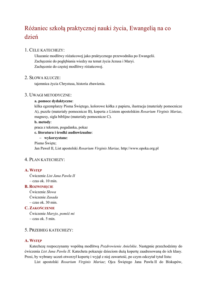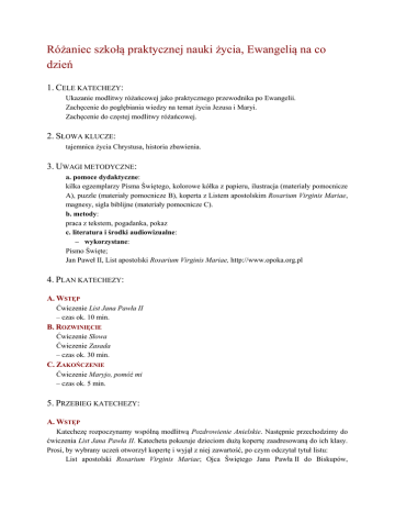Różaniec szkołą praktycznej nauki życia, Ewangelią na co dzień 1. CELE KATECHEZY: Ukazanie modlitwy różańcowej jako praktycznego przewodnika po Ewangelii. Zachęcenie do pogłębiania wiedzy na temat życia Jezusa i Maryi. Zachęcenie do częstej modlitwy różańcowej. 2. SŁOWA KLUCZE: tajemnica życia Chrystusa, historia zbawienia. 3. UWAGI METODYCZNE: a. pomoce dydaktyczne: kilka egzemplarzy Pisma Świętego, kolorowe kółka z papieru, ilustracja (materiały pomocnicze A), puzzle (materiały pomocnicze B), koperta z Listem apostolskim Rosarium Virginis Mariae, magnesy, sigla biblijne (materiały pomocnicze C). b. metody: praca z tekstem, pogadanka, pokaz c. literatura i środki audiowizualne: – wykorzystane: Pismo Święte; Jan Paweł II, List apostolski Rosarium Virginis Mariae, http://www.opoka.org.pl 4. PLAN KATECHEZY: A. WSTĘP Ćwiczenie List Jana Pawła II – czas ok. 10 min. B. ROZWINIĘCIE Ćwiczenie Słowa Ćwiczenie Zasada – czas ok. 30 min. C. ZAKOŃCZENIE Ćwiczenie Maryjo, pomóż mi – czas ok. 5 min. 5. PRZEBIEG KATECHEZY: A. WSTĘP Katechezę rozpoczynamy wspólną modlitwą Pozdrowienie Anielskie. Następnie przechodzimy do ćwiczenia List Jana Pawła II. Katecheta pokazuje dzieciom dużą kopertę zaadresowaną do ich klasy. Prosi, by wybrany uczeń otworzył kopertę i wyjął z niej zawartość, po czym odczytał tytuł listu: List apostolski Rosarium Virginis Mariae; Ojca Świętego Jana Pawła II do Biskupów, Duchowieństwa i wiernych o Różańcu Świętym. Katecheta zapisuje tytuł na tablicy, kopertę wraz z listem kładzie na biurku, tak by dzieci mogły je widzieć. Następnie zadaje uczniom pytania: O czym napisał do nas Jan Paweł II? Co to jest różaniec? Dlaczego właśnie w październiku mówimy o różańcu? Krótko podsumowuje wypowiedzi uczniów, po czym przechodzi do następnej części katechezy. B. ROZWINIĘCIE W tej części proponuje się zacząć od ćwiczenia Słowa. Katecheta umieszcza na tablicy ilustrację budynku szkolnego (materiały pomocnicze A), do której za pomocą magnesów przypięte są w sposób nieuporządkowany puzzle (materiały pomocnicze B). Zadaniem uczniów jest uporządkowanie słów i stworzenie z nich zdania: “Przechodzić z Maryją przez sceny różańca, to jakby być w szkole Maryi, by czytać Chrystusa, by wnikać w Jego tajemnice, by zrozumieć Jego przesłanie”. Po ułożeniu zdania, uczniowie przepisują je do zeszytów. Następnie katecheta w formie rozmowy z dziećmi, krótko wyjaśnia treść zdania, starając się znaleźć odpowiedzi na pytania: Co znaczy czytać Chrystusa? Co oznacza słowo tajemnica w kontekście życia Chrystusa? O jakiej historii mówi nam różaniec? Kolejnym elementem katechezy jest ćwiczenie Zasada. Katecheta wprowadzając uczniów w zadanie, podkreśla, że różaniec jest szkołą, w której możemy bardziej poznać Jezusa i nauczyć się, jak żyć Ewangelią na co dzień. Zasady tej szkoły są zawarte w Piśmie Świętym. Każdy uczeń otrzymuje karteczkę z siglami (materiały pomocnicze C), odnoszącymi się do określonej tajemnicy różańca, kolorowe kółeczko z papieru, na którym wypisuje zasadę, potrzebną do życia w tej szkole, np. Łk 1,38 – być posłusznym jak Matka Boża; lub mówić Bogu “tak” Łk 1,45 – starać się wierzyć jak Matka Boża; lub szczęśliwy, kto wierzy. Uwaga! Należy rozdać kółka w określonym kolorze dostosowując je do konkretnej tajemnicy różańcowej np. tajemnice radosne – kolor niebieski, tajemnice światła – kolor żółty, tajemnice bolesne – kolor fioletowy, tajemnice chwalebne – kolor pomarańczowy. Po wykonaniu zadania uczniowie odczytują swoje zasady, a następnie wklejają je do zeszytu. Podsumowanie ćwiczenia stanowi odpowiedź na pytanie: Jakie warunki należy spełnić, aby zapisać się do szkoły różańcowej? Katecheta zapisuje odpowiedzi obok ilustracji z budynkiem szkolnym, uczniowie przepisują je do zeszytów. C. ZAKOŃCZENIE Na koniec proponuje się ćwiczenie Maryjo, pomóż mi. Uczniowie ustawiają się w kręgu, można zaśpiewać dowolną pieśń o różańcu, następnie każdy w chwili ciszy zastanawia się, o co chce poprosić Matkę Bożą. Na koniec wszystkie dzieci razem mówią: Maryjo, pomóż mi. Amen. 6. MATERIAŁY POMOCNICZE: – Wykorzystane A. Ilustracja budynku szkolnego – proponowany format A1 B. Ćwiczenie Słowa – puzzle (proponowana wielkość – każde słowo – format A5). “PRZECHODZIĆ Z MARYJĄ PRZEZ SCENY RÓŻAŃCA, TO JAKBY BYĆ W SZKOLE MARYI, BY CZYTAĆ CHRYSTUSA, BY WNIKAĆ W JEGO TAJEMNICE, BY ZROZUMIEĆ JEGO PRZESŁANIE” C. Ćwiczenie Zasada – sigla biblijne do tajemnic różańca: Część radosna: 1. Zwiastowanie – Łk 1,38. 2. Nawiedzenie św. Elżbiety – Łk 1,45. 3. Narodzenie Pana Jezusa – Łk 2,7. 4. Ofiarowanie w świątyni – Łk 2,22. 5. Znalezienie w świątyni – Łk 2,49. Część światła: 1. Chrzest Jezusa – Łk 23,22. 2. Cud w Kanie Galilejskiej – Łk 2,5. 3. Głoszenie Królestwa Bożego i wezwanie do nawrócenia – Łk 4,17-19. 4. Przemienienie na górze Tabor – Łk 9,39-35. 5. Ustanowienie Eucharystii – Łk 22,19-20. Część bolesna: 1. Modlitwa w Ogrójcu – Łk 22,41-42. 2. Biczowanie – Mk15,15. 3. Cierniem ukoronowanie – Łk 17-20. 4. Droga krzyżowa – Łk 23,27-28. 5. Śmierć na krzyżu – Łk 23,46. Część chwalebna: 1. Zmartwychwstanie – Łk 24,6-7. 2. Wniebowstąpienie – Łk 24,50-53. 3. Zesłanie Ducha Świętego – Dz2,1-4. 4. Wniebowzięcie Maryi – Łk 1,46-48. 5. Ukoronowanie Maryi na Królową nieba i ziemi – Ap 12,1.