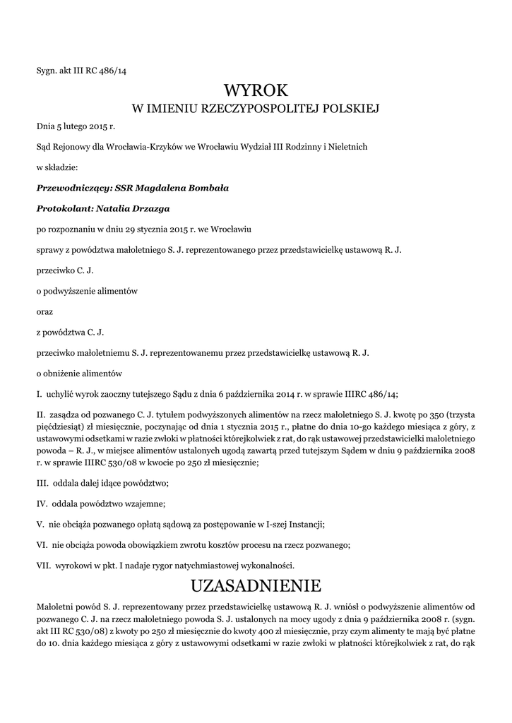Sygn. akt III RC 486/14 WYROK W IMIENIU RZECZYPOSPOLITEJ POLSKIEJ Dnia 5 lutego 2015 r. Sąd Rejonowy dla Wrocławia-Krzyków we Wrocławiu Wydział III Rodzinny i Nieletnich w składzie: Przewodniczący: SSR Magdalena Bombała Protokolant: Natalia Drzazga po rozpoznaniu w dniu 29 stycznia 2015 r. we Wrocławiu sprawy z powództwa małoletniego S. J. reprezentowanego przez przedstawicielkę ustawową R. J. przeciwko C. J. o podwyższenie alimentów oraz z powództwa C. J. przeciwko małoletniemu S. J. reprezentowanemu przez przedstawicielkę ustawową R. J. o obniżenie alimentów I. uchylić wyrok zaoczny tutejszego Sądu z dnia 6 października 2014 r. w sprawie IIIRC 486/14; II. zasądza od pozwanego C. J. tytułem podwyższonych alimentów na rzecz małoletniego S. J. kwotę po 350 (trzysta pięćdziesiąt) zł miesięcznie, poczynając od dnia 1 stycznia 2015 r., płatne do dnia 10-go każdego miesiąca z góry, z ustawowymi odsetkami w razie zwłoki w płatności którejkolwiek z rat, do rąk ustawowej przedstawicielki małoletniego powoda – R. J., w miejsce alimentów ustalonych ugodą zawartą przed tutejszym Sądem w dniu 9 października 2008 r. w sprawie IIIRC 530/08 w kwocie po 250 zł miesięcznie; III. oddala dalej idące powództwo; IV. oddala powództwo wzajemne; V. nie obciąża pozwanego opłatą sądową za postępowanie w I-szej Instancji; VI. nie obciąża powoda obowiązkiem zwrotu kosztów procesu na rzecz pozwanego; VII. wyrokowi w pkt. I nadaje rygor natychmiastowej wykonalności. UZASADNIENIE Małoletni powód S. J. reprezentowany przez przedstawicielkę ustawową R. J. wniósł o podwyższenie alimentów od pozwanego C. J. na rzecz małoletniego powoda S. J. ustalonych na mocy ugody z dnia 9 października 2008 r. (sygn. akt III RC 530/08) z kwoty po 250 zł miesięcznie do kwoty 400 zł miesięcznie, przy czym alimenty te mają być płatne do 10. dnia każdego miesiąca z góry z ustawowymi odsetkami w razie zwłoki w płatności którejkolwiek z rat, do rąk R. J. jako przedstawicielki ustawowej małoletniego powoda. Jednocześnie małoletni powód wniósł o zasądzenie od pozwanego na jego rzecz kosztów procesu według norm przepisanych, w tym kosztów zastępstwa procesowego. W uzasadnieniu przedstawicielka ustawowa małoletniego wskazała, że od zawarcia ugody nastąpiła istotna zmiana stosunków w rozumieniu art. 138 k.r.o. w zakresie usprawiedliwionych potrzeb małoletniego powoda. Od zawarcia ugody pomiędzy stronami upłynęło 6 lat. Tak długi upływ czasu spowodował, że usprawiedliwione potrzeby powoda uległy znacznemu zwiększeniu – przede wszystkim w zakresie wyżywienia, zakupu odzieży, potrzeb edukacyjnych – albowiem powód rozpoczął naukę w szkole podstawowej. Nadto szkoła powoda jest oddalona od jego miejsca zamieszkania, w związku z czym matka powoda codziennie dowozi i odbiera go ze szkoły samochodem. Miesięczny koszt związany z dojazdem powoda do szkoły wynosi 150 zł w części przypadającej na małoletniego. Obecnie miesięczny koszt utrzymania małoletniego wynosi łącznie około 1700 zł miesięcznie, na co składają się: koszty wyżywienia (780 zł), koszty zakupu odzieży 9100 zł), koszty utrzymania mieszkania w części przypadającej na małoletniego ( (...) = 460 zł), koszty zakupu paliwa (150 zł), kosmetyki i chemia (40 zł), leki (30 zł), przybory szkolne (25 zł), rozrywka (20 zł), wydatki okresowe (prezenty okolicznościowe, wydatki szkolne, półkolonie, wakacje, wyjazdy weekendowe, wyprawka szkolna – średnio 140 zł miesięcznie). Matka powoda pracuje jako przedszkolanka w żłobku za wynagrodzeniem 1443,41 zł netto miesięcznie. Ponosi koszty zakupu paliwa (300-400 zł), koszty utrzymania mieszkania (1403 zł). R. J. korzysta z pomocy finansowej matki. Pozwany jedynie sporadycznie utrzymuje kontakty z powodem, nie dzwoni do dziecka, nie zabiera na wyjazdy, nie zaprasza do siebie, nie sponsoruje wakacji, ferii, bardzo rzadko kupuje prezenty. Ostatnie spotkanie, zainicjowane przez matkę powoda, miało miejsce w czerwcu 2014 r. Pozwany zamieszkuje samodzielnie w dwupokojowym mieszkaniu o pow. 53 m2. Nie ma nikogo na swoim utrzymaniu. Obecnie jest na rencie okresowej z powodu częściowej niezdolności do pracy wywołanej depresją. W 2008 r. renta wynosiła 700 zł, jednakże wiadomym jest, że jest ona waloryzowana. Zaleceniem la pozwanego było podjęcie terapii i przekwalifikowanie się, aby mógł podjąć zatrudnienie, czego pozwany nie czyni. Dnia 6 października 2014 r. tutejszy Sąd wydał wyrok zaoczny, w którym w całości uwzględnił żądanie małoletniego, zasądzając od pozwanego na jego rzecz alimenty w kwocie 400 zł miesięcznie, poczynając od dnia 8 sierpnia 2014 r., płatne do 10. dnia każdego miesiąca z góry, z ustawowymi odsetkami w razie zwłoki w płatności którejkolwiek z rat, do rąk ustawowej przedstawicielki małoletniego, w miejsce alimentów ustalonych ugodą zawarta przed tutejszym Sądem dnia 9 października 2008 r. w sprawie III RC 530/08 w kwocie po 250 zł miesięcznie. Jednocześnie Sąd zasądził od pozwanego na rzecz powoda kwotę 600 zł tytułem zwrotu kosztów zastępstwa procesowego, nie obciążył pozwanego obowiązkiem kosztów sądowych. Wyrokowi w pkt. I nadał rygor natychmiastowej wykonalności. W sprzeciwie z dnia 15 października 2014 r. pozwany wniósł o uchylenie wyroku zaocznego, oddalenie powództwa w całości. Jednocześnie wytoczył powództwo wzajemne, wnosząc o obniżenie alimentów zasądzonych ugodą sądową z kwoty po 250 zł do kwoty po 100 zł miesięcznie. W uzasadnieniu pozwany – powód wzajemny wskazał, że jest niezdolny do pracy, ponieważ jest ciężko chory. Utrzymuje się z renty ZUS, która wynosi 840 zł miesięcznie. Ma długi zaciągnięte na utrzymanie i leczenie. Nie posiada innych źródeł przychodu. Świadczenia mieszkaniowe wynoszą ponad 400 zł miesięcznie, a koszt zakupu leków – 150 zł mie