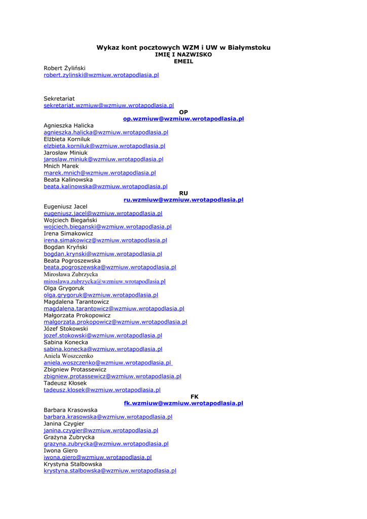Wykaz kont pocztowych WZM i UW w Białymstoku IMIĘ I NAZWISKO EMEIL Robert Żyliński [email protected] Sekretariat [email protected] OP [email protected] Agnieszka Halicka [email protected] Elżbieta Korniluk [email protected] Jarosław Miniuk [email protected] Mnich Marek [email protected] Beata Kalinowska [email protected] RU [email protected] Eugeniusz Jacel [email protected] Wojciech Biegański [email protected] Irena Simakowicz [email protected] Bogdan Kryński [email protected] Beata Pogroszewska [email protected] Mirosława Zubrzycka [email protected] Olga Grygoruk [email protected] Magdalena Tarantowicz [email protected] Małgorzata Prokopowicz [email protected] Józef Stokowski [email protected] Sabina Konecka [email protected] Aniela Woszczenko [email protected] Zbigniew Protassewicz [email protected] Tadeusz Kłosek [email protected] FK [email protected] Barbara Krasowska [email protected] Janina Czygier [email protected] Grażyna Zubrycka [email protected] Iwona Giero [email protected] Krystyna Stalbowska [email protected] Anna Pogroszewska [email protected] BT -BIAŁYSTOK [email protected] Ryszard Kruszewski [email protected] Barbara Kapłunow barbara.kapł[email protected] Marta Puchlik [email protected] Hanna Gromotowicz [email protected] Anatol Fiedorowicz [email protected] Mirosław Poźniak [email protected] Dariusz Zawadzki [email protected] Aleksander Stocki [email protected] Adam Kużdub [email protected] Leon Chlabicz [email protected] Aleksander Kardasz [email protected] Bagnuk Alina [email protected] BT- ŁOMŻA [email protected] Krzysztof Zieliński [email protected] Małgorzata Polesińska [email protected] Halina Nitkiewicz [email protected] Ewa Jastrzębska [email protected] Ireneusz Majdak [email protected] Cezary Betley [email protected] BT-SUWAŁKI [email protected] Barbara Straszyńska [email protected] Lech Grygo [email protected] Danuta Jaskuła [email protected] Bożena Sieńkowska [email protected] Józef Rybi [email protected] Czesław Prostko [email protected] GP.WODOCIĄGI [email protected] Wiesław Lewko [email protected] Katarzyna Konończuk [email protected] GP.EUM B-STOK [email protected] Wojciech Biegański [email protected] Janina Czygier [email protected]
