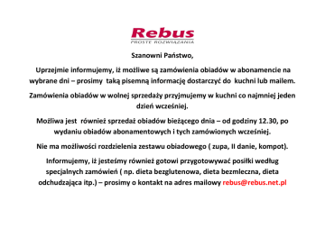Szanowni Państwo, Uprzejmie informujemy, iż możliwe są zamówienia obiadów w abonamencie na wybrane dni – prosimy taką pisemną informację dostarczyć do kuchni lub mailem. Zamówienia obiadów w wolnej sprzedaży przyjmujemy w kuchni co najmniej jeden dzień wcześniej. Możliwa jest również sprzedaż obiadów bieżącego dnia – od godziny 12.30, po wydaniu obiadów abonamentowych i tych zamówionych wcześniej. Nie ma możliwości rozdzielenia zestawu obiadowego ( zupa, II danie, kompot). Informujemy, iż jesteśmy również gotowi przygotowywać posiłki według specjalnych zamówień ( np. dieta bezglutenowa, dieta bezmleczna, dieta odchudzająca itp.) – prosimy o kontakt na adres mailowy [email protected]