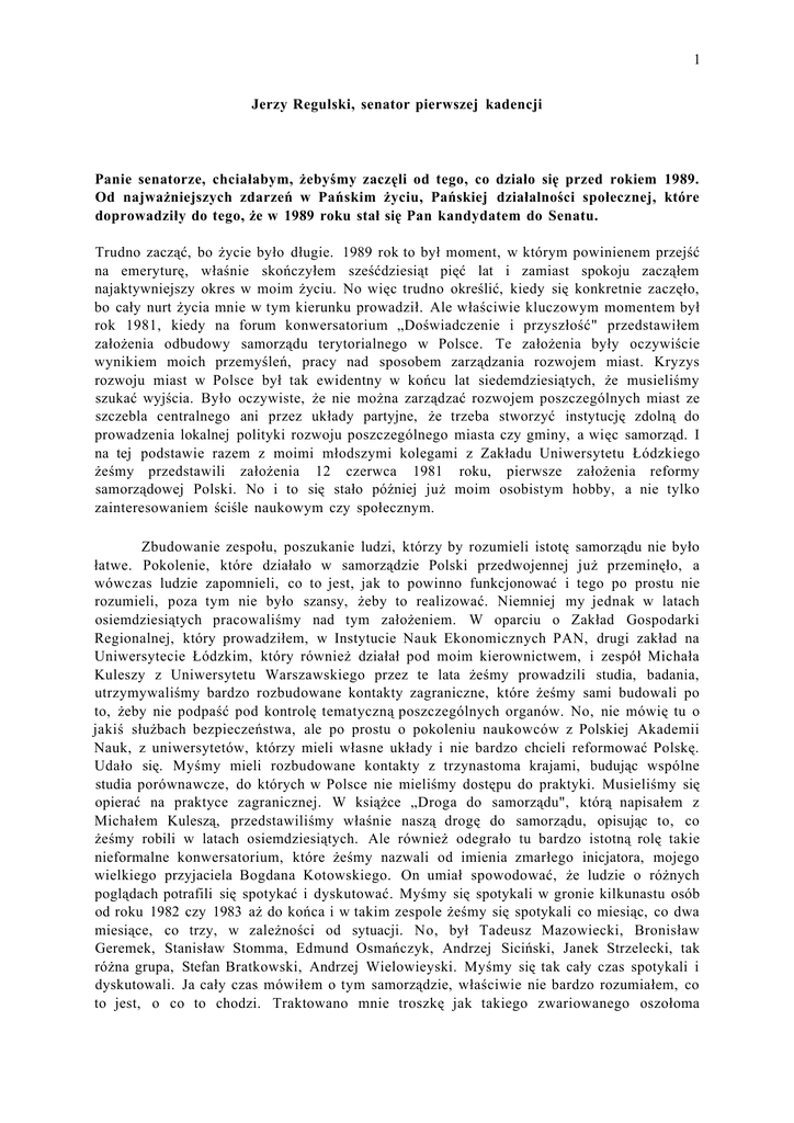 1 Jerzy Regulski, senator pierwszej kadencji Panie senatorze, chciałabym, żebyśmy zaczęli od tego, co działo się przed rokiem 1989. Od najważniejszych zdarzeń w Pańskim życiu, Pańskiej działalności społecznej, które doprowadziły do tego, że w 1989 roku stał się Pan kandydatem do Senatu. Trudno zacząć, bo życie było długie. 1989 rok to był moment, w którym powinienem przejść na emeryturę, właśnie skończyłem sześćdziesiąt pięć lat i zamiast spokoju zacząłem najaktywniejszy okres w moim życiu. No więc trudno określić, kiedy się konkretnie zaczęło, bo cały nurt życia mnie w tym kierunku prowadził. Ale właściwie kluczowym momentem był rok 1981, kiedy na forum konwersatorium „Doświadczenie i przyszłość" przedstawiłem założenia odbudowy samorządu terytorialnego w Polsce. Te założenia były oczywiście wynikiem moich przemyśleń, pracy nad sposobem zarządzania rozwojem miast. Kryzys rozwoju miast w Polsce był tak ewidentny w końcu lat siedemdziesiątych, że musieliśmy szukać wyjścia. Było oczywiste, że nie można zarządzać rozwojem poszczególnych miast ze szczebla centralnego ani przez układy partyjne, że trzeba stworzyć instytucję zdolną do prowadzenia lokalnej polityki rozwoju poszczególnego miasta czy gminy, a więc samorząd. I na tej podstawie razem z moimi młodszymi kolegami z Zakładu Uniwersytetu Łódzkiego żeśmy przedstawili założenia 12 czerwca 1981 roku, pierwsze założenia reformy samorządowej Polski. No i to się stało później już moim osobistym hobby, a nie tylko zainteresowaniem ściśle naukowym czy społecznym. Zbudowanie zespołu, poszukanie ludzi, którzy by rozumieli istotę samorządu nie było łatwe. Pokolenie, które działało w samorządzie Polski przedwojennej już przeminęło, a wówczas ludzie zapomnieli, co to jest, jak to powinno funkcjonować i tego po prostu nie rozumieli, poza tym nie było szansy, żeby to realizować. Niemniej my jednak w latach osiemdziesiątych pracowaliśmy nad tym założeniem. W oparciu o Zakład Gospodarki Regionalnej, który prowadziłem, w Instytucie Nauk Ekonomicznych PAN, drugi zakład na Uniwersytecie Łódzkim, który również działał pod moim kierownictwem, i zespół Michała Kuleszy z Uniwersytetu Warszawskiego przez te lata żeśmy prowadzili studia, badania, utrzymywaliśmy bardzo rozbudowane kontakty zagraniczne, które żeśmy sami budowali po to, żeby nie podpaść pod kontrolę tematyczną poszczególnych organów. No, nie mówię tu o jakiś służbach bezpieczeństwa, ale po prostu o pokoleniu naukowców z Polskiej Akademii Nauk, z uniwersytetów, którzy mieli własne układy i nie bardzo chcieli reformować Polskę. Udało się. Myśmy mieli rozbudowane kontakty z trzynastoma krajami, budując wspólne studia porównawcze, do których w Polsce nie mieliśmy dostępu do praktyki. Musieliśmy się opierać na praktyce zagranicznej. W książce „Droga do samorządu", którą napisałem z Michałem Kuleszą, przedstawiliśmy właśnie naszą drogę do samorządu, opisując to, co żeśmy robili w latach osiemdziesiątych. Ale również odegrało tu bardzo istotną rolę takie nieformalne konwersatorium, które żeśmy nazwali od imienia zmarłego inicjatora, mojego wielkiego przyjaciela Bogdana Kotowskiego. On umiał spowodować, że ludzie o różnych poglądach potrafili się spotykać i dyskutować. Myśmy się spotykali w gronie kilkunastu osób od roku 1982 czy 1983 aż do końca i w takim zespole żeśmy się spotykali co miesiąc, co dwa miesiące, co trzy, w zależności od sytuacji. No, był Tadeusz Mazowiecki, Bronisław Geremek, Stanisław Stomma, Edmund Osmańczyk, Andrzej Siciński, Janek Strzelecki, tak różna grupa, Stefan Bratkowski, Andrzej Wielowieyski. Myśmy się tak cały czas spotykali i dyskutowali. Ja cały czas mówiłem o tym samorządzie, właściwie nie bardzo rozumiałem, co to jest, o co to chodzi. Traktowano mnie troszkę jak takiego zwariowanego oszołoma 2 hobbystę. Niemniej stałą się rzecz podstawowa: nabraliśmy do siebie zaufania, poznaliśmy się. A później zaufanie Tadeusza Mazowieckiego miało wagę złota i brylantów. I w końcu 1988 roku, kiedy właściwie zaczęły się pierwsze dyskusje o spotkaniu z rządem, okrągłym stole, o tworzeniu Komitetu Obywatelskiego, ustalaliśmy roboczo na spotkaniu listę komisji Komitetu Obywatelskiego, który właśnie powoływał Lech Wałęsa. No i właśnie tam z Andrzejem Wielowieyskim i Stefanem Bratkowskim żeśmy wstawili Komisję Samorządu Terytorialnego. Nie bardzo wiedziano, co to jest. Najlepszym tego dowodem było to, że na pierwszym zebraniu komitetu z ponad stu osób na sali nikt się nie zgłosił. Właściwie zgłosił się tylko Andrzej Celiński, powiedział: „Wiesz, to mnie zainteresowało, bo jak tyś zaczął o tym mówić, wszyscy poszli na kawę, to ja pomyślałem: to może coś w tym jest". I zapisał się do naszej Komisji. Dość, że Komisję żeśmy stworzyli z ludzi spoza Komitetu Obywatelskiego przy Lechu Wałęsie. No i potem była rozgrywka o wprowadzenie tematu do obrad okrągłego stołu. Wbrew pozorom to nie było oczywiste. Tak się złożyło, że ja akurat byłem na wykładach w Rzymie i wróciłem w końcu stycznia do Warszawy. I widzę, że skład był już upubliczniony, struktura tych spotkań ustalona i znowu nie ma tematu samorządu. Natomiast jest zespół, nazywał się „do wolności stowarzyszeń". I już poprzednio Bronek Geremek pytał, czy ja się do tego zespołu zapiszę. Ja mówię, że przecież to jest bzdura, mówimy o władzy publicznej, a nie o wolności stowarzyszeń. „No tak, ale to tak musi być, bo inaczej to nie będzie" - padła odpowiedź. No, ja po powrocie w końcu stycznia dzwonię i mówię: „To znowu jesteśmy w tym zespole". Jeszcześmy wtedy jeszcze byli na „pan". On tak spoważniał i mówi: „Panie Jurku , ale samorządu terytorialnego to w ogóle nie 