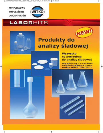 LABORTOPS_LABORTOPS_LABORHITS_4_2015_PL.QXP_ML-01 25.09.2015 14:43 Seite 1 Produkty do analizy śladowej Wszystko co potrzebne do analizy śladowej Więcej informacji o produktach znajdziecie Państwo w nowym katalogu WITKO (2016/2017) LABORTOPS_LABORTOPS_LABORHITS_4_2015_PL.QXP_ML-01 25.09.2015 14:43 Seite 2 Parownice, pojemniki i próbówki do analizy śladowej Probówki reakcyjne, PFA Pojemniki, PFA Mogą być wielokrotnie sterylizowane. Z zakrywką z PTFE lub bez. Poj. mL 5 15 25 50 60 5 10 15 20 25 50 60 Śred. wewn. mm 8 14 16 19 19 8 10 14 14 16 19 19 Śred. zewn. mm 10 16 19 22 22 10 12 16 16 19 22 22 Dł. mm 120 150 170 220 230 132 152 162 175 185 235 245 Opis Bez zakrywki Bez zakrywki Bez zakrywki Bez zakrywki Bez zakrywki Z zakrywką Z zakrywką Z zakrywką Z zakrywką Z zakrywką Z zakrywką Z zakrywką Op. Nr kat. 1 1 1 1 1 1 1 1 1 1 1 1 6.267 607 6.267 608 6.267 609 6.267 610 6.267 611 6.267 612 6.267 613 6.267 614 6.267 615 6.267 616 6.267 617 6.267 618 Pojemniki z PFA są przeznaczone do przechowywania roztworów, past i materiałów sypkich bez obaw o wyługowanie, korozję, zanieczyszczenia lub odparowanie. Posiadają obszar na oznakowanie identyfikacyjne umieszczony na boku pojemnika. - Termoodporne, możliwość stosowania nawet w temperaturach kriogenicznych - Dodatkowa uszczelka wewnętrzna zapewnia bezpieczeństwo i szczelność pojemnika - Idealne do przechowywania próbek po reakcjach Poj. mL 60 120 240 360 480 1000 2000 Parownice z PFA służą do odparowania nadmiaru cieczy i wytwarzania stężonego roztworu lub stałego osadu. Nieprzywierające, ukośne ścianki powodują, że ciecz bezpośrednio spływa w dół, co ogranicza jej skraplanie na ściankach. Posiadają szeroki wylew ułatwiający opróżnianie. PFA - Przezroczyste - Idealne do stosowania z mikrofalami PFA PTFE PTFE mL 100 100 400 mm 29,5 37,3 45,2 Nr kat. 1 1 1 1 1 1 1 6.267 468 6.267 469 6.267 470 6.267 471 6.267 472 6.267 473 6.267 474 To bardzo płytkie, wklęsłe naczynka idealne do przechowywania, ważenia, krystalizacji, odparowania i suszenia małych próbek płynów, proszków i ciał stałych. Mogą być również stosowane jako wypukłe pokrywki do zlewek i kolb Erlenmeyera, aby ograniczyć zanieczyszczenia przenikające z powietrza, przy jednoczesnym umożliwieniu wymiany gazowej. Wszystkie rozmiary zostały uformowane w tym samym kształcie, w celu łatwego układania szkiełek jedne na drugich. PTFE jest niełamliwe, odporne na chemikalia i łatwe w czyszczeniu. Śred. Wys. Op. - Odporne, chemicznie obojętne - Gładka powierzchnia i odporność na pęknięcia - Do używania także jako pokrywki do zlewek PTFE - Nietłukący się PTFE, całkowicie obojętny chemicznie - Odpornośc na temperaturę do 288 °C Poj. Wys. z zakrywką mm 46,8 53,2 96,8 90,6 94,3 150,0 269,1 Szkiełka zegarkowe, PTFE Parownice, PFA Typ Śred. z zakrywką mm 50,8 66,0 66,8 84,4 65,2 106,7 104,1 Op. Nr kat. 1 6.267 447 1 6.267 448 1 6.267 449 mm 50 75 100 125 150 Op. Nr kat. 1 1 1 1 1 6.267 619 6.267 620 6.267 621 6.267 622 6.267 623 Więcej artykułów z tego działu znajdziecie Państwo w naszym katalogu na stronie 1110 LABORTOPS_LABORTOPS_LABORHITS_4_2015_PL.QXP_ML-01 25.09.2015 14:43 Seite 3 Kolby i butle do analizy śladowej Butle z szeroką szyjką, PFA Kolby Erlenmayera, z podziałką, PFA Szyjki każdej kolby są lekko zaokrąglone co zapewnia łatwiejsze nalewanie i umożliwia zamykanie korkiem. PFA ma najniższą zawartość jonów metali spośród wszystkich fluoropolimerów. Kolby sprawdzają się idealnie podczas miareczkowania oraz w hodowlach bakteryjnych. Butle dozujące z PFA, z szerokim otworem, umożliwiającym wygodne opróznianie i napełnianie wszelkimi rodzajami ceiczy. - Szczelne - Elastyczna końcówka obrotowa (360°), mały otwór umożliwia dokładne dozowanie zawartości - Wytłoczone znaczniki pojemności Poj. Poj. Wys. mL 100 200 300 mm 97 123 130 Śred. szyjki mm 18 23 23 Op. Nr kat. 1 6.267 465 1 6.267 466 1 6.267 467 Butle z szeroką szyjką, z zakrywką, z podziałką, PFA mL 20 100 250 500 1000 Wys. z zakrywką mm 60,3 106,5 136,8 173,8 207,2 Śred. szyjki mm 16,4 25,7 25,7 33,9 36,8 100 250 500 10000 159,5 195,3 293,7 317,5 Śred. szyjki mm Op. Nr kat. 25,5 25,6 33,9 36,9 1 1 1 1 6.267 480 6.267 481 6.267 482 6.267 483 Butle z wąską szyjką, z zakrywką, PFA Butle ze znacznikami pojemności posiadają szeroki otwór zapewniający łatwe napełnianie. Każda butla posiada zakrywkę z PFA z zapewniającą szczelność zamknięcia, wewnętrzną wkładką z fluoropolimeru. Idealne do próbek środowiskowych, oraz przechowywania odczynników farmaceutycznych lub przeznaczonych do produkcji półprzewodników. Poj. mL Wys. z zakrywką mm Op. 1 1 1 1 1 Nr kat. 6.267 442 6.267 443 6.267 444 6.267 445 6.267 446 Z obojętną chemicznie uszczelką fluoropolimerową zapewniającą całkowitą szczelność. Dostarczane z zakrywką z PFA. Poj. Wys. z zakrywką mm 100,8 133,7 165,1 202,4 mL 100 250 500 1000 Śred. szyjki mm 16,7 16,5 17,0 25,3 Op. Nr kat. 1 1 1 1 6.267 438 6.267 439 6.267 440 6.267 441 Produkty wykonane z PFA Produkty wykonane z PFA są chemicznie obojętne i bardzo dobrze nadają się do zastosowań wymagających wysokiej czystości na przykład do analiz środowiskowych lub śladowych. Są one odporne na ciepło i posiadają nieprzywierającą, łatwą do czyszczenia powierzchnię. Ze względu na wysoką hydrofobowość, antyadhezyjność oraz gładką powierzchnię nie ma w nich ryzyka zanieczyszczeń krzyżowych ani żadnych efektów pamięci. Posiadają także wysoką stabilność termiczną od -200 do + 260 °C. Produkty wykonane z PFA są idealne do przechowywania praktycznie wszystkich żrących środków chemicznych w tym: kwasu fluorowodorowego, kwasu azotowego i kwasu nadchlorowego. Specyfikacja: - Bardzo niski poziom jonów metali - Wysoka wytrzymałość mechaniczna i stabilność rozmiarów - Można używać w kuchence mikrofalowej - Nietłukące się, pr