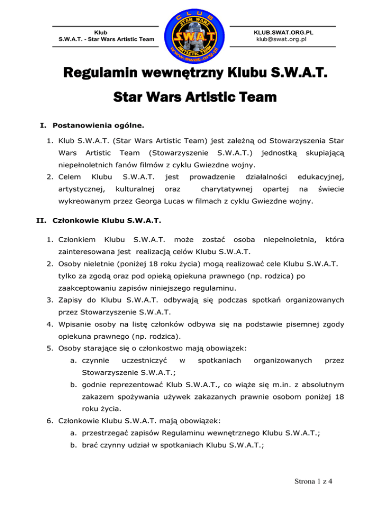 Klub S.W.A.T. - Star Wars Artistic Team KLUB.SWAT.ORG.PL [email protected] Regulamin wewnętrzny Klubu S.W.A.T. Star Wars Artistic Team I. Postanowienia ogólne. 1. Klub S.W.A.T. (Star Wars Artistic Team) jest zależną od Stowarzyszenia Star Wars Artistic Team (Stowarzyszenie S.W.A.T.) jednostką skupiającą niepełnoletnich fanów filmów z cyklu Gwiezdne wojny. 2. Celem Klubu artystycznej, S.W.A.T. jest prowadzenie kulturalnej oraz działalności charytatywnej opartej edukacyjnej, na świecie wykreowanym przez Georga Lucas w filmach z cyklu Gwiezdne wojny. II. Członkowie Klubu S.W.A.T. 1. Członkiem Klubu S.W.A.T. może zostać osoba niepełnoletnia, która zainteresowana jest realizacją celów Klubu S.W.A.T. 2. Osoby nieletnie (poniżej 18 roku życia) mogą realizować cele Klubu S.W.A.T. tylko za zgodą oraz pod opieką opiekuna prawnego (np. rodzica) po zaakceptowaniu zapisów niniejszego regulaminu. 3. Zapisy do Klubu S.W.A.T. odbywają się podczas spotkań organizowanych przez Stowarzyszenie S.W.A.T. 4. Wpisanie osoby na listę członków odbywa się na podstawie pisemnej zgody opiekuna prawnego (np. rodzica). 5. Osoby starające się o członkostwo mają obowiązek: a. czynnie uczestniczyć w spotkaniach organizowanych przez Stowarzyszenie S.W.A.T.; b. godnie reprezentować Klub S.W.A.T., co wiąże się m.in. z absolutnym zakazem spożywania używek zakazanych prawnie osobom poniżej 18 roku życia. 6. Członkowie Klubu S.W.A.T. mają obowiązek: a. przestrzegać zapisów Regulaminu wewnętrznego Klubu S.W.A.T.; b. brać czynny udział w spotkaniach Klubu S.W.A.T.; Strona 1 z 4 Klub S.W.A.T. - Star Wars Artistic Team KLUB.SWAT.ORG.PL [email protected] c. godnie reprezentować Klub S.W.A.T., co wiąże się m.in. z absolutnym zakazem spożywania używek zakazanych prawnie osobom poniżej 18 roku życia; d. regularnie opłacać składkę członkowską; e. dbać o dobry wizerunek Klubu S.W.A.T.; f. terminowo realizować wyznaczone zadania. 7. Członkowie Klubu S.W.A.T. mają prawo do: a. Uczestniczenia, na preferencyjnych warunkach, w akcjach przygotowanych przez Stowarzyszenie S.W.A.T. w ramach prowadzonej działalności; b. korzystania z ofert firm trzecich w ramach przygotowanych programów partnerskich; c. otrzymania bezpłatnej skrzynki poczty elektronicznej w domenie [email protected]; d. posługiwania się logotypem Klubu S.W.A.T. w zakresie realizowanych zadań statutowych – wymaga każdorazowej zgody Rady Stowarzyszenia S.W.A.T.; e. reprezentowania Klubu S.W.A.T. w zakresie powierzonych kompetencji; f. zgłaszania propozycji aktywności Klubu S.W.A.T.; g. uczestniczenia w programie artystycznym zgodnie z ustalonymi kompetencjami/rolami; h. zgłaszania w formie pisemnej propozycji w zakresie wydatkowania składek członkowskich Klubu S.W.A.T. – propozycje wydatków należy zgłaszać na adres [email protected]; i. podejmowania inicjatyw w zakresie wszelkich działań zgodnych z Regulaminem wewnętrznym Klubu S.W.A.T. 8. Członkostwo w Klubie S.W.A.T. ustaje na skutek: a. osiągnięcia pełnoletniości – 18 lat. Osoby pełnoletnie mają możliwość dołączenia do Stowarzyszenia S.W.A.T.; b. wystąpienia z Klubu S.W.A.T. na podstawie pisemnego oświadczenia; c. nieprzestrzegania zapisów Regulaminu wewnętrznego Klubu S.W.A.T.; d. zaprzestaniem realizowania celów S.W.A.T.; e. zaprzestaniem opłacania składek członkowskich. Strona 2 z 4 Klub S.W.A.T. - Star Wars Artistic Team KLUB.SWAT.ORG.PL [email protected] 9. W przypadku ustania członkowstwa w Klubie S.W.A.T. wpłacone składki nie podlegają zwrotowi. III. Struktura organizacyjna Klubu S.W.A.T. 1. Członkowie Klubu S.W.A.T. – wszystkie osoby systematycznie opłacające i nie zalegającymi ze składkami Członkowskimi, aktywnie realizujące cele Klubu S.W.A.T. oraz przestrzegające zapisów zamieszczonych w Regulaminie wewnętrznym Klubu S.W.A.T. 2. Nadzór nad klubem S.W.A.T. sprawuje Rada Stowarzyszenia S.W.A.T. oraz wyznaczeni członkowie Stowarzyszenia S.W.A.T. 3. Skarbnik – osoba wyznaczona spośród członków Stowarzyszenia S.W.A.T., przez Radę Stowarzyszenia S.W.A.T. IV. Majątek Klubu S.W.A.T. 1. Majątek Klubu S.W.A.T. stanowią składki członkowskie. 2. Wysokość składek jest ustalana przez opiekunów prawnych Członków klubu S.W.A.T. lub Radę Stowarzyszenia S.W.A.T. najpóźniej do końca stycznia każdego roku kalendarzowego. 3. Majątkiem Klubu S.W.A.T. zarządza Rada Stowarzyszenia S.W.A.T. na podstawie bieżących potrzeb i/lub zatwierdzonego planu wydatków w danym roku. 4. Osobą odpowiedzialną za zbieranie składek członkowskich, dokonywanie rozliczeń, raportowanie oraz realizację uchwał Członków Klubu S.W.A.T. w zakresie zarządzania majątkiem Klubu S.W.A.T. jest Skarbnik. 5. Skarbnik jest zobowiązany do przedstawiania, w formie pisemnej, raportów kwartalnych zawierających zestawienia wpłaconych składek Członkowskich oraz sposobu wydatkowania środków finansowych Członków Klubu S.W.A.T. Skarbnik przygotowuje roczne sprawozdanie z wydatkowania środków finansowych Klubu S.W.A.T. 6. W przypadku likwidacji Klubu S.W.A.T. mają zastosowanie zapisy zawarte w regulaminie wewnętrznym Stowarzyszenia S.W.A.T. V. Postanowienia końcowe Strona 3 z 4 Klub S.W.A.T. - Star Wars Artistic Team KLUB.SWAT.ORG.PL [email protected] 1. Zmiany w regulaminie mogą być dokonywane na podstawie pisemnej propozycji Członków Stowarzyszenia i/lub Klubu S.W.A.T., zaakceptowanego przez co najmniej dwóch Członków Rady Stowarzyszenia S.W.A.T. Wszelkie zmiany regulaminu muszą mieć formę pisemną. 2. Regulamin wewnętrzny Klubu S.W.A.T. stanowi dokument wiążący i rozstrzygający w sprawach codziennego funkcjonowania Klubu S.W.A.T. 3. Każda osoba występująca w imieniu Stowarzyszenia i/lub Klubu S.W.A.T., która zaciąga jakiekolwiek zobowiązanie, czy to finansowe, czy prawne względem podmiotów trzecich, bądź członków Stowarzyszenia i/lub Klubu S.W.A.T. podlega odrębnym 