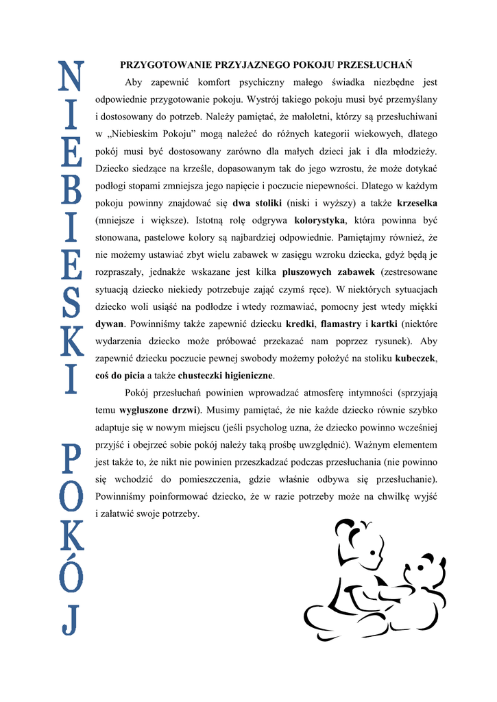 PRZYGOTOWANIE PRZYJAZNEGO POKOJU PRZESŁUCHAŃ Aby zapewnić komfort psychiczny małego świadka niezbędne jest odpowiednie przygotowanie pokoju. Wystrój takiego pokoju musi być przemyślany i dostosowany do potrzeb. Należy pamiętać, że małoletni, którzy są przesłuchiwani w „Niebieskim Pokoju” mogą należeć do różnych kategorii wiekowych, dlatego pokój musi być dostosowany zarówno dla małych dzieci jak i dla młodzieży. Dziecko siedzące na krześle, dopasowanym tak do jego wzrostu, że może dotykać podłogi stopami zmniejsza jego napięcie i poczucie niepewności. Dlatego w każdym pokoju powinny znajdować się dwa stoliki (niski i wyższy) a także krzesełka (mniejsze i większe). Istotną rolę odgrywa kolorystyka, która powinna być stonowana, pastelowe kolory są najbardziej odpowiednie. Pamiętajmy również, że nie możemy ustawiać zbyt wielu zabawek w zasięgu wzroku dziecka, gdyż będą je rozpraszały, jednakże wskazane jest kilka pluszowych zabawek (zestresowane sytuacją dziecko niekiedy potrzebuje zająć czymś ręce). W niektórych sytuacjach dziecko woli usiąść na podłodze i wtedy rozmawiać, pomocny jest wtedy miękki dywan. Powinniśmy także zapewnić dziecku kredki, flamastry i kartki (niektóre wydarzenia dziecko może próbować przekazać nam poprzez rysunek). Aby zapewnić dziecku poczucie pewnej swobody możemy położyć na stoliku kubeczek, coś do picia a także chusteczki higieniczne. Pokój przesłuchań powinien wprowadzać atmosferę intymności (sprzyjają temu wygłuszone drzwi). Musimy pamiętać, że nie każde dziecko równie szybko adaptuje się w nowym miejscu (jeśli psycholog uzna, że dziecko powinno wcześniej przyjść i obejrzeć sobie pokój należy taką prośbę uwzględnić). Ważnym elementem jest także to, że nikt nie powinien przeszkadzać podczas przesłuchania (nie powinno się wchodzić do pomieszczenia, gdzie właśnie odbywa się przesłuchanie). Powinniśmy poinformować dziecko, że w razie potrzeby może na chwilkę wyjść i załatwić swoje potrzeby.