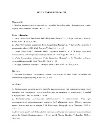 PEŁNY WYKAZ PUBLIKACJI Monografie: 1. Studium lingwistyczne i kulturologiczne rosyjskich frazeologizmów z komponentami сердце i душа, Łódź: Primum Verbum, 2013, s. 219. Prace redakcyjne: 1. „Acta Universitatis Lodziensis. Folia Linguistica Rossica”, z. 5: Język – kultura – historia, Łódź: Wyd. UŁ 2009, s. 210. 2. „Acta Universitatis Lodziensis. Folia Linguistica Rossica”, z. 7: Semantyka, stylistyka i pragmatyka tekstu, Łódź: Wyd. Primum Verbum 2011, s. 145. 3. „Acta Universitatis Lodziensis. Folia Linguistica Rossica”, z. 8: W kręgu zagadnień semntycznych, kulturologicznych i pragmatycznych, Łódź: Wyd. UŁ 2012, s. 118. 4. „Acta Universitatis Lodziensis. Folia Linguistica Rossica”, z. 9: Aktualne problemy semantyki i pragmatyki, Łódź: Wyd. UŁ 2013, s. 155. 5. W kręgu zagadnień semantyki i stylistyki tekstu, Łódź: Wyd. UŁ 2014, s. 428. Skrypty: 1. Rosyjska frazeologia i frazeografia. Skrypt z ćwiczeniami do nauki języka rosyjskiego dla studentów filologii rosyjskiej, Łódź 2012, s. 144. Artykuły: 1. Oсобенности тематического разряда фразеологизмов при характеристике мира пьяницы (на материале лексикографических разработок и анекдотов), Przegląd Rusycystyczny” 2001, nr 3 (95), s. 76–85. 2. Семантические особенности фразеологизмов с компонентом душа при положительной характеристике человека, [w:] Пiвденний архiв. Збiрник наукових праць. Фiлологiчнi науки, випуск XVI, Uniwersytet Pedagogiczny w Chersoniu, 2002, s. 124–128. 3. „Co w duszy gra?” czyli kilka refleksji na temat rosyjskich frazeologizmów z rzeczownikiem dusza, [w:] Studia Słowianoznawcze, t. 3, pod red. B. Muchy, Piotrków Trybunalski 2002, s. 269–280. 4. Пьяные слова, „Beiträge zur Slavistik”, t.XLVII: Слово в тексте, переводе и словаре, pod red. K. Bajora, J. Wierzbińskiego, Frankfurt/M. Etc. 2002, s. 415–426. 5. Funkcjonowanie rosyjskich jednostek frazeologicznych charakteryzujących człowieka szczerego i otwartego, „Acta Universitatis Lodziensis. Folia Linguistica Rossica” 2003, z. 1, s. 51–65. 6. Несколько замечаний о душе в свете данных русской фразеологии, [w:] Świat Słowian w języku i kulturze IV, pod red. E. Komorowskiej, Ż. Kozickiej-Borysowskiej, Szczecin 2003, s. 214–221. 7. Rosyjskie frazeologizmy z komponentem ‘душa’ jako zwierciadło wierzeń i religii, [w:] Perspektywy dyskursu religijnego, czyli przyjęcie Kaina. Język a komunikacja 5, tom 2, pod red. P. Chruszczewskiego, Kraków 2004, s. 205–224. 8. Любители алкоголя в русских и польских анекдотах, [w:] „Język rosyjski w konfrontacji z językami Europy w aspekcie lingwokulturoznawczym”, pod red. P. Czerwińskiego i H. Fontańskiego, Katowice 2004, s. 312–326. 9. Refleksje dotyczące świata wewnętrznego człowieka w rosyjskiej frazeologii (relacje synonimiczne między wybranymi jednostkami), [w:] Aktualne problemy semantyki i stylistyki tekstu. Studia komparatywne i opisowe, pod red. J. Wierzbińskiego, Łódź 2004, s. 263–272. 10. Kilka refleksji związanych z pojęciem ‘сердце’ w języku rosyjskim, [w:] Świat Słowian w języku i kulturze V, pod red. E. Komorowskiej, A. Krzanowskiej, Szczecin 2004, s. 172–178. 11. Motywacja jednostek frazeologicznych z komponentami serce i dusza, [w:] Język a rzeczywistość. Rusycystyczne studia konfrontatywne, pod red. P. Czerwińskiego i H. Fontańskiego, Katowice 2005, s. 234–245. 12. Rozważania o motywacji jednostek frazeologicznych, [w:] Studia Słowianoznawcze, t. 5 pod red. B. Muchy, t. 5, Piotrków Trybunalski 2005, s. 295–322. 13. Przegląd rosyjskich jednostek językowych związanych z tematyką bachiczną, [w:] Studia Słowianoznawcze, t. 5, pod red. B. Muchy, t. 5, Piotrków Trybunalski 2005, s. 323–336. 14. O jednostce frazeologicznej w świetle rosyjskich i polskich koncepcji lingwistycznych (szkic informacyjny), [в:] Studia Polono-Ruthenica: Сборник научных работ памяти профессора Aльберта Бартошевича, под ред. Г. A. Николаева, Kазань 2005, s. 157–165. 15. Wyobrażenia związane z pojęciem ‘сeрдцe’ w świetle rosyjskich frazeologizmów, „Acta Universitatis Lodziensis. Folia Linguistica Rossica” 2006, z. 2, s. 121–132. 16. Rozważania o synonimach i wariantach we frazeologii, [w:] Świat Słowian w języku i kulturze VII, pod red. E. Komorowskiej, D. Dziadosz, Szczecin 2006, s. 205–209. 17. Frazeologiczne opracowania leksykograficzne w kontekście kształtowania kompetencji językowej, komunikacyjnej i interkulturowej, [w:] Interdyscyplinarność w glottodydaktyce. Język – literatura – kultura pod red. U. Malinowskiej, Płock 2007, s. 243–249. 18. Wyobrażenia o sercu i duszy w świetle ustabilizowanych jednostek językowych, „Acta Universitatis Lodziensis. Folia Linguistica Rossica” 2007, z. 3, s. 115–127. 19. Способы понимани ятермина „фразеология” в теории и лексикографической практике, [w:] Świat Słowian w języku i kulturze VII, pod red. E. Komorowskiej, A. Krzanowskiej, Szczecin 2007, s. 199–206. 20. Dusza w języku i kulturze, „Acta Universitatis Lodziensis. Folia Linguistica Rossica” 2008, z. 4, s. 119–135. 21. Представления о сердце и душе в свете устойчивых словосочетаний русского языка, [w:] Стил 8, Београд 2009, s. 253–263. 22. Miejsce frazeologii w nauczaniu języka a konteksty interdyscyplinarne (na przy