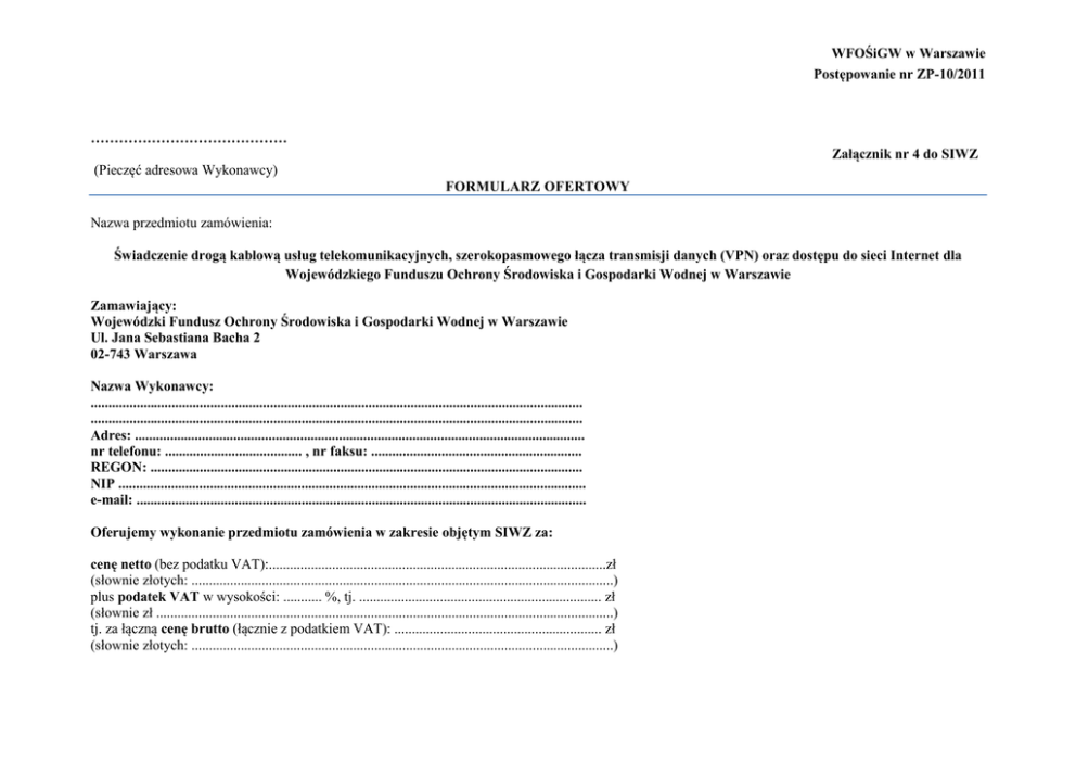 WFOŚiGW w Warszawie Postępowanie nr ZP-10/2011 …………………………………… Załącznik nr 4 do SIWZ (Pieczęć adresowa Wykonawcy) FORMULARZ OFERTOWY Nazwa przedmiotu zamówienia: Świadczenie drogą kablową usług telekomunikacyjnych, szerokopasmowego łącza transmisji danych (VPN) oraz dostępu do sieci Internet dla Wojewódzkiego Funduszu Ochrony Środowiska i Gospodarki Wodnej w Warszawie Zamawiający: Wojewódzki Fundusz Ochrony Środowiska i Gospodarki Wodnej w Warszawie Ul. Jana Sebastiana Bacha 2 02-743 Warszawa Nazwa Wykonawcy: ............................................................................................................................................ ............................................................................................................................................ Adres: ................................................................................................................................ nr telefonu: ....................................... , nr faksu: ............................................................ REGON: ........................................................................................................................... NIP ..................................................................................................................................... e-mail: ................................................................................................................................ Oferujemy wykonanie przedmiotu zamówienia w zakresie objętym SIWZ za: cenę netto (bez podatku VAT):................................................................................................zł (słownie złotych: ........................................................................................................................) plus podatek VAT w wysokości: ........... %, tj. ..................................................................... zł (słownie zł ..................................................................................................................................) tj. za łączną cenę brutto (łącznie z podatkiem VAT): ........................................................... zł (słownie złotych: ........................................................................................................................) WFOŚiGW w Warszawie Postępowanie nr ZP-10/2011 Tabela nr 1: Usługa telefoniczna Lp. 1 1. Lokalizacja technologia 3 022 843 69 45 4 analogowa 2. 022 843 69 95 analogowa 24 3. 022 843 76 09 analogowa 24 4. 022 847 96 93 analogowa 24 022 847 97 49 analogowa 24 6. 022 853 24 14 analogowa 24 7. 022 853 28 18 analogowa 24 8. 022 853 37 42 analogowa 24 9. 022 853 53 02 analogowa 24 10. 022 853 53 17 analogowa 24 11. 022 853 53 21 analogowa 24 12. 022 843 08 42 analogowa 24 5. 2 Numer abonencki Wartość abonamentu telefonicznego brutto w zł (1) 02-743 Warszawa ul. J. S. Bacha 2 5 Planowana liczba abonentów miesięcznych w okresie świadczenia usługi (od 01.01.2012 r. do 31.12.2013 r.) 6 24 Razem wartość w okresie świadczenia usługi (od 01.01.2012 r. do 31.12.2013 r.) brutto w zł (2) [5x6] 7 WFOŚiGW w Warszawie Postępowanie nr ZP-10/2011 06-400 Ciechanów 023 672 14 69 ISDN 24 ul. Mickiewicza 7 023 674 36 23 nr podrzędny (MSN) 24 14. 023 672 48 77 analogowa 24 15. 023 673 23 36 ISDN 24 13. 16. 09-400 Płock 024 264 19 34 analogowa 24 17. ul. Małachowskiego 8 024 264 19 87 analogowa 24 024 264 19 94 ISDN 24 18. 19. 08-110 Siedlce 025 644 15 40 analogowa 24 20. ul. Asłanowicza 18 025 644 54 21 ISDN 24 025 644 10 45 nr podrzędny (MSN) 24 21. 07-400 Ostrołęka 029 760 03 32 analogowa 24 22. ul. Piłsudskiego 38 029 760 83 50 analogowa 24 23. 26-600 Radom 048 360 78 33 ISDN 24 24. ul. Grzybowska 4/6 048 364 49 10 ISDN 24 048 366 93 47 analogowa 24 25. Razem (suma wierszy 1-25 z kolumny 7): (1) – Koszty dodatkowe (np.: instalacja, kupno/dzierżawa niezbędnych urządzeń do świadczenia usługi i inne) należy rozłożyć w abonamencie. WFOŚiGW w Warszawie Postępowanie nr ZP-10/2011 (2) – Wartość abonamentów brutto w okresie świadczenia usług telekomunikacyjnych w okresie od 01.01.2012 do 31.12.2013 r. jest iloczynem wartości brutto abonamentu telefonicznego z kolumny 5 i planowaną ilością abonamentów z kolumny 6. Tabela nr 2: Szerokopasmowe łącze transmisji danych wraz z dostępem do sieci Internet Lp. Lokalizacja 1 2 1. CENTRUM + INTERNET 2. LINK 3. LINK 4. LINK 5. LINK 6. LINK Miejscowość 3 Centrala 02-743, Warszawa ul. J. S. Bacha 2 WZ w Ciechanowie 06-400, Ciechanów ul. Mickiewicza 7 WZ w Płocku 09-400, Płock ul. Małachowskiego 8 WZ w Siedlcach 08-110, Siedlce ul. Asłanowicza 18 WZ w Ostrołęce 07-410, Ostrołęka ul. Gorbatowa 16 WZ w Radomiu 26-600, Radom ul. Grzybowska 4/6 Łącze asymetryczne o przepustowości do/od [kbit/s] 4 Wartość abonamentu na usługę transmisji danych wraz z dostępem do sieci Internet w zł (1) 5 Planowana liczba abonamentów miesięcznych w okresie świadczenia usługi (od 01.01.2012 do 31.12.2013 r.) 6 4096/4096 24 2048/512 24 2048/512 24 2048/512 24 2048/512 24 2048/512 24 Razem wartość w okresie świadczenia usługi (od 01.01.2012 do 31.12.2013 r.) brutto w zł (2) [5x6] 7 Razem (suma wierszy 1-6 z kolumny 7): (1) – Koszty dodatkowe (np.: instalacja, kupno/dzierżawa niezbędnych urządzeń do świadczenia usługi i inne) należy rozłożyć w abonamencie. WFOŚiGW w Warszawie Postępowanie nr ZP-10/2011 (2) – Wartość abonamentów brutto w okresie świadczenia usługi szerokopasmowego łącza transmisji danych wraz z dostępem do Internetu w okresie od 01.01.2012 do 31.12.2013 r. jest iloczynem wartości brutto abonamentu z kolumny 5 i planowaną ilością abonamentów z kolumny 6. Tabela nr 3: Usługa dostępu do Internetu Lp. 1 1. Lokalizacja 2 Centrala 02-743, Warszawa ul. J. S. Bacha 2 Technologia 3 Oferowana przepustowość od/do [kbit/s] Wartość abonamentu na
