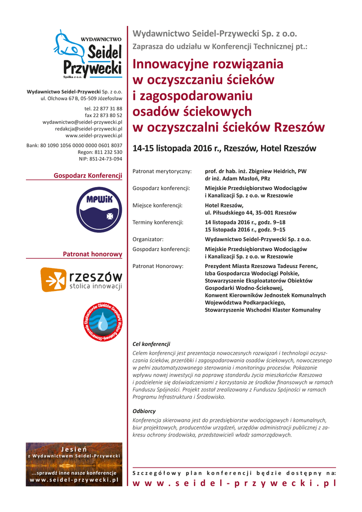 Wydawnictwo Seidel-Przywecki Sp. z o.o. Zaprasza do udziału w Konferencji Technicznej pt.: Wydawnictwo Seidel-Przywecki Sp. z o.o. ul. Olchowa 67 B, 05-509 Józefosław tel. 22 877 31 88 fax 22 873 80 52 [email protected] [email protected] www.seidel-przywecki.pl Bank: 80 1090 1056 0000 0000 0601 8037 Regon: 811 232 530 NIP: 851-24-73-094 Gospodarz Konferencji Patronat honorowy Innowacyjne rozwiązania w oczyszczaniu ścieków i zagospodarowaniu osadów ściekowych w oczyszczalni ścieków Rzeszów 14-15 listopada 2016 r., Rzeszów, Hotel Rzeszów Patronat merytoryczny: prof. dr hab. inż. Zbigniew Heidrich, PW dr inż. Adam Masłoń, PRz Gospodarz konferencji: Miejskie Przedsiębiorstwo Wodociągów i Kanalizacji Sp. z o.o. w Rzeszowie Miejsce konferencji: Hotel Rzeszów, ul. Piłsudskiego 44, 35-001 Rzeszów Terminy konferencji: 14 listopada 2016 r., godz. 9–18 15 listopada 2016 r., godz. 9–15 Organizator: Wydawnictwo Seidel-Przywecki Sp. z o.o. Gospodarz konferencji: Miejskie Przedsiębiorstwo Wodociągów i Kanalizacji Sp. z o.o. w Rzeszowie Patronat Honorowy: Prezydent Miasta Rzeszowa Tadeusz Ferenc, Izba Gospodarcza Wodociągi Polskie, Stowarzyszenie Eksploatatorów Obiektów Gospodarki Wodno-Ściekowej, Konwent Kierowników Jednostek Komunalnych Województwa Podkarpackiego, Stowarzyszenie Wschodni Klaster Komunalny Cel konferencji Celem konferencji jest prezentacja nowoczesnych rozwiązań i technologii oczyszczania ścieków, przeróbki i zagospodarowania osadów ściekowych, nowoczesnego w pełni zautomatyzowanego sterowania i monitoringu procesów. Pokazanie wpływu nowej inwestycji na poprawę standardu życia mieszkańców Rzeszowa i podzielenie się doświadczeniami z korzystania ze środków finansowych w ramach Funduszu Spójności. Projekt został zrealizowany z Funduszu Spójności w ramach Programu Infrastruktura i Środowisko. Odbiorcy Konferencja skierowana jest do przedsiębiorstw wodociągowych i komunalnych, biur projektowych, producentów urządzeń, urzędów administracji publicznej z zakresu ochrony środowiska, przedstawicieli władz samorządowych. Jesień z Wydawnictwem Seidel-Przywecki ...sprawdź inne nasze konferencje w w w.seidel - prz y wecki.pl S z c z e g ó ł o w y p l a n k o n f e r e n c j i b ę d z i e d o s t ę p n y n a: w w w . s e i d e l - p r z y w e c k i . p l Zmodernizowana Oczyszczalnia ścieków w Rzeszowie Oczyszczalnię Ścieków Miejskiego Przedsiębiorstwa Wodociągów i Kanalizacji w Rzeszowie oddano do eksploatacji w 1988 r. Została ona zaprojektowana na przepływ 62 500 m3/d, tj. ok. 400 tys. RLM. W 2013 r. opracowano projekt modernizacji ciągu biologicznego oczyszczania ścieków, zakładający pełne usuwanie związków biogennych. Po rozbudowie i modernizacji zakończonej w 2015 r. średni dobowy przepływ (Qśr d) wynosi 54 500 m3/d (RLM 398 tys.). Technologia oczyszczania ścieków zakłada pełne mechaniczno-biologiczne oczyszczanie ścieków wraz z usuwaniem substancji biogennych. Oczyszczalnia składa się z następujących ciągów technologicznych: • Oczyszczanie mechaniczne: −− usuwanie zanieczyszczeń stałych w hali krat, na kratach schodkowych i prasopłuczce skratek; −− usuwanie piasku w dwukomorowych piaskownikach i odwadnianie; −− dwa zhermetyzowane piaskowniki dwukomorowe; −− zespół urządzeń do odwadniania piasku; −− usuwanie zawiesiny w osadnikach wstępnych, z odprowadzaniem osadu surowego do grawitacyjnego zagęszczacza osadu; −− dwa osadniki wstępne radialne, o średnicy 40 m. • Zbiornik retencyjny ścieków opadowych o pojemności całkowitej 6845 m3. • Stacja zlewna nieczystości ciekłych dowożonych do oczyszczalni wozami asenizacyjnymi. Stacja wyposażona jest w przepływomierz elektromagnetyczny do pomiaru ilości nieczystości ciekłych. • Oczyszczanie biologiczne oparte jest o proces denitryfikacji wyprzedzającej i nitryfikacji w układzie Bardenpho. System obejmuje dwa ciągi oczyszczania, złożone z: −− komory defosfatacji – wspólnej dla dwóch ciągów; −− komór predenitryfikacji (po 2 komory przypisane do danego ciągu). Osad recyrkulowany z osadników wtórnych miesza się ze ściekami surowymi; −− 2 równoległych komóry denitryfikacji, ścieki i osad mieszają się tu ze ściekami zawracanymi z końca komór napowietrzania; −− 2 równoległych komór nitryfikacji, napowietrzanych, pracujących w warunkach tlenowych; −− 2 niezależnych dla każdego ciągu pompowni ścieków recyrkulowanych, recyrkulacja wewnętrzna realizowana jest przy pomocy mieszadeł pompujących; −− systemów napowietrzania drobnopęcherzykowego przy zastosowaniu dyfuzorów membranowych zainstalowanych w strefach napowietrzania komór biologicznych; −− kanału zbiorczego, którym ścieki odbierane z komór napowietrzania kierowane są, poprzez komorę rozdzielczą, do czterech osadników wtórnych; −− pompowni osadu recyrkulowanego i nadmiernego, gdzie kierowany jest osad czynny; −− 2 przewodów, którymi osad zawracany jest do wydzielonych komór predenitryfikacji (osad nadmierny odprowadzany jest do istniejącej stacji zagęszczania osadu nadmiernego); – 4 radialnych osadników wtórnych. • W części biologicznej oczyszczalni znajdują się też: stacja koagulanta, rozdzielacz ścieków i osadów, koryto pomiarowe ścieków oczyszczonych, pompownia powodziowa, pompownia części pływających oraz pompownie osadu recyrkulowanego i nadmiernego. • Przeróbka osadów ściekowych, wstępnego i nadmiernego po zagęszczeniu, oparta jest o proces fermentacji mezofilowej, przebiegający w temperaturze 34÷38°C, w czterech zamkniętych wydzielonych komorach fermentacyjnych (WKF) o pojemności czynnej 2×2290 i 2×2234 m3. Ciąg technologiczny przeróbki osadów obejmuje też: −− stację zlewczą tłuszczy wraz z pompownią, zwiększającą produkcję biogazu; −− 2 maceratory; −− biofiltr zapachów; −− słoneczną sus