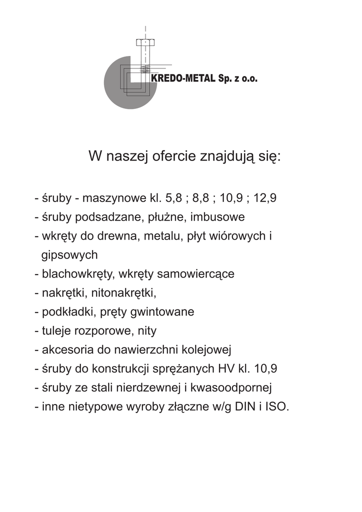 KREDO-METAL Sp. z o.o. W naszej ofercie znajdują się: - śruby - maszynowe kl. 5,8 ; 8,8 ; 10,9 ; 12,9 - śruby podsadzane, płużne, imbusowe - wkręty do drewna, metalu, płyt wiórowych i gipsowych - blachowkręty, wkręty samowiercące - nakrętki, nitonakrętki, - podkładki, pręty gwintowane - tuleje rozporowe, nity - akcesoria do nawierzchni kolejowej - śruby do konstrukcji sprężanych HV kl. 10,9 - śruby ze stali nierdzewnej i kwasoodpornej - inne nietypowe wyroby złączne w/g DIN i ISO. SPIS TREŚCI 1. 3 2. 6 3. 9 4. 5. 6. - 19 7. 8. - 22 9. 10. 11. - 31 Śruby .......................................................................................................................str. 1 Nakrętki ...................................................................................................................str. 4 Podkładki .................................................................................................................str. 7 Zawleczki ................................................................................................................str. 10 Kołki i wpusty .........................................................................................................str. 11 Wkręty: ....................................................................................................................str. 12 a. dociskowe ........................................................................................str. 12 b. do metalu .........................................................................................str. 13 samogwintujące do blach .................................................................str. 14 c. d. do drewna ........................................................................................str. 15 e. do płyt wiórowych, drewna i tworzyw sztucznych .........................str. 16 f. samowiercące .................................................................................str. 17 g. samowiercące do pokryć dachowych ..............................................str. 18 h. do mocowania płyt gipsowo kartonowych ......................................str. 19 Wkręty i łączniki okienne ........................................................................................str. 20 Nity: .........................................................................................................................str. 21 a. nity zrywalne ...................................................................................str. 21 b. nity pełne i drążone .........................................................................str. 22 Nitonakrętki: ............................................................................................................str. 23 Gwoździe .................................................................................................................str. 24 Kołki: .......................................................................................................................str. 25 a. kołki do płyt gipsowo kartonowych ................................................str. 25 - 26 b. kołki rozporowe futrynowe .............................................................str. 27 c. kołki rozporowe szybkomocujące ...................................................str. 28 d. kołki rozporowe ..............................................................................str. 29 e. kołki rozporowe z wkrętami i haczykami .......................................str. 30 Kołki i kotwy metalowe rozporowe ........................................................................str. 31 Asortyment uzupełniający dla stolarzy ...................................................................str. 32 - 12. 13. 33 14. Nawierzchnia kolejowa ...........................................................................................str. 34 - 35 15. Złącza ciesielskie firmy SIMPSON STRONG - TIE ..............................................str. 36 16. Zestawy śrubowe do połączeń sprężanych ..............................................................str. 37 - 38 17. Elementy złączne według PN - DIN ........................................................................str. 39 - 40 18. Elementy złączne, konwersja DIN - PN - ISO ........................................................str. 41 19. Elementy złączne według polskich norm ................................................................str. 42 20. Orientacyjny ciężar śrub ..........................................................................................str. 43 - 46 Śruby Nazwa Śruba z łbem sześciokątym z gwintem na części długości trzpienia kl. wł. mech. 5.6, 5.8, 8.8, 10.9, 12.9 Norma PN-85/M-82101 DIN 931 ISO 4014 DIN 960 ISO 8765 KREDO-METAL Sp. z o.o. Rysunek Zakres M5 - M48 M3 - M48 Śruba z łbem sześciokątym z gwintem na całej długości trzpienia kl. wł. mech. 5.6, 5.8, 8.8, 10.9, 12.9 Śruba z łbem walcowym z gniazdem sześciokątnym – imbusowa kl. wł. mech. 8.8, 10.9, 12.9 PN-85/M-82105 DIN 933 ISO 4017 DIN 961 ISO 8676 M3 - M48 PN-87/M-82302 DIN 912 ISO 4762 M4 – M36 DIN 6912 M3 – M24 DIN 7984 M3 - M24 DIN 7991 M3 - M12 Śruba z łbem stożkowym z gniazdem sześciokątnym kl. wł. mech.8.8, 10.9 ISO 7380 M5 – M8 Śruba z łbem kulistym z gniazdem sześciokątnym kl. wł. .mech. 10.9 ISO 7380 Śruba z łbem walcowym z gniazdem sześciokątnym z obniżonym łbem kl. wł. mech. 8.8, 10.9, 12.9 Śruba z łbem walcowym z gniazdem sześciokątnym z obniżonym łbem kl. wł. mech. 8.8, 10.9, 12.9 Śruba z łbem kulistym z gniazdem sześciokątnym z podkładką pod łbem kl. wł. .mech. 10.9 Śruba z łbem grzybkowym z podsadzeniem – ( zamkowa ) kl. wł. mech .4.8, 8.8 M5 - M24 PN-87/M-82406 DIN 603 ISO 8677 M5 - M20 PN-87/M-82402 DIN 605 M4 x 1,25 M16 x 1,5 M20 x 1,5 Śruba z łbem stożkowym z podsadzeniem – ( płużna ) kl. wł. mech. .4.8, 8.8, 10.9 M3 - M24 Śruba stopy gąsienicy k