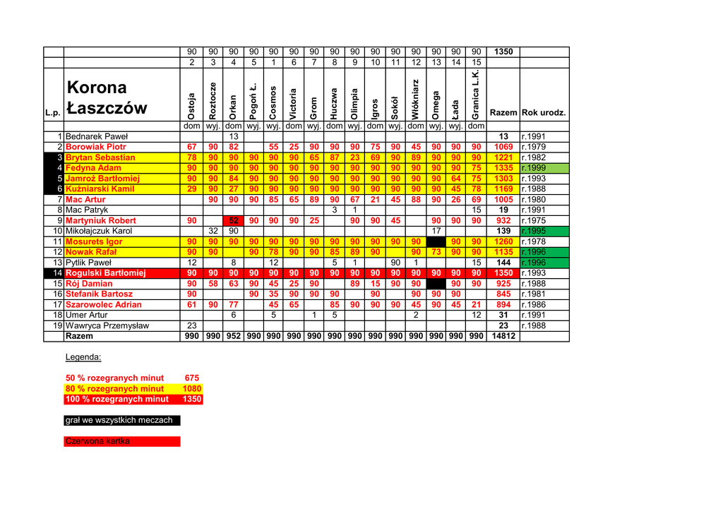 1 2 3 4 5 6 7 8 9 10 11 12 13 14 15 16 17 18 19 Bednarek Paweł Borowiak Piotr Brytan Sebastian Fedyna Adam Jamroż Bartłomiej Kuźniarski Kamil Mac Artur Mac Patryk Martyniuk Robert Mikołajczuk Karol Mosurets Igor Nowak Rafał Pytlik Paweł Rogulski Bartłomiej Rój Damian Stefanik Bartosz Szarowolec Adrian Umer Artur Wawryca Przemysław Razem 90 3 90 4 90 5 90 1 90 6 90 7 90 8 90 9 90 10 90 11 90 12 90 13 90 14 90 15 Ostoja Roztocze Orkan Pogoń Ł. Cosmos Victoria Grom Huczwa Olimpia Igros Sokół Włókniarz Omega Łada Granica L.K. L.p. Korona Łaszczów 90 2 dom wyj. dom 13 67 90 82 78 90 90 90 90 90 90 90 84 29 90 27 90 90 90 90 90 12 90 90 90 61 grał we wszystkich meczach Czerwona kartka 90 58 90 52 90 90 8 90 63 77 6 675 1080 1350 Razem Rok urodz. wyj. wyj. dom wyj. dom wyj. dom wyj. dom wyj. wyj. dom 90 90 90 90 90 55 90 90 90 90 85 25 90 90 90 90 65 90 65 90 90 90 89 90 90 90 25 90 90 90 78 12 90 45 35 45 5 90 90 90 90 90 25 90 65 90 90 90 90 90 90 90 87 90 90 90 90 3 90 85 5 90 90 85 5 90 23 90 90 90 67 1 90 75 69 90 90 90 21 90 90 90 90 90 45 90 45 90 89 1 90 89 90 90 90 90 90 15 90 90 90 90 90 90 45 89 90 90 90 88 90 90 1 90 90 90 45 2 90 90 90 90 90 90 90 90 90 64 45 26 90 17 90 73 90 90 90 90 90 90 90 90 45 1 23 990 990 952 990 990 990 990 990 990 990 990 990 990 990 Legenda: 50 % rozegranych minut 80 % rozegranych minut 100 % rozegranych minut 32 90 90 1350 13 1069 1221 1335 1303 1169 1005 19 932 139 90 1260 90 1135 15 144 90 1350 90 925 845 21 894 12 31 23 990 14812 90 90 75 75 78 69 15 90 r.1991 r.1979 r.1982 r.1999 r.1993 r.1988 r.1980 r.1991 r.1975 r.1995 r.1978 r.1996 r.1996 r.1993 r.1988 r.1981 r.1986 r.1991 r.1988 pauza po żółtych lub czerwonych kartkach Młodzieżowiec Junior