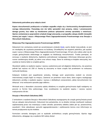 Dokumenty potrzebne przy nabyciu ziemi Kupno nieruchomości praktycznie w każdym wypadku wiąże się z koniecznością skompletowania szeregu dokumentów. Pozwalają one nie tylko sprawdzić stan prawny, status i przeznaczenie danego gruntu, lecz także są nieodzowne podczas spisywania umowy sprzedaży u notariusza. Oprócz omówionej w poprzednim artykule księgi wieczystej, w przypadku zakupu działki niezwykle istotny jest wypis i wyrys z Miejscowego Planu Zagospodarowania Przestrzennego oraz Decyzja o Warunkach Zabudowy. Miejscowy Plan Zagospodarowania Przestrzennego (MPZP) Dokument ten omówiony został we wcześniejszym artykule (link), warto dodać tutaj jednak, ze jest on niezbędny do uzyskania pozwolenia na budowę. Chcielibyśmy też wyjaśnić pokrótce, jak uzyskać wypis i wyrys z Miejscowego Planu Zagospodarowania Przestrzennego. W tym celu należy udać się do urzędu gminy/miasta właściwego ze względu na lokalizację nieruchomości. Trzeba pamiętać, że wnosząc o wydanie dokumentu, będziemy potrzebować następujące informacje dotyczące gruntu: numer ewidencyjny działki, jej adres oraz arkusz mapy. Dane te widnieją w księdze wieczystej, lecz uzyskać je można także w urzędzie gminy. Wysokość opłaty za wydanie wypisu i wyrysu uzależniona jest od objętości dokumentu, nie powinna jednak być wyższa niż 250 zł. Kwotę tę uiszczamy w kasie urzędu lub przelewem na wskazany rachunek bankowy. Kolejnym krokiem jest wypełnienie wniosku, którego wzór powinniśmy znaleźć na stronie internetowej urzędu bądź na miejscu. Zawierać on powinien nasze dane, dane organu wydającego dokument, prośbę o wydanie wypisu i wyrysu z dokładnym oznaczeniem, jakiej nieruchomości ma dotyczyć oraz wskazanie sposobu jego odbioru. Wniosek wraz z dowodem uiszczenia opłaty składamy w urzędzie gminy/miasta bądź nadajemy na poczcie w formie listu poleconego. Czas oczekiwania na wydanie wypisu i wyrysu wynosi maksymalnie 30 dni. Decyzja o Warunkach Zabudowy (WZ) Z wnioskiem o wydanie Decyzji o Warunkach Zabudowy występujemy do urzędu gminy/miasta przed lub po zakupie nieruchomości. Dokument ten potwierdza, że na działce istnieje możliwość realizacji zaplanowanej przez nas inwestycji a także określa: parametry obiektu (takie jak np. powierzchnia, wysokość i linie zabudowy), warunki zagospodarowania i użytkowania terenu oraz informacje na temat przyłączenia się do mediów. Formularz wniosku dostępny jest w wydziale architektury urzędu gminy/miasta. Oprócz tego dokumentu, ubiegając się o wydanie WZ należy złożyć: - kopię mapy zasadniczej do celów opiniodawczych. Powinna ona obejmować cały teren nieruchomości oraz jej najbliższego sąsiedztwa (tj. w promieniu 30 metrów). Na kopii należy obrysować granice działki oraz i zaznaczyć zarys planowanej zabudowy. - wypis z rejestru gruntów – istotny z tego względu, iż informuje on, czy w granicach działki położone są grunty leśne/rolne (aby stwierdzić, czy teren należy wyłączyć spod produkcji leśnej/rolnej). Dokument określa ponadto powierzchnię nieruchomości. Wypis zawierać też może dane właściciela, wysokość jego udziału w gruncie a także informacje np. o przysługującej/ciążącej służebności. O dokument ten wnioskujemy w wydziale geodezji urzędu gminy/miasta. - zapewnienia dostawy mediów (wstępne) – wymagane zazwyczaj wyłącznie w przypadku dużych inwestycji a także wtedy, gdy planowany budynek będzie znacznie oddalony od istniejących już zabudowań. Z uwagi na dość skomplikowane procedury, o pomoc w dopełnieniu tych formalności (o ile będzie to konieczne) radzimy poprosić architekta zajmującego się tworzeniem projektu budynku. Należy podkreślić, że wypełnienie wniosku o wydanie WZ wiąże się z koniecznością określenia wizji planowanej inwestycji. Dotyczy to przybliżonego sposobu zagospodarowania działki (np. czy oprócz domu chcemy wybudować też obiekt gospodarczy, garaż wolnostojący itp.) i sprecyzowania, czy nasze zamiary wpłyną na środowisko przyrodnicze (np. ile drzew chcielibyśmy wyciąć, ustalenie poziom hałasu związanego z budową warsztatu itp.). Naturalnie, konieczne jest też ustalenie wielkość budynku, rodzaju i liczby pomieszczeń, szacunkowo określonej ilości zużywanej wody oraz energii, ilość ścieków a także odpadów. Dzięki tym danym urząd będzie w stanie ustalić, czy istniejące sieci są wystarczające, aby obsłużyć inwestycję.