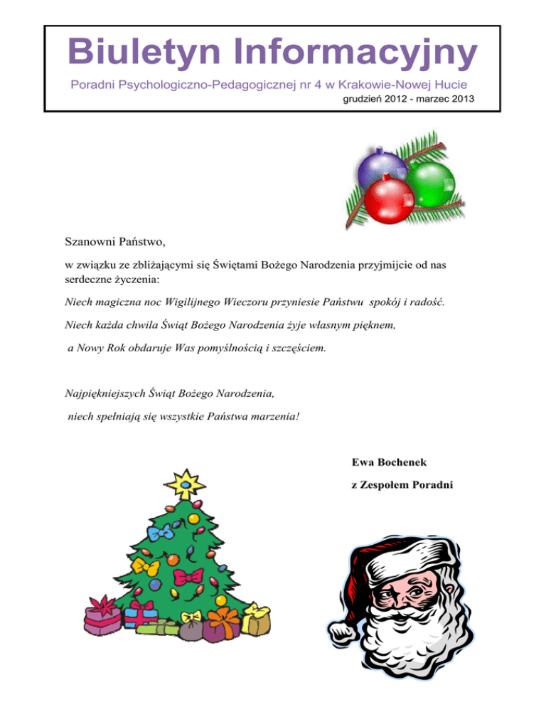 Biuletyn Informacyjny Poradni Psychologiczno-Pedagogicznej nr 4 w Krakowie-Nowej Hucie grudzień 2012 - marzec 2013 Szanowni Państwo, w związku ze zbliżającymi się Świętami Bożego Narodzenia przyjmijcie od nas serdeczne życzenia: Niech magiczna noc Wigilijnego Wieczoru przyniesie Państwu spokój i radość. Niech każda chwila Świąt Bożego Narodzenia żyje własnym pięknem, a Nowy Rok obdaruje Was pomyślnością i szczęściem. Najpiękniejszych Świąt Bożego Narodzenia, niech spełniają się wszystkie Państwa marzenia! Ewa Bochenek z Zespołem Poradni Biuletyn Informacyjny Poradni Psychologiczno-Pedagogicznej nr 4 w Krakowie-Nowej Hucie Na zakończenie Roku Janusza Korczaka Rok 2012 był dla wielu szkół i placówek noszących imię Janusza Korczaka wyjątkowy – włączały się w jego obchody, organizowały konferencje, prezentacje dorobku, wystawy itp. W Krakowie w ramach obchodów Roku Janusza Korczaka odbyła się m.in. Konferencja zorganizowana przez p. Marka Michalaka – Rzecznika Praw Dziecka pt. „O prawie dziecka do rozwoju”. W programie artystycznym Konferencji wzięły udział dzieci przedszkoli i szkolne oraz młodzież Liceum Ogólnokształcącego Nr 2 im. Jana III Sobieskiego w ciekawy sposób przedstawiając Inscenizację Sądu Koleżeńskiego pt. „Prawa dziecka przed Sądem”. Część naukowa Konferencji obejmowała tematykę podmiotowego traktowania dziecka, prawa dziecka do rozwoju, do ochrony zdrowia, odpowiedniego wychowania itp. Poradnia, tak jak i inne placówki Korczakowskie, otrzymała od Rzecznika Praw Dziecka dwie pozycje książkowe: Prawidła życia Janusza Korczaka oraz Z Korczakiem przez życie Michała Wróblewskiego. Pierwsza z nich to humorystyczny przewodnik po zasadach rządzących światem i choć powstała wiele lat temu, treść i wątpliwości towarzyszące młodemu człowiekowi, który odkrywa świat, pozostają aktualne. Natomiast książka Michała Wróblewskiego jest osobistą relacją autora z jego spotkania ze Starym Doktorem w czasie kilkuletniego pobytu w Domu Sierot. Autorowi dane było poznać wyjątkowe metody wychowawcze Korczaka oraz niezwykłą atmosferę tego Domu. Publikację wydali Jego synowie pragnąc, aby została przekazana do wszystkich placówek w Polsce noszących imię Janusza Korczaka. Autor przytacza w niej wspomnienia wychowanków, którzy mieli szczęście znać Doktora osobiście i są wdzięczni losowi za to, iż w różnych okresach trafili do Jego Domu na Krochmalną. Wszyscy po latach mówili o Nim z miłością i czcią. Jeden z nich tak po latach podsumował swoje spotkanie z Doktorem: „Korczak dał najważniejsze: dobry, solidny fundament. Nawet jak dom się spali lub zostanie zburzony, to na takim fundamencie można zawsze zbudować nowy. Fundament – jest najważniejszy”. W zakończeniu książki autor przytacza 5 nakazów i 5 zakazów, jakie sformułował Korczak: „Nie bij. Nie zawstydzaj, nie strasz, nie krzycz, nie lekceważ; pocałuj, przytul, pochwal, posłuchaj, pociesz.” Myśli Korczaka, Jego koncepcje i rozwiązania pedagogiczne na całym świecie są pogłębiane i przymierzane do nowych czasów. One nie zestarzały się i nawet w naszej skomercjalizowanej epoce mogą działać jak katalizator w wyzwalaniu dobra i prawdziwego humanizmu, czego świadectwem jest stale aktualna sformułowana przez Korczaka „Prośba Twojego dziecka”. 2 Biuletyn Informacyjny Poradni Psychologiczno-Pedagogicznej nr 4 w Krakowie-Nowej Hucie Prośba Twojego Dziecka Nie psuj mnie. Dobrze wiem, że nie powinienem mieć tego wszystkiego, czego się domagam. To tylko próba sił z mojej strony. Nie bój się stanowczości. Właśnie tego potrzebuję – poczucia bezpieczeństwa. Nie bagatelizuj moich złych nawyków. Tylko ty możesz pomóc mi zwalczyć zło, póki jest to jeszcze w ogóle możliwe. Nie rób ze mnie większego dziecka, niż jestem. To sprawia, że przyjmuję postawę głupio dorosłą. Nie zwracaj mi uwagi przy innych ludziach, jeśli nie jest to absolutnie konieczne. O wiele bardziej przejmuję się tym, co mówisz, jeśli rozmawiamy w cztery oczy. Nie chroń mnie przed konsekwencjami. Czasami dobrze jest nauczyć się rzeczy bolesnych i nieprzyjemnych. Nie wmawiaj mi, że błędy, które popełniam, są grzechem. To zagraża mojemu poczuciu wartości. Nie przejmuj się za bardzo, gdy mówię, że cię nienawidzę. To nie ty jesteś moim wrogiem, lecz twoja miażdżąca przewaga! Nie zwracaj zbytniej uwagi na moje drobne dolegliwości. Czasami wykorzystuję je, by przyciągnąć twoją uwagę. Nie zrzędź. W przeciwnym razie muszę się przed tobą bronić i robię się głuchy. Nie dawaj mi obietnic bez pokrycia. Czuję się przeraźliwie tłamszony, kiedy nic z tego wszystkiego nie wychodzi. Nie zapominaj, że jeszcze trudno mi jest precyzyjnie wyrazić myśli. To dlatego nie zawsze się rozumiemy. Nie sprawdzaj z uporem maniaka mojej uczciwości. Zbyt łatwo strach zmusza mnie do kłamstwa. Nie bądź niekonsekwentny. To mnie ogłupia i wtedy tracę całą moją wiarę w ciebie. Nie odtrącaj mnie, gdy dręczę cię pytaniami. Może się wkrótce okazać, że zamiast prosić cię o wyjaśnienia, poszukam ich gdzie indziej. Nie wmawiaj mi, że moje lęki są głupie. One po prostu są. Nie rób z siebie nieskazitelnego ideału. Prawda na twój temat byłaby w przyszłości nie do zniesienia. Nie wyobrażaj sobie, iż przepraszając mnie, stracisz autorytet. Za uczciwą grę umiem podziękować miłością, o jakiej nawet ci się nie śniło. Nie zapominaj, że uwielbiam wszelkiego rodzaju eksperymenty. To po prostu mój sposób na życie, więc przymknij na to oczy. Nie bądź ślepy i przyznaj, że ja też rosnę. Wiem, jak trudno dotrzymać mi kroku w tym galopie, ale zrób, co możesz, żeby nam się to udało. Nie bój się miłości. Nigdy. Z przesłaniem, aby głos dziecka w rodzinie, w szkole, w szpitalu, w sądzie i każdym innym miejscu był głosem respekto