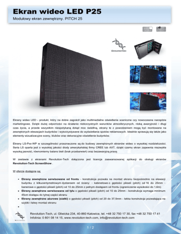 Ekran wideo LED P25 Modułowy ekran zewnętrzny. PITCH 25 Ekrany wideo LED - produkt, który na dobre zagościł jako multimedialne oświetlenie sceniczne czy nowoczesne narzędzie marketingowe. Dzięki dużej odporności na działanie niekorzystnych warunków atmosferycznych, niską awaryjność i długi czas życia, a przede wszystkim niespotykaną dotąd moc świetlną, ekrany te z powodzeniem mogą być montowane na zewnętrznych elewacjach budynków i wykorzystywane do wyświetlania spotów reklamowych. Idealnie sprawują się także jako elementy wizualizacyjne sceny, klubów oraz dekoracyjne oświetlenie budynków. Ekrany LS-Pxx-WP w szczególności przeznaczone są do budowy zewnętrznych ekranów wideo o wysokiej rozdzielczości. Seria LS oparta jest o wysokiej jakości diody amerykańskiej firmy CREE lub AXT, dzięki czemu ekran zapewnia niezwykle wysoką jasność, równomierny balans bieli (brak przebarwień) oraz bezawaryjną pracę. W zestawie z ekranami Revolution-Tech dołączona jest licencja zaawansowanej aplikacji do obsługi ekranów Revolution-Tech ScreenShow . W ofercie dostępne są: Ekrany zewnętrzne serwisowane od frontu - konstrukcja pozwala na montaż ekranu bezpośrednio na elewacji budynku z kilkucentymetrowym dystansem od ściany: - kabinetowe o gęstości pikseli (pitch) od 16 do 25mm banerowe o gęstości pikseli (pitch) od 10 do 25mm z pełnym dostępem od frontu (ograniczenie wysokości do 1,6m) Ekrany zewnętrzne serwisowane od tyłu o gęstości pikseli (pitch) od 10 do 25mm - konstrukcja wymaga minimum 45cm dostępu do tylnej części ekranu Ekrany zewnętrzne ażurowe (siatki) o gęstości pikseli (pitch) od 20 do 37,5mm - lekka konstrukcja pozwalająca na szybki i łatwy montaż ekranu Revolution-Tech, ul. Gliwicka 234, 40-860 Katowice, tel. +48 32 750 17 30, fax +48 32 750 17 41 Infolinia: 0 801 08 14 15, www.revolution-tech.com, [email protected] 1/2 Ekrany kabinetowe wewnętrzne o gęstości pikseli (pitch) od 4 do 16mm Bandy stadionowe o gęstości pikseli (pitch) od 16 do 20mm CityBoard o gęstości pikseli (pitch) 6mm - wolnostojące ekrany informacyjno-reklamowe w obudowie wandaloodpornej CityBoard o gęstości pikseli (pitch) 6mm - wolnostojące ekrany informacyjno-reklamowe w obudowie wandaloodpornej Specyfikacje Napięcie 230 V Prąd AC Średni pobór energii 250 W Maksymalny pobór energii 800 W Pitch 25 mm Minimalna odległość wizyjna 20 m Producent diod LED / kraj CREE/USA, AXT/USA, SILAN/TAIWAN Światłość / m² 5 000 NIT Średni czas życia diody 100 000 godz. Kąt świecenia 110/55 ° Wodoszczelność tak Współczynnik ochrony IP IP65 Temperatura pracy -40/+60 °C Obudowa metal Rozdzielczość kabinetu/modułu 64x48 px Wymiary 120,0 / 120,0 / 18,0 cm Waga 52 kg Waga brutto (z opakowaniem) 70 kg Gwarancja 24 m-cy Revolution-Tech, ul. Gliwicka 234, 40-860 Katowice, tel. +48 32 750 17 30, fax +48 32 750 17 41 Infolinia: 0 801 08 14 15, www.revolution-tech.com, [email protected] 2/2
