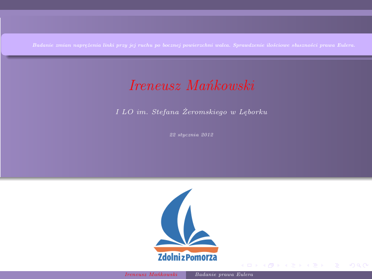 Badanie zmian naprężenia linki przy jej ruchu po bocznej powierzchni walca. Sprawdzenie ilościowe słuszności prawa Eulera. Ireneusz Mańkowski I LO im. Stefana Żeromskiego w Lęborku 22 stycznia 2012 Ireneusz Mańkowski Badanie prawa Eulera Zmiany siły naprężenia linki Część teoretyczna Wyprowadzenie wzoru na naprężenie dla zsuwającej się nici po bloczku(walcu) w zależności od kąta ϕ nawinięcia linki na bloczek (prawo Eulera) Ireneusz Mańkowski Badanie prawa Eulera Zmiany siły naprężenia linki - analiza Ireneusz Mańkowski Badanie prawa Eulera Zmiany siły naprężenia linki - równania Ireneusz Mańkowski Badanie prawa Eulera Zmiany siły naprężenia linki - równania Uwaga ! Równania te są poprawne oczywiście dla małych kątów ∆ϕ. Z obu tych równań wynika już jedno równanie zależności naprężenia linki od kąta jej nawinięcia.Ostatnie z równań to równanie różniczkowe, które można rozwiązać, korzystając ze sposobów przedstawionych na poprzednich zajęciach. Ireneusz Mańkowski Badanie prawa Eulera Zmiany siły naprężenia linki - równania To jest ostateczna postać wzoru Eulera Ireneusz Mańkowski Badanie prawa Eulera Instrukcja dla ucznia 1 2 3 4 5 6 7 8 Przymocować badany bloczek (walec) w położeniu poziomym do statywu (sytuację taką przedstawia rysunek 1) Linkę z przyczepionym do niej z jednego końca ciężarkiem przełożyć przez powierzchnię boczną bloczka (walca). Do drugiego końca nici zaczepić dynamometr(siłomierz), przy użyciu którego można będzie zmieniać siłę naprężenia linki Wszystkie pomiary wykonać przy powolnym podnoszeniu i opuszczaniu mas ruchem jednostajnym. Zmierzyć zależność naprężenia linki od kąta jej nawinięcia przy ruchu jednostajnym ciężarka do góry. Pomiary wykonać dla trzech mas, przyjmując jako kąty nawinięcia linki 900 ,1800 , 2700 . Wykonać wykres zależności badanej siły naprężenia w zależności od kąta nawinięcia i zweryfikować słuszność wzoru Eulera. Wyznaczyć wartość współczynnika tarcia µ dla każdej masy. Zmierzyć zależność naprężenia linki od kąta jej nawinięcia przy ruchu jednostajnym ciężarka do dołu. Pomiary wykonać dla jednej masy, przyjmując jako kąty nawinięcia linki 900 ,1800 , 2700 . Ireneusz Mańkowski Badanie prawa Eulera Instrukcja dla ucznia 1 Wykonać wykres zależności badanej siły naprężenia w zależności od kąta nawinięcia i zweryfikować słuszność wzoru Eulera oraz sprawdzić zgodność z wcześniejszym badaniem ruchu ciężarka do góry. 2 Przedyskutować otrzymane wyniki i wyciągnąć wnioski z pomiarów POWODZENIA Ireneusz Mańkowski Badanie prawa Eulera