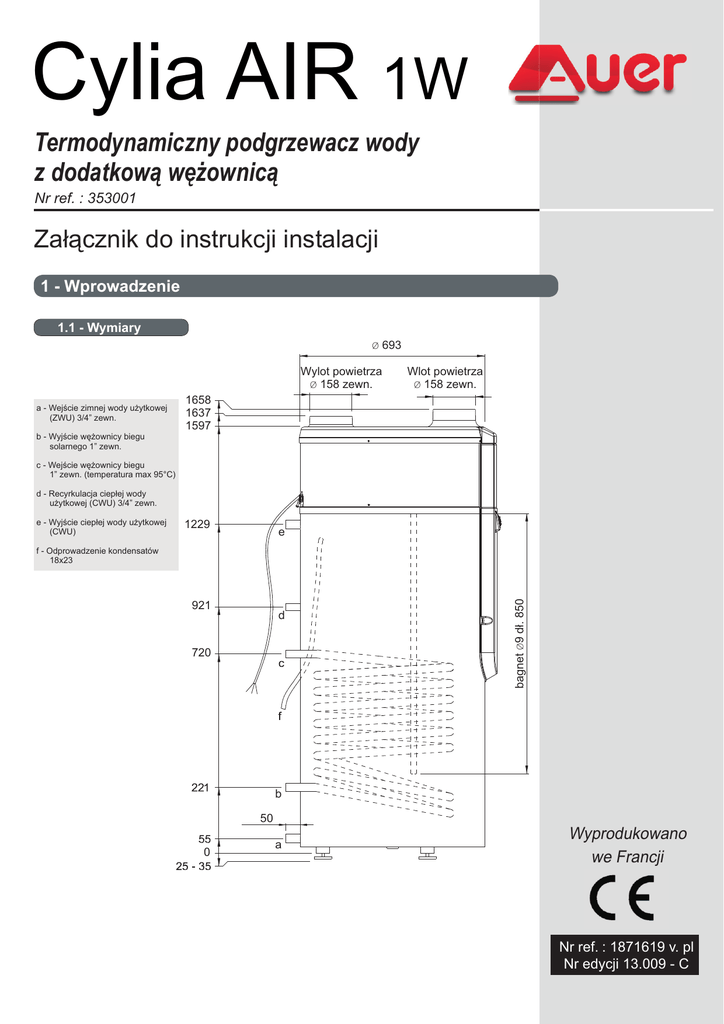Cylia AIR 1W Termodynamiczny podgrzewacz wody z dodatkow¹ wê¿ownic¹ Nr ref. : 353001 Za³¹cznik do instrukcji instalacji 1 - Wprowadzenie 1.1 - Wymiary q 693 Wylot powietrza q 158 zewn. a - Wejœcie zimnej wody u¿ytkowej (ZWU) 3/4” zewn. Wlot powietrza q 158 zewn. 1658 1637 1597 b - Wyjœcie wê¿ownicy biegu solarnego 1” zewn. c - Wejœcie wê¿ownicy biegu 1” zewn. (temperatura max 95°C) d - Recyrkulacja ciep³ej wody u¿ytkowej (CWU) 3/4” zewn. e - Wyjœcie ciep³ej wody u¿ytkowej (CWU) 1229 e 921 d 720 bagnet q 9 d³. 850 f - Odprowadzenie kondensatów 18x23 b 50 0 a Wyprodukowano we Francji Nr ref. : 1871619 v. pl Nr edycji 13.009 - C 1.2 - Charakterystyka techniczna 2 - Instalacja Podgrzewacz termodynamiczny z jedn¹ wê¿ownic¹ 353001 Nr referencyjny W celu wykonania pod³¹czeñ hydraulicznych wody u¿ytkowej, odnieœæ siê do instrukcji instalacji. PCV + 5 mm filtr PE Obudowa Izolacja 45 mm pianka PU Pojemnoœæ 290L Materia³ zbiornika 1. Pompa kot³a 2. Zawór bezpieczeñstwa kot³a 3. Naczynie rozszerzalne kot³a Stal emaliowana Ochrona Anoda magnezowa Max ciœnienie robocze (zbiornik) 0,7mPa / 7bar Wymiary Sygna³ zapotrzebowania CWU Ciep³a woda u¿ytkowa (CWU) Ø 700mm x Wys. 1658mm Waga bez wody (z opakowaniem) 140kg Poziom zabezpieczenia IPX1 Zasilanie elektryczne 230V - 50Hz - 16A Moc maksymalna Recyrkulacja CWU 2200W Bezpiecznik (B) Wejœcie 16A Czynnik ch³odniczy R134a - 0,95kg Max ciœn. roz³adowania pompy ciep³a 2,5MPa (25 bar) Temp. CWU* zapewniana przez PC* +60°C Zakres funkcjonowania (temp. powietrza) - 7 do +35 °C Poziom ha³asu na biegu 1 / biegu 2** Wyjœcie z kot³a Kocio³ Powrót do kot³a 36dB(A) z odleg³oœci 2m Wyjœcie 3 Przep³yw powietrza Max d³ugoœæ przewodu powietrznego (Ø160 mm) 2.1 - Schemat instalacji 400m /h Zimna woda u¿ytkowa (ZWU) elastyczny: 10m, ss¹cy i wylotowy sztywny: 20m, ss¹cy i wylotowy Œrednica pod³¹czenia przewodu powietrznego (wlot/wylot) Produkcja kondensatu 160mm 0,3L/h Œrednica pod³¹czeñ ZWU* i CWU* 3/4" zewn. Œrednica pod³¹czenia cyrkulacji wody 3/4" zewn. Powierzchnia wymiany wê¿ownicy 1,45 m.2 Œrednica pod³¹czenia wyjœcia/powrotu w¿ownicy 1” zewn. Moc grza³ki elektrycznej (zabezpieczenie = 85°C) 1500W Max temp. wody dla grza³ki 65°C Max moc pobierana przez PC* przy podgrzewaniu wody do 60°C 700W Œrednia moc grzewcza PC* przy podgrzewaniu wody do 45°C 1650W C.O.P.* (EN 16147), temp. +7°C 3,03 C.O.P.* (EN 255-3); temp. +15°C 4 C.O.P.* przy temp. powietrza -7°C 1,8 * CWU - ciep³a woda u¿ytkowa ZWU - zimna woda u¿ytkowa PC - pompa ciep³a C.O.P.- wspó³czynnik sprawnoœci ** z przewodami poboru i wylotu powietrza 2.2 - Zastosowanie wê¿ownicy do pod³¹czenia z kot³em ? Od³¹czyæ urz¹dzenie z zasilania ? Zdemontowaæ pokrywê górn¹ odkrêcaj¹c œruby (a) u jej podstawy ? Zdemontowaæ od³onê karty elektronicznej Maskownica górna Zestaw pokrywy górnej Nie rozdzielaæ Styk 14-15 na p³ycie elektronicznej pompy ciep³a jest stykiem zapotrzebowania na CWU. Jest to styk beznapiêciowy. Styk 14-15 na p³ycie elektronicznej pompy ciep³a nale¿y 2 pod³¹czyæ kablem 2x1,5mm ze stykami termostatu na p³ycie kot³a. Styk “Alarme” zdezaktywowany. Jest on zamieniony na styk zarz¹dzania kot³em. 2 U¿ytkownik ma mo¿liwoœæ wyboru jako drugiego Ÿród³a ciep³a grza³ki elektrycznej lub kot³a (np. funkcjonowanie latem lub zim¹). Domyœlnie ustawione jest funkcjonowanie grza³ki elektrycznej. Styk zapotrzebowania na CWU Kocio³ NIGDY nie pod³¹czaæ napiêcia 230V do styku kot³a. Ryzyko zniszczenia p³yty elektronicznej. 2.3 - Schemat pod³¹czeñ elektrycznych w po³aczeniu z kot³em czarny czarny czarny czerwony niebieski niebieski czarny br¹zowy pomarañczowy pomarañczowy Zasilanie 230V - 50Hz - 16A zielono-zó³ty czerwony Uziemienie (zielono-¿ó³ty) Faza Neutralny (br¹zowy) (niebieski) zielono-zó³ty czerwony niebieski ró¿owy szary niebieski niebieski czarny zielono-zó³ty Wyœwietlacz niebieski szary Sygna³ uruchom/ zatrzymaj kocio³ br¹zowy bia³y br¹zowy kabel pod³¹czenia wyœwietlacza i p³yty LTS (85°C) AqL (60°C) Kompresor czarny br¹zowy niebieski zielono-¿ó³ty HP : C1 : C2 : C3 : R : Presostat wysokociœnieniowy Kondensator rozruchowy kompresora Kondensator wentylatora 2ìF Kondensator wentylatora 3ìF 1MÙ opornik wentylatora RC : V : C : EV : RE : Stycznik kompresora Wentylator Kompresor Zawór odmra¿ania 1500W grza³ka elektryczna LTS : AqL : I : Zabezpieczenie termostatyczne grza³ki elektrycznej Termostat nastawny grza³ki elektrycznej Cewka indukcyjna 3 2.4 - Menu u¿ytkownika - wybór kot³a jako drugiego Ÿród³a ciep³a Dostêp bezpoœredni do funkcji przez: 1. Naciœniêcie “Menu”. 2. Przekrêcenie pokrêt³a i wybór odpowiedniej opcji menu u¿ytkownika TEMP. EAU Ustawienie temperatury wody VAC AN C ES 3.1 - Zastosowanie wê¿ownicy z systemem solarnym (Temperatura max wê¿ownicy 95°C) Energia s³oneczna jest ustawiona jako priorytet. System solarny sterowany jest przez sterownik zewnêtrzny a nie poprzez pompê ciep³a Cylia AIR. Programowanie funkcji “Wakacje” TU R BO Aktywacja funkcji “TURBO” 3 - Instalacja z systemem solarnym APPOINT Wybór drugiego Ÿród³a ciep³a W celu umieszczenia czujnika zewnêtrznego sterownika solarnego w zasobniku, nale¿y wykorzystaæ bagnet znajduj¹cy siê pod górn¹ os³on¹ pompy ciep³a Cylia AIR. Po wy³¹czeniu urz¹dzenia z zasilania, wprowadziæ czujnik sterownika na spód bagnetu. W menu u¿ytkownika wybraæ grza³kê elektryczn¹ jako drugie Ÿród³o ciep³a. nastêpnie APPOINT Nacisn¹æ pokrêt³o aby zmieniæ drugie Ÿród³o ciep³a APPT . EL EC . Przekrêciæ pokrêt³o aby wybraæ drugie Ÿród³o ciep³a lub APPT. C H AU D . bagnet q 9 Nacisn¹æ pokrêt³o aby potwierdziæ wybór Obieg solarny Uwaga: Symbol lub wyborze drugiego Ÿród³a ciep³a pojawia siê po Produkcja Wy³¹czny przedstawiciel na terenie Polski AUER Rue de la République 80210