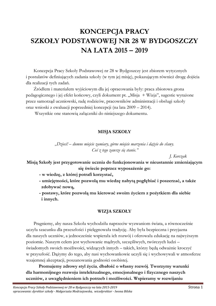 KONCEPCJA PRACY SZKOŁY PODSTAWOWEJ NR 28 W BYDGOSZCZY NA LATA 2015 – 2019 Koncepcja Pracy Szkoły Podstawowej nr 28 w Bydgoszczy jest zbiorem wytycznych i postulatów definiujących zadania szkoły (w tym jej misję), pokazującym również drogę dojścia dla realizacji tych zadań. Źródłem i materiałem wyjściowym dla jej opracowania były: praca zbiorowa grona pedagogicznego i jej efekt końcowy, czyli dokument pt. „Misja + Wizja”, sugestie wyrażone przez samorząd uczniowski, radę rodziców, pracowników administracji i obsługi szkoły oraz wnioski z ewaluacji poprzedniej koncepcji (na lata 2009 – 2014). Wszystkie one stanowią załączniki do niniejszego dokumentu. MISJA SZKOŁY „Dzieci! – dumne miejcie zamiary, górne miejcie marzenia i dążcie do sławy. Coś z tego zawsze się stanie.” J. Korczak Misją Szkoły jest przygotowanie ucznia do funkcjonowania w nieustannie zmieniającym się świecie poprzez wyposażenie go: - w wiedzę, z której potrafi korzystać, - umiejętności, które pozwolą mu wiedzę nabytą pogłębiać i poszerzać, a także zdobywać nową, - postawy, które pozwolą mu kierować swoim życiem z pożytkiem dla siebie i innych. WIZJA SZKOŁY Pragniemy, aby nasza Szkoła wychodziła naprzeciw wyzwaniom świata, a równocześnie uczyła szacunku dla przeszłości i pielęgnowała tradycję. Aby była bezpieczna i przyjazna dla naszych uczniów, a jednocześnie wspierała ich rozwój i oferowała edukację na najwyższym poziomie. Naszym celem jest wychowanie mądrych, szczęśliwych, twórczych ludzi – świadomych swoich możliwości, widzących innych – takich, którzy będą odważnie kroczyć w przyszłość. Dążymy do tego, aby nasi wychowankowie uczyli się i wychowywali w atmosferze wzajemnej akceptacji, poszanowania godności osobistej. Promujemy zdrowy styl życia, dbałość o własny rozwój. Tworzymy warunki dla harmonijnego rozwoju intelektualnego, emocjonalnego i fizycznego naszych uczniów, z uwzględnieniem ich potrzeb i możliwości. Wspieramy w rozwijaniu Koncepcja Pracy Szkoły Podstawowej nr 28 w Bydgoszczy na lata 2015-2019 opracowanie: dyrektor szkoły - Małgorzata Modrzejowska, wicedyrektor - Iwona Bilska Strona 1 indywidualnych predyspozycji. Zachęcamy do podejmowania wyzwań i wytrwałości w dążeniu do celu. Preferujemy pracę w grupie, działania umożliwiające uczniom uczenie się od siebie nawzajem, pomagamy konstruktywnie rozwiązywać problemy. Uczymy samodzielnego myślenia, świadomego podejmowania decyzji oraz aktywnego udziału w życiu społecznym. Uczymy odpowiedzialności za swoje działanie oraz krytycyzmu wobec negatywnych postaw. Bazujemy na pedagogicznym zaangażowaniu wszystkich nauczycieli, którzy są otwarci na potrzeby ucznia, podążają za nim i dbają o jego dobro, życzliwie współpracując ze sobą , są gotowi do wprowadzania innowacji, podnoszą swoje kwalifikacje zawodowe. Społeczność Szkoły tworzą uczniowie, ich rodzice i opiekunowie oraz wszyscy pracownicy Szkoły. Wszyscy oni współpracują ze sobą i dbają o jak najlepszy wizerunek naszej placówki, pozytywnie się z nią identyfikując. Dążymy do tego, by poszerzać bazę szkolną, wyposażyć Szkołę w pomoce dydaktyczne, spełniające wymogi nowych programów nauczania oraz potrzeby i oczekiwania nauczycieli, uczniów i ich rodziców. Pragniemy, aby nasi uczniowie czerpali radość z pobytu w Szkole, a rodzice i opiekunowie satysfakcję z rezultatów naszej współpracy, by Szkoła cieszyła się uznaniem środowiska. Dążymy do tego, aby nasi Uczniowie: odróżniali dobro od zła i asertywnie wyrażali swoje potrzeby, szanowali godność i prawa każdego człowieka, byli dobrze przygotowani do nauki na kolejnych etapach kształcenia, potrafili zastosować zdobywaną wiedzę w praktyce, rozwijali swoje zainteresowania i zdolności, odważnie podejmowali wyzwania i wytrwale dążyli do celu, byli świadomi, że kształcenie jest procesem trwającym całe życie, dbali o zdrowie, bezpieczeństwo, rozwój fizyczny i rekreację, szanowali środowisko i działali proekologicznie. Dążymy do tego, aby Rodzice i Opiekunowie naszych Uczniów: darzyli szkołę zaufaniem i byli spokojni o bezpieczeństwo dziecka w szkole, akceptowali działania dydaktyczno-wychowawcze szkoły i odczuwali potrzebę zaangażowania się w ich realizację, uczestniczyli w budowaniu systemu wartości u swoich dzieci, wspierali nauczycieli w pracy, współdziałali w rozwiązywaniu problemów wychowawczych, wspierali inicjatywy na rzecz uczniów i środowiska realizowane w szkole, odczuwali satysfakcję z relacji interpersonalnych w szkole i przepływu informacji. Koncepcja Pracy Szkoły Podstawowej nr 28 w Bydgoszczy na lata 2015-2019 opracowanie: dyrektor szkoły - Małgorzata Modrzejowska, wicedyrektor - Iwona Bilska Strona 2 Dążymy do tego, aby Nauczyciele: identyfikowali się z placówką, dbali o wszechstronny i harmonijny rozwój uczniów, wyposażali uczniów w umiejętności niezbędne do wzrastania w zmieniającym się świecie, dostarczali uczniom pozytywnych wzorców zachowania-zarówno swoim dobrym przykładem, jak i poprzez świadome nauczanie moralnych postaw i wyborów, wychowywali uczniów do szacunku wobec innych, do samodzielności i współpracy w zespole, uczyli krytycyzmu wobec negatywnych postaw oraz kształtowali postawę poczucia odpowiedzialności za swoje działanie, współdziałali ze sobą w procesie kształcenia i wychowania, z zaangażowaniem uczestniczyli zarówno w rozwijaniu zainteresowań i pasji uczniów, jak i wspieraniu uczniów ze szczególnymi potrzebami edukacyjnymi, kształcili się permanentnie i wzbogacali swój warsztat pracy, angażowali rodziców i opiekunów do współodpowiedzialności za efekty procesów dydaktyczno-wychowawczych zachodzących w szkole, wspierali rodzinę w zabezpieczaniu potrzeb dziecka. MODEL ABSOLWENTA SP 28 - Jest ciekawy świata, myśli twórczo, - jest świad