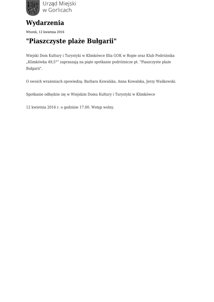 Wydarzenia Wtorek, 12 kwietnia 2016 "Piaszczyste plaże Bułgarii" Wiejski Dom Kultury i Turystyki w Klimkówce filia GOK w Ropie oraz Klub Podróżnika „Klimkówka 49,5°” zapraszają na piąte spotkanie podróżnicze pt. "Piaszczyste plaże Bułgarii". O swoich wrażeniach opowiedzą: Barbara Kowalska, Anna Kowalska, Jerzy Waśkowski. Spotkanie odbędzie się w Wiejskim Domu Kultury i Turystyki w Klimkówce 12 kwietnia 2016 r. o godzinie 17.00. Wstęp wolny.