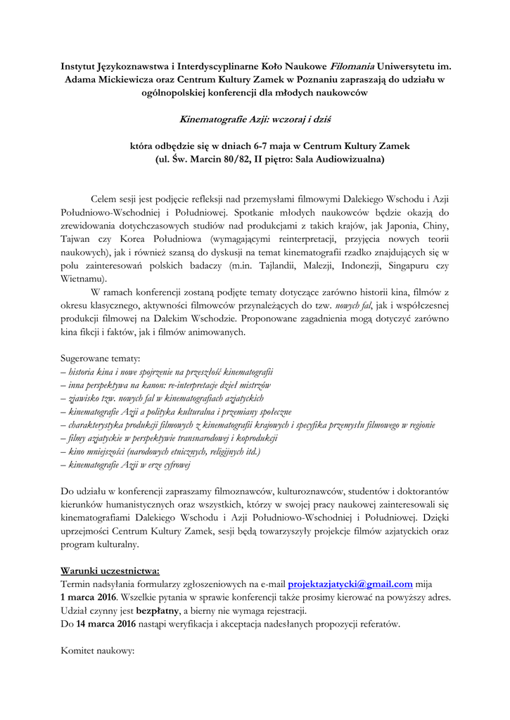 Instytut Językoznawstwa i Interdyscyplinarne Koło Naukowe Filomania Uniwersytetu im. Adama Mickiewicza oraz Centrum Kultury Zamek w Poznaniu zapraszają do udziału w ogólnopolskiej konferencji dla młodych naukowców Kinematografie Azji: wczoraj i dziś która odbędzie się w dniach 6-7 maja w Centrum Kultury Zamek (ul. Św. Marcin 80/82, II piętro: Sala Audiowizualna) Celem sesji jest podjęcie refleksji nad przemysłami filmowymi Dalekiego Wschodu i Azji Południowo-Wschodniej i Południowej. Spotkanie młodych naukowców będzie okazją do zrewidowania dotychczasowych studiów nad produkcjami z takich krajów, jak Japonia, Chiny, Tajwan czy Korea Południowa (wymagającymi reinterpretacji, przyjęcia nowych teorii naukowych), jak i również szansą do dyskusji na temat kinematografii rzadko znajdujących się w polu zainteresowań polskich badaczy (m.in. Tajlandii, Malezji, Indonezji, Singapuru czy Wietnamu). W ramach konferencji zostaną podjęte tematy dotyczące zarówno historii kina, filmów z okresu klasycznego, aktywności filmowców przynależących do tzw. nowych fal, jak i współczesnej produkcji filmowej na Dalekim Wschodzie. Proponowane zagadnienia mogą dotyczyć zarówno kina fikcji i faktów, jak i filmów animowanych. Sugerowane tematy: – historia kina i nowe spojrzenie na przeszłość kinematografii – inna perspektywa na kanon: re-interpretacje dzieł mistrzów – zjawisko tzw. nowych fal w kinematografiach azjatyckich – kinematografie Azji a polityka kulturalna i przemiany społeczne – charakterystyka produkcji filmowych z kinematografii krajowych i specyfika przemysłu filmowego w regionie – filmy azjatyckie w perspektywie transnarodowej i koprodukcji – kino mniejszości (narodowych etnicznych, religijnych itd.) – kinematografie Azji w erze cyfrowej Do udziału w konferencji zapraszamy filmoznawców, kulturoznawców, studentów i doktorantów kierunków humanistycznych oraz wszystkich, którzy w swojej pracy naukowej zainteresowali się kinematografiami Dalekiego Wschodu i Azji Południowo-Wschodniej i Południowej. Dzięki uprzejmości Centrum Kultury Zamek, sesji będą towarzyszyły projekcje filmów azjatyckich oraz program kulturalny. Warunki uczestnictwa: Termin nadsyłania formularzy zgłoszeniowych na e-mail [email protected] mija 1 marca 2016. Wszelkie pytania w sprawie konferencji także prosimy kierować na powyższy adres. Udział czynny jest bezpłatny, a bierny nie wymaga rejestracji. Do 14 marca 2016 nastąpi weryfikacja i akceptacja nadesłanych propozycji referatów. Komitet naukowy: prof. dr hab. Krzysztof Kozłowski dr Teija Gumilar mgr Przemysław Sztafiej Komitet organizacyjny: mgr Marek Bochniarz mgr Jakub Królczyk