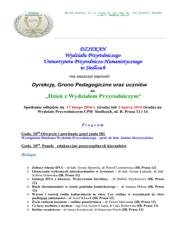 08-110 Siedlce, ul. B. Prusa 14, tel./fax (0...25) 6431353, 6431364 e-mail: [email protected] ______________________________________________________________ DZIEKAN Wydziału Przyrodniczego Uniwersytetu Przyrodniczo-Humanistycznego w Siedlcach ma zaszczyt zaprosić Dyrekcję, Grono Pedagogiczne oraz uczniów na „Dzień z Wydziałem Przyrodniczym” Spotkanie odbędzie się 17 lutego 2016 r. (środa) lub 2 marca 2016 (środa) na Wydziale Przyrodniczym UPH Siedlcach, ul. B. Prusa 12 i 14 Program Godz. 1000 Otwarcie i powitanie gości (aula IB) Wystąpienie Dziekana Wydziału Przyrodniczego – prof. dr hab. Janina Skrzyczyńska Godz. 1020 Panele edukacyjne poszczególnych kierunków Biologia Zobacz własne DNA – dr hab. Iwona Sprawka, dr Paweł Czerniewicz (IB, Prusa 12) Oznaczanie wybranych antyoksydantów w żywności – dr hab. Iwona Łukasik, dr hab. Sylwia Goławska (IB, Prusa 12) Izolacja DNA z kleszczy. Wykrywanie boreliozy – dr Hubert Sytykiewicz (IB, Prusa 12) Ruch chromosomów w czasie podziału komórkowego – dr Joanna Mitrus (IB, Prusa 12) Wzrost i rozwój roślin kulturalnych in vitro. Czy rośliny w warunkach in vitro podlegają zmienności – dr Józef Klocek (IB, Prusa 12) Życie cudzym kosztem – rośliny pasożytnicze – dr Paweł Marciniak (IB, Prusa 12) Co łączy mydlnicę z mydłem – mgr Ewa Sychut-Czapla, dr Lidia Borkowska (IB, Prusa 12) Rośliny owadożerne – dr Janusz Krechowski, dr Katarzyna Piórek (IB, Prusa 12) Rzeka życia – dr Katarzyna Ługowska, dr Elżbieta Kondera (IB, Prusa 12) Jak działa organizm ludzki – dr Piotr Sarnowski, dr Elżbieta Kondera (IB, Prusa 12) Różnorodność w świecie drobnoustrojów – dr hab. Barbara Kot, dr Małgorzata Piechota (IB, Prusa 12) Przystosowanie ptaków do lotu, ptasi GPS i inne ornitologiczne ciekawostki…. – dr hab. Artur Goławski (IB, Prusa 12) Badania ornitologiczne w Puszczy Białowieskiej i nie tylko…. – dr hab. Dorota Czeszczewik, dr hab. Wiesław Walankiewicz (IB, Prusa 12) Niezwykły świat pająków – dr Marzena Stańska, dr Izabela Hajdamowicz, dr Joanna Gardzińska, dr Barbara Patoleta (IB, Prusa 12) Co można odczytać z muszli mięczaka – dr hab. Beata Jakubik, dr hab. Krzysztof Lewandowski (IB, Prusa 12) Sprawdź jaką wodę pijesz – dr Małgorzata Strzałek, mgr Elżbieta Biardzka (IB, Prusa 12) Dietetyka Warsztaty żywieniowe nt. „Czy jesz prawidłowe śniadanie” – dr hab. Elżbieta Krzęcio-Nieczyporuk prof. nzw., dr hab. Katarzyna Antosik, dr Katarzyna Kowalcze (sala 302, ul. Prusa 14) Pomiar składu ciała za pomocą aparatu (wagi) Omron (indeks masy ciała, % zawartości tkanki tłuszczowej w organizmie, % zawartość tkanki mięśniowej, poziom trzewnej tkanki tłuszczowej, spoczynkowy metabolizm) – prof. dr hab. Wojciech Kolanowski, mgr Agnieszka Decyk (sala 302, ul. Prusa 14) Test metaboliczny – „Jakim typem metabolicznym jesteś” – dr Hanna MańkowskaPliszka (sala 302, ul. Prusa 14) Projekcja filmów z zakresu zdrowego stylu życia – prof. dr hab. Jarosław Wysocki (sala 302, ul. Prusa 14) Rolnictwo oraz Gospodarka Przestrzenna Mikroświat grzybów infekujących owady – dr hab. Anna Majchrowska – Safaryan s. 109 ul. Prusa 14 Rola trawników w kształtowaniu obiektów terenów zieleni miejskiej – dr inż. Jacek Sosnowski s. 106 ul. Prusa 14 Warzywa i owoce jako element stylu życia – dr hab. Jolanta Frankowska prof. nzw., prof. dr hab. Anna Zaniewicz-Bajkowska s. 205 ul. Prusa 14 Przygotowanie soków z owoców i warzyw – dr hab. Jolanta Frankowska prof. nzw., prof. dr hab. Anna Zaniewicz-Bajkowska s. 205 ul. Prusa 14 Czy wiemy co jemy – dr hab. Beata Kuziemska prof. nzw. s. 15 ul. Prusa 14 Minerał- Skała-Gleba – dr hab. Marcin Becher s.15 ul. Prusa 14 Różne aspekty wykorzystania nowoczesnej technologii GPS – dr hab. Jolanta Jankowska s. 119 ul. Prusa 14 Zastosowanie teledetekcji w badaniach środowiska przyrodniczego dr Mirosław Meksuła s. 101. ul. Prusa 14 Zootechnika oraz Bioinżynieria Produkcji Żywności Znaczenie pszczoły miodnej w środowisku naturalnym – dr inż. Aldona Gontarz s. 211, ul. Prusa 14 Jajko – co o nim wiemy – dr inż. Dorota Banaszewska dr hab. Barbara Biesiada-Drzazga prof. UPH s. 210 ul. Prusa 14 Tajemnice mleka – dr hab. Grażyna Niedziałek prof. UPH s. 211 ul. Prusa 14 Profesjonalna pielęgnacja psów. Warsztaty pokazowe – mgr inż. Edyta Sweklej, dr inż. Elżbieta Horoszewicz s.301 ul. Prusa 14 Zoopsychologia, psy i koty – dr inż. Elżbieta Horoszewicz s.301 ul. Prusa 14 Tajemnicze plemniki – dr hab. Anna Wysokińska, dr Maria Iwanina s.220 ul. Prusa 14 Zapisane w ….chromosomach – dr hab. Katarzyna Andraszek, dr hab. Ewa Wójcik s 324 ul. Prusa 14 Produkty zwierzęce w żywieniu człowieka – dr inż. Anna Milczarek, prof. dr hab. Maria Osek s.309 ul. Prusa 14 Metody produkcji mięsa wołowego oraz jego walory kulinarne i żywieniowe dr hab. Krzysztof Młynek, prof. UPH s.320 ul. Prusa 14 Mięso niezbędny składnik diety człowieka – prof. dr hab. Maria Koćwin-Podsiadła s. 313 ul. Prusa 14) Zwierzęta łowne w środowisku człowieka – dr hab. Elżbieta Bombik prof. nzw. s.214 ul. Prusa 14 Ratownictwo medyczne Udzielanie pierwszej pomocy w stanach zagrożenia zdrowia i życia – dr Beata Łaziuk i ratownicy medyczni. s. 203 IB Prusa 12 Turystyka i rekreacja Turystyka i Rekreacja sposobem na przyszłość – dr hab. Anna Ciepiela prof. nzw. s. 303 IB Prusa 12 Przewidywane zakończenie ok. 1400 Dziekan Wydziału Przyrodniczego Prof. dr hab. Janina Skrzyczyńska ---------------------------------------------------------------------------------------------------Prosimy o potwierdzenie przyjazdu i o ile to możliwe wskazanie tematu warsztatów, którymi jesteście Państwo zainteresowani do dnia 12 lutego 2016 r. telefonicznie pod wskazanymi numerami: (25) 643 1268 lub (25) 643 1253. Można też na e-maila ajanocha @uph.edu.pl