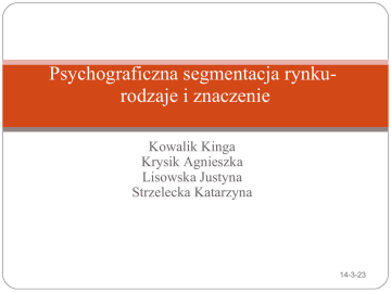 Psychograficzna segmentacja rynkurodzaje i znaczenie Kowalik Kinga Krysik Agnieszka Lisowska Justyna Strzelecka Katarzyna 14-3-23 Plan prezentacji 1. Pojęcie segmentacji 2. Korzyści wynikające z segmentacji 3. Kryteria segmentacji rynku kryteria odnoszące się do konsumenta kryteria psychograficzne 4. Segmentacja stylów życia 5. Segmentacje stylów życia w Polsce Segmentacja w badaniu firmy IQS and QUANT GROUP segmentacja Target Group Segments segmentacja Euro Socio Styles Segmentacja rynku Dokonanie podziału rynku w celu wyodrębnienia grup nabywców o podobnych cechach, dochodach, potrzebach, reakcji na reklamę, preferencjach odnośnie sposobu zakupu itp. Korzyści wynikające z segmentacji Wybranie rynku, na którym działalność firmy będzie opłacalna. Łatwiej jest dzięki niej zaplanować strategie związane z produktem, promocją, dystrybucją i ceną. Lepsze dostosowanie się do potrzeb klientów. Obserwowanie zmian zachodzących na rynku i dostosowanie się do nich. Ułatwienie komunikacji między producentem i klientami. Dotarcie do tych konsumentów, których preferencje zostały uwzględnione przy kształtowaniu działań marketingowych. Kryteria segmentacji rynku kryteria odnoszące się do konsumenta kryteria odnoszące się do produktu Kryteria segmentacji rynku odnoszące się do konsumenta Kryteria społeczoekonomiczne Kryteria demograficzne Kryteria psychograficzne - dochód - zawód - wykształcenie - kryteria geograficzne -miejsce zamieszkania - wiek - płeć - wielkość rodziny - faza cyklu życia rodziny - status rodziny - narodowość - styl życia - aktywność - zainteresowania - opinie Kryteria psychograficzne Aktywność: praca zawodowa, hobby, kultura, urlop, rozrywka, sport itp. Zainteresowania: rodzina, dom, posada, sąsiedztwo, moda, żywienie, itp. Opinie konsumentów: o sobie samych, o sprawach społecznych, politycznych, o interesach, gospodarce, przyszłości, itp. Styl życia: zakres i forma codziennych zachowań specyficznych dla określonej zbiorowości społecznej Kryteria psychograficzne Aktywność: praca zawodowa, hobby, kultura, urlop, rozrywka, sport itp. Zainteresowania: rodzina, dom, posada, sąsiedztwo, moda, żywienie, itp. Opinie konsumentów: o sobie samych, o sprawach społecznych, politycznych, o interesach, gospodarce, przyszłości, itp. Styl życia: zakres i forma codziennych zachowań specyficznych dla określonej zbiorowości społecznej Psychrografia - definicja • Zastosowanie koncepcji behawioralnych, pochodzących z badań społecznych, w badaniach marketingowych, • Procedura badań ilościowych, w której stosuje się zmienne psychologiczne do przewidywania zachowań konsumenckich, • Charakterystyki jednostek, wpływające na ich reaksce jako konsumentów na produkty i działania marketingowe (Demby) 14-3-23 Styl życia - definicja • „Podstawowe cechy jednostki pochodzące z dzieciństwa, które kierują jej reakcjami i zachowaniem” (Adler) 14-3-23 Styl życia – definicja c.d. • „Styl życia odpowiada wyróżniającemu się lub charakterystycznemu sposobowi życia, w szerokim lub ogólnym sensie, społeczeństwa jako całości lub jako części. Dotyczy tych wyjątkowych składników i cech, które opisują sposób życia pewnej kultury lub grupy i wyróżniają je pośród innych. Zawiera w sobie wzorce , które rozwijają się lub powstają w wyniku zmian związanych z życiem w społeczeństwie” (Lazer) 14-3-23 Styl życia – definicja c.d. • „Styl życia to wzorzec zachowań indywidualnych i społecznych, charakterystyczny dla jednostki lub grupy” (Veal) 14-3-23 Powiązanie stylów życia z systemami wartości - RVS system wartości – „trwałe uporządkowanie zasad i celów, pomagające wybierać pomiędzy możliwościami, rozwiązywać konflikty i podejmować decyzje” (Rokeach) 14-3-23 LOV – dziewięć wartości 1. 2. 3. 4. 5. 6. 7. 8. 9. Poczucie przynależności Emocje Radość i przyjemność z życia Ciepłe relacje z innymi Poczucie osobistego spełnienia Poczucie szacunki innych Poczucie osiągnięcia sukcesu Poczucie bezbieczeństwa Poczucie szacunku do siebie 14-3-23 Segmentacja stylów życia - VALS • Małe zasoby: • Survivors. • Motywowani zasadami: • Believers, • Thinkers. • Motywowani osiągnięciami: • Strivers, • Achievers. 14-3-23 Segmentacja stylów życia – VALS c.d. • Motywowani doświadczeniami: • Makers, • Experiences. • Duże zasoby: • Innovators. 14-3-23 Segmentacje stylów życia w Polsce rozwinięta w badaniu firmy IQS and QUANT GROUP. Wyróżniono w nim 7 segmentów konsumenckich: • The Top, • Pozytywistki i Emancypantki, • Dzieci Pop-Kultury, • Panowie Kowalscy, • Królowe Disco-Polo, • Mamuśki, • Tradycjonaliści The Top 6% •Nonkonformiści •Rzadko gotują , często jadają poza domem •Lubią robić zakupy, chętnie wypróbowują nowości, przywiązują dużą wagę do jakości kupowanych produktów •Wysoki poziom konsumpcji, zwłaszcza artykułów spożywczych •Ekstrawertycy Pozytywistki i Emancypantki 17% Kobiety, średnia wieku 31 lat Dosyć dużo wyjeżdżają Często przyjmują gości w domu Nie zgadzają się z tradycyjną rolą kobiety w życiu rodzinnym i politycznym • Lubią robić zakupy i chodzić po sklepach • Przywiązują wagę do jakości kupowanych produktów • • • • Dzieci Pop-Kultury 8% • Głównie mężczyźni • Dochód w ich gospodarstwach domowych jest dość wysoki i są one stosunkowo zasobne w dobra trwałego użytku, większość z przedstawicieli tego segmentu mieszka z rodzicami • Nonkonformiści • Przywiązują wagę do jakości kupowanych produktów i wolą towary zagraniczne niż polskie • Konsumpcja na umiarkowanym poziomie ale duże spożycie napojów Panowie Kowalscy 22% • Mężczyźni • Do segmentu tego należą pracownicy umysłowi, urzędnicy, nauczyciele, robotnicy wykwalifikowani, właściciele prywatnych zakładów • Tradycjonaliś