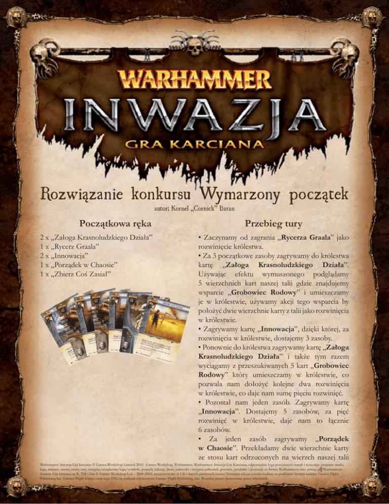 Rozwiązanie konkursu Wymarzony początek autor: Kornel „Cornick” Baran Początkowa ręka 2 x „Załoga Krasnoludzkiego Działa” 1 x „Rycerz Graala” 2 x „Innowacja” 1 x „Porządek w Chaosie” 1 x „Zbierz Coś Zasiał” Przebieg tury • Zaczynamy od zagrania „Rycerza Graala” jako rozwinięcie królestwa. • Za 3 początkowe zasoby zagrywamy do królestwa kartę „Załoga Krasnoludzkiego Działa”. Używając efektu wymuszonego podglądamy 5 wierzchnich kart naszej talii gdzie znajdujemy wsparcie „Grobowiec Rodowy” i umieszczamy je w królestwie, używamy akcji tego wsparcia by położyć dwie wierzchnie karty z talii jako rozwinięcia w królestwie. • Zagrywamy kartę „Innowacja”, dzięki której, za rozwinięcia w królestwie, dostajemy 3 zasoby. • Ponownie do królestwa zagrywamy kartę „Załoga Krasnoludzkiego Działa” i także tym razem wyciągamy z przeszukiwanych 5 kart „Grobowiec Rodowy” który umieszczamy w królestwie, co pozwala nam dołożyć kolejne dwa rozwinięcia w królestwie, co daje nam sumę pięciu rozwinięć. • Pozostał nam jeden zasób. Zagrywamy kartę „Innowacja”. Dostajemy 5 zasobów, za pięć rozwinięć w królestwie, daje nam to łącznie 6 zasobów. • Za jeden zasób zagrywamy „Porządek w Chaosie”. Przekładamy dwie wierzchnie karty ze stosu kart odrzuconych na wierzch naszej talii Warhammer: Inwazja Gra karciana © Games Workshop Limited 2010. Games Workshop, Warhammer, Warhammer: Inwazja Gra Karciana, odpowiednie loga powyższych marek i wszystkie związane marki, loga, miejsca, nazwy, istoty, rasy, insygnia/urządzenia/loga/symbole, pojazdy, lokacje, broń, jednostki i insygnia jednostek, postacie, produkty i ilustracje ze Świata Warhammera oraz setting gry Warhammer: Inwazja Gra karciana są ®, TM i/lub © Games Workshop Ltd.-- 2000-2010, zarejestrowane w UK i innych państwach świata. Niniejsza edycja została wydana na podstawie licencji nadanej Fantasy Flight Publishing Inc. Fantasy Flight Games oraz logo FFG są znakami towarowymi Fantasy Flight Publishing, Inc. Wszelkie prawa zastrzeżone przez właścicieli. (2x „Innowacja”) • Za pozostałe 5 zasobów zagrywamy taktykę „Zbierz Coś Zasiał”. Odrzucamy karty, które mamy na ręce. W zwiazku z tym, że nie mamy żadnej, niczego nie tracimy. Następnie dobieramy pięć następujących kart: „Innowacja”, „Innowacja”, „Załoga Krasnoludzkiego Działa”, „Zbierz Coś Zasiał”, „Porządek w Chaosie”. • Ponownie zagrywamy kartę „Innowacja”. Dostajemy 5 zasobów, za pięć rozwinięć. • Za dwa zasoby zagraywamy kartę „Załoga Krasnoludzkiego Działa” i z pięciu wierzchnich kart ponownie wystawiamy wsparcie „Grobowiec Rodowy” - umieszczamy go w królestwie. Dzięki niemu w królestwie umieszczamy kolejne dwa rozwinięcia. • Mamy teraz siedem rozwinięć w królestwie i 3 zasoby. • Zagrywamy kartę „Innowacja”. Dostajemy 7 zasobów. Mamy łącznie 10. • Za jeden zasób zagrywamy „Porządek w Chaosie”. Dwie wierzchnie karty ze stosu kart odrzuconych przekładamy na wierzch talii (2x „Innowacja”). • Za 7 zasobów rzucamy taktykę „Zbierz Coś Zasiał”. Odrzucamy swoją rękę, czyli nic, gdyż żadnej karty na ręce już nie posiadamy, po czym dobieramy 7 następujących kart: „Innowacja”, „Innowacja”, „Pradawne długi spłacone”, „Przebudzenie Góry”, „Czeladnik Kowala Run”, „Górski Legion”, „Scynki Soteka”. • Pozostały nam 2 zasoby. Zagrywamy „Innowacja”. Dostajemy 7 zasobów. Mamy łącznie 9. • Za 3 zasoby zagrywamy „Przebudzenie Góry” i umieszczamy w królestwie trzy rozwinięcia. Mamy tam już dziesięć rozwinięć. • Zagrywamy kolejną kartę „Innowacja”. Dostajemy 10 zasobów. Łącznie z tym co nam zostało, mamy 16 zasobów. • Do strefy misji wykładamy za 0 zasobów misję „Pradawne długi spłacone” a do jej wykonywania przydzielamy za 2 zasoby „Czeladnika Kowala Run”. Patrzymy na 5 wierzchnich kart talii w poszukiwaniu run. Do ręki bierzemy 3x „Kamień Przysiąg”. • Za 1 zasób zagrywamy do królestwa „Górski Legion”. • Łącznie za 3 zasoby zagrywamy na „Górski Legion” trzy sztuki run „Kamień Przysiąg” (każdy za 1 zasób). • Za 2 zasoby do królestwa zagrywamy „Scynki Soteka”. Z racji wejścia tej jednostki do gry, zadaje ona jedno nieanulowane obrażenie wybranej jednostce, którą jest „Górski Legion”, który jest wyposażony w 3 karty „Kamień Przysiąg”. Dzięki temu, że jednostka została zniszczona, dobieramy 12 kart. Pozostało nam 8 zasobów. Z racji tego, iż jednostka krasnoludów trafiła na stos kart odrzuconych na misję „Pradawne Długi Spłacone” kładziemy jeden zasób. Łącznie mamy 9 zasobów. • 12 kart z dociągu to: „Porządek w Chaosie”, „Innowacja”, „Przebudzenie Góry”, „Przebudzenie Góry”, „Pradawne Długi Spłacone”, „Zbierz Coś Zasiał”, „Gotuj Się Na Wojnę!”, „Strażnik Uraz”, „Szlachetna Misja”, „Szlachetna Misja”, „Szlachetna Misja”, „Górski Legion”. • Rzucamy łącznie za 6 zasobów 2x „Przebudzenie Góry”. Wykładamy do królestwa sześć rozwinięć. W królestwie mamy łącznie 16 rozwinięć. • Do strefy misji zagrywamy dwie misje „Gotuj Się Na Wojnę!” gdzie za jeden zasób zagrywamy „Górski Legion” i „Pradawne Długi Spłacone” gdzie za dwa zasoby zagrywamy „Strażnik Uraz”. Od tego momentu zaczynamy powoli wykręcać kombo, które potem się zapętli • Rzucamy „Innowacja”. Dostajemy 16 zasobów. • Rzucamy 3x „Szlachetna Misja” i owe 3 zasoby umieszczamy na misji „Gotuj Się Na Wojnę!” • Rzucamy za 1 zasób „Porządek w Chaosie” i kładziemy na wierzch talii 2x „Szlachetna Misja”. • Poświęcamy jednostkę „Górski Legion” wykonującą misję „Gotuj Się Na Wojnę!”. Dzięki temu możemy wtasować do nas