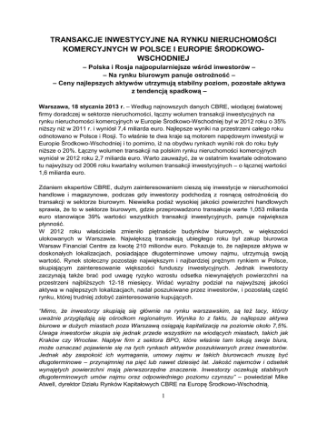 TRANSAKCJE INWESTYCYJNE NA RYNKU NIERUCHOMOŚCI KOMERCYJNYCH W POLSCE I EUROPIE ŚRODKOWOWSCHODNIEJ – Polska i Rosja najpopularniejsze wśród inwestorów – – Na rynku biurowym panuje ostrożność – – Ceny najlepszych aktywów utrzymują stabilny poziom, pozostałe aktywa z tendencją spadkową – Warszawa, 18 stycznia 2013 r. – Według najnowszych danych CBRE, wiodącej światowej firmy doradczej w sektorze nieruchomości, łączny wolumen transakcji inwestycyjnych na rynku nieruchomości komercyjnych w Europie Środkowo-Wschodniej był w 2012 roku o 35% niższy niż w 2011 r. i wyniósł 7,4 miliarda euro. Najlepsze wyniki na przestrzeni całego roku odnotowano w Polsce i Rosji. To właśnie te dwa kraje są motorem napędowym inwestycji w Europie Środkowo-Wschodniej i to pomimo, iż na obydwu rynkach wyniki rok do roku były niższe o 20%. Łączny wolumen transakcji na polskim rynku nieruchomości komercyjnych wyniósł w 2012 roku 2,7 miliarda euro. Warto zauważyć, że w ostatnim kwartale odnotowano tu najwyższy od 2006 roku kwartalny wolumen transakcji inwestycyjnych – o łącznej wartości 1,6 miliarda euro. Zdaniem ekspertów CBRE, dużym zainteresowaniem cieszą się inwestycje w nieruchomości handlowe i magazynowe, podczas gdy inwestorzy podchodzą z rosnącą ostrożnością do transakcji w sektorze biurowym. Niewielka podaż wysokiej jakości powierzchni handlowych sprawia, że to w sektorze biurowym, gdzie przeprowadzono transakcje warte 1,053 miliarda euro stanowiące 39% wartości wszystkich transakcji inwestycyjnych, panuje największa płynność. W 2012 roku właściciela zmieniło piętnaście budynków biurowych, w większości ulokowanych w Warszawie. Największą transakcją ubiegłego roku był zakup biurowca Warsaw Financial Centre za kwotę 210 milionów euro. Pokazuje to, że najlepsze aktywa w doskonałych lokalizacjach, posiadające długoterminowe umowy najmu, utrzymują swoją wartość. Rynek stołeczny pozostaje największym i najbardziej prężnym rynkiem w Polsce, skupiającym zainteresowanie większości funduszy inwestycyjnych. Jednak inwestorzy zaczynają także brać pod uwagę ryzyko wzrostu odsetka niewynajętych powierzchni na przestrzeni najbliższych 12-18 miesięcy. Widać wyraźny podział na najwyższej jakości aktywa w najlepszych lokalizacjach, nadal poszukiwane przez inwestorów, i pozostałą część rynku, której trudniej zdobyć zainteresowanie kupujących. “Mimo, że inwestorzy skupiają się głównie na rynku warszawskim, są też tacy, którzy uważnie przyglądają się ośrodkom regionalnym. Wynika to z faktu, że najlepsze aktywa biurowe w dużych miastach poza Warszawą osiągają kapitalizację na poziomie około 7,5%. Uwaga inwestorów skupia się jednak przede wszystkim na wiodących miastach, takich jak Kraków czy Wrocław. Napływ firm z sektora BPO, które właśnie tam lokują swoje biura, może oznaczać pojawienie się na tych rynkach aktywów poszukiwanych przez inwestorów. Jednak aby zaspokoić ich wymagania, umowy najmu w takich biurowcach muszą być długoterminowe – przynajmniej na pięć lub nawet dziesięć lat. Jakość najemców i odsetek wynajętych powierzchni mają pierwszorzędne znaczenie. Inwestorzy oczekują stabilnych długoterminowych umów najmu oraz odpowiedniego poziomu czynszu” – powiedział Mike Atwell, dyrektor Działu Rynków Kapitałowych CBRE na Europę Środkowo-Wschodnią. 1 Podczas gdy ceny najwyższej jakości aktywów w najlepszych lokalizacjach utrzymują się na relatywnie stałym poziomie we wszystkich segmentach i rynkach, ceny budynków biurowych w niższym segmencie spadły o co najmniej 75 – 100 punktów bazowych, nawet w miastach odnotowujących największą płynność. Niektórzy inwestorzy zaczynają natomiast interesować się wyróżniającymi się nieruchomościami biurowymi w najlepszych lokalizacjach, aby w ten sposób aktywnie przygotować się na okres, w którym wzrośnie odsetek niewynajętych powierzchni. Różnica w kapitalizacji pomiędzy najlepszymi aktywami biurowymi w stolicy i tymi ulokowanymi w pozostałych dużych miastach wynosi ok. 150 punktów bazowych. Eksperci CBRE uważają, że różnica pomiędzy aktywami „z najwyższej póki” i pozostałymi będzie się powiększała przez cały 2013 rok. “W związku ze spowolnieniem w niektórych segmentach rynku najmu powierzchni biurowej, a także wzrostem odsetka wolnej powierzchni, inwestorzy coraz częściej kierują swoją uwagę na rynek powierzchni handlowych. Ten sektor jest nadal oceniany bardzo dobrze, choć w związku z jego dojrzewaniem transakcje wymagają dogłębnej analizy konkurencji i wyników osiąganych przez najemców. Obecnie inwestorzy skupiają się na dwóch rodzajach aktywów. Dominująca grupa inwestorów poszukuje najlepszych centrów handlowych zlokalizowanych w rejonach śródmiejskich – dla takich aktywów kapitalizacja utrzymuje się na stałym poziomie i wynosi ok. 6%. Tak było np. w przypadku łódzkiej Manufaktury. Są też inwestorzy poszukujący tzw. dobrych okazji, którzy chcą kupować aktywa wymagające bardziej aktywnego podejścia do zarządzania, ale oferujące jednocześnie dobre perspektywy wzrostu. Takie aktywa wyceniane są przez rynek około 150 punktów bazowych niżej niż najlepsze centra. Inwestorzy skupiają swoją uwagę na tego typu nieruchomościach, gdy dostrzegają okazje do wdrożenia nowej strategii zarządzania obiektem oraz dokonania skutecznej redukcji ryzyka. Wtedy mogą liczyć na wzrost przychodów z najmu, a także niższą, a więc lepszą dla nich kapitalizację przy sprzedaży aktywa” - dodał Mike Atwell. Wzrost wolumenu transakcji inwestycyjnych w sektorze magazynowym potwierdza rosnące zainteresowanie tym segmentem rynku. Zakup obiektów magazynowych o łącznej wartości 467 milionów euro pokazuje, że fundusze inwestycyjne dążą do dywersyfikacji swoich portfeli, oraz że deweloperzy rozwij