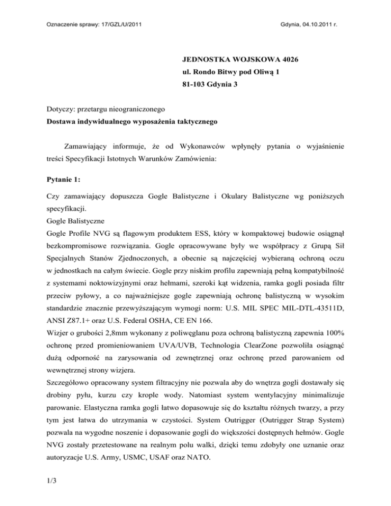 Oznaczenie sprawy: 17/GZL/U/2011 Gdynia, 04.10.2011 r. JEDNOSTKA WOJSKOWA 4026 ul. Rondo Bitwy pod Oliwą 1 81-103 Gdynia 3 Dotyczy: przetargu nieograniczonego Dostawa indywidualnego wyposażenia taktycznego Zamawiający informuje, że od Wykonawców wpłynęły pytania o wyjaśnienie treści Specyfikacji Istotnych Warunków Zamówienia: Pytanie 1: Czy zamawiający dopuszcza Gogle Balistyczne i Okulary Balistyczne wg poniższych specyfikacji. Gogle Balistyczne Gogle Profile NVG są flagowym produktem ESS, który w kompaktowej budowie osiągnął bezkompromisowe rozwiązania. Gogle opracowywane były we współpracy z Grupą Sił Specjalnych Stanów Zjednoczonych, a obecnie są najczęściej wybieraną ochroną oczu w jednostkach na całym świecie. Gogle przy niskim profilu zapewniają pełną kompatybilność z systemami noktowizyjnymi oraz hełmami, szeroki kąt widzenia, ramka gogli posiada filtr przeciw pyłowy, a co najważniejsze gogle zapewniają ochronę balistyczną w wysokim standardzie znacznie przewyższającym wymogi norm: U.S. MIL SPEC MIL-DTL-43511D, ANSI Z87.1+ oraz U.S. Federal OSHA, CE EN 166. Wizjer o grubości 2,8mm wykonany z poliwęglanu poza ochroną balistyczną zapewnia 100% ochronę przed promieniowaniem UVA/UVB, Technologia ClearZone pozwoliła osiągnąć dużą odporność na zarysowania od zewnętrznej oraz ochronę przed parowaniem od wewnętrznej strony wizjera. Szczegółowo opracowany system filtracyjny nie pozwala aby do wnętrza gogli dostawały się drobiny pyłu, kurzu czy krople wody. Natomiast system wentylacyjny minimalizuje parowanie. Elastyczna ramka gogli łatwo dopasowuje się do kształtu różnych twarzy, a przy tym jest łatwa do utrzymania w czystości. System Outrigger (Outrigger Strap System) pozwala na wygodne noszenie i dopasowanie gogli do większości dostępnych hełmów. Gogle NVG zostały przetestowane na realnym polu walki, dzięki temu zdobyły one uznanie oraz autoryzacje U.S. Army, USMC, USAF oraz NATO. 1/3 Oznaczenie sprawy: 17/GZL/U/2011 Gdynia, 04.10.2011 r. Gogle dostępne sa w 4 kolorach: BLACK, TAN, OLIV, FOLIAGE GREEN. Gogle przystosowane do współpracy z wkładkami korekcyjnymi RX. Zestaw zawiera: • Dwa balistyczne wizjery (przeźroczysty i przyciemniany), • Pokrowiec na gogle SpeedSleeve, • Nylonowy pokrowiec na cały zestaw. Okulary Balistyczne ICE3 International to wszystkim znana, lekka pozbawiona oprawek konstrukcja, oferująca pełną ochronę balistyczną, nieograniczone pole widzenia, wymienne wizjery wysokiej klasy optycznej oraz regulowane zauszniki. Technologia ClearZone, której są poddawane wizjery pozwoliła osiągnąć dużą odporność na zarysowania od zewnętrznej oraz ochronę przed parowaniem od wewnętrznej strony wizjera. Co pozwoliło na stosowanie ich w rożnym środowisku i klimacie. Dostępne są 2 rodzaje wkładek korekcyjnych pasujących do tego modelu okularów: • P-2B RX kompatybilne także z modelem NVG, • Vice RX kompatybilne także z modelem V-12. Wszystkie wizjery serii ICE zapewniają 100% ochronę przed promieniowaniem UVA/UVB a ich wytrzymałość spełnia normę ANSI Z87.1+. Ponadto okulary pozytywnie przeszły testy balistyczne MIL-PRF-31013 z kalibrem.15. Modułowa konstrukcja okularów daje możliwość wymiany dowolnego ich elementu: wizjera, zauszników, noska a także pozwala na zamocowanie wkładki korekcyjnej. W zestawie otrzymujemy: • okulary ICE-3 z przyciemnianym wizjerem, • dodatkowy wizjer przezroczysty, • dodatkowy wizjer żółty, • ściereczka NO-FOG, • pasek pozwalający zawiesić okulary na szyi. • miękkie etui z klamrą, mieszczące cały zestaw, 2/3 Oznaczenie sprawy: 17/GZL/U/2011 Gdynia, 04.10.2011 r. STANOWISKO ZAMAWIAJĄCEGO Na podstawie art. 38 ust 1 ustawy roku – Prawo zamówień publicznych (Dz. U. z 2010r. Nr 113, poz. 759), z dnia 29 stycznia 2004 r., Odpowiadając na pytanie 1: Zamawiający wymaga produktu spełniającego warunki opisane w Specyfikacji Technicznej – załącznik 2 do SIWZ Zamawiający utrzymuje termin składania ofert, godziny składania i otwarcia ofert nie ulegają zmianie. Dowódca JW 4026 kmdr Dariusz WICHNIAREK 3/3