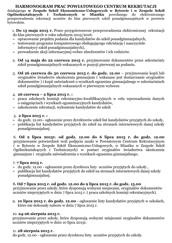 HARMONOGRAM PRAC POWIATOWEGO CENTRUM REKRUTACJI działającego w Zespole Szkół Ekonomiczno-Usługowych w Bytowie i w Zespole Szkół Ogólnokształcących i Technicznych w Miastku powołanego do elektronicznego przeprowadzenia rekrutacji uczniów do klas pierwszych szkół ponadgimnazjalnych w powiecie bytowskim. 1. Do 13 maja 2015 r. Prace przygotowawcze przeprowadzenia elektronicznej rekrutacji do klas pierwszych w roku szkolnym 2015/2016: ➢ opracowanie projektu podania dla kandydatów do szkół ponadgimnazjalnych, ➢ testowanie programu komputerowego obsługującego rekrutację ( nauczyciele informatycy szkół ponadgimnazjalnych), ➢ prowadzenie akcji informacyjnej wobec absolwentów i ich rodziców. 2. Od 14 maja do 22 czerwca 2015 r. przyjmowanie dokumentów przez sekretariaty szkół ponadgimnazjalnych wskazanych w pozycji pierwszej na podaniu. 3. Od 26 czerwca do 30 czerwca 2015 r. do godz. 12.00 – przyjmowanie kopii lub oryginałów świadectw ukończenia gimnazjum ( wskazane jest dostarczanie oryginałów dokumentów ) i kopii zaświadczeń o wynikach egzaminu gimnazjalnego w sekretariatach szkół ponadgimnazjalnych wskazanych w pierwszym wyborze. 4. 26 czerwca – 2 lipca 2015 r. : ➢ praca szkolnych komisji rekrutacyjno-kwalifikacyjnych w celu wprowadzenia danych o osiągnięciach i wynikach egzaminacyjnych kandydatów, ➢ zakończenie rekrutacji, wyłonienie kandydatów do szkół. 5. 2 lipca 2015 r. : ➢ do godz. 12.00– ogłoszenie przez dyrektorów szkół list kandydatów przyjętych do szkoły, ➢ publikacja list kandydatów przyjętych do szkół na stronach internetowych danej szkoły ponadgimnazjalnej. 6. Od 2 lipca 2015r. od godz. 12.00 do 6 lipca 2015 r. do godz. 12.00 przyjmowanie potwierdzeń woli podjęcia nauki w Powiatowym Centrum Rekrutacyjnym ( w Bytowie w Zespole Szkół Ekonomiczno-Usługowych, w Miastku w Zespole Szkół Ogólnokształcących i Technicznych) w postaci oryginałów świadectwa ukończenia gimnazjum i oryginału zaświadczenia o wynikach egzaminu gimnazjalnego. 7. 7 lipca 2015 r. ➢ do godz. 12.00 - ogłoszenie przez dyrektora listy uczniów przyjętych do szkoły , ➢ publikacja list kandydatów przyjętych do szkół na stronach internetowych danej szkoły ponadgimnazjalnej. 8. Od 7 lipca 2015 r. od godz. 12.00 do 9 lipca 2015 r. do godz. 15.00 przyjmowanie przez szkoły, które dysponują wolnymi miejscami, oryginałów dokumentów uczniów nieprzyjętych w dniu 7 lipca 2015 r. ( praca szkolnych komisji rekrutacyjnych). 9. 10 lipca 2015 r. do godz. 12.00 - ogłoszenie listy kandydatów przyjętych w szkołach, które nie dokonały naboru w dniu 7 lipca 2015 r. 10. 24-26 sierpnia 2015 r. przyjmowanie przez szkoły, które dysponują wolnymi miejscami oryginałów dokumentów uczniów nieprzyjętych w dniu 10 lipca 2015r. 11. 28 sierpnia 2015 r. do godz. 12.00 - ogłoszenie przez dyrektora listy uczniów przyjętych do szkoły.