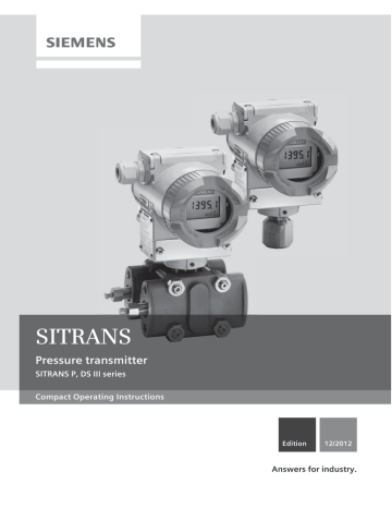 SITRANS Pressure transmitter SITRANS P, DS III series Compact Operating Instructions Edition 12/2012 Answers for industry. English ··································································································· 3 Eesti····································································································· 50 Latviešu ······························································································· 96 Lietuvių ······························································································ 142 Polski ································································································· 190 Română ····························································································· 239 1 SITRANS Pressure transmitter SITRANS P, DS III series (7MF4.33.. 7MF4.34.. 7MF4.35..) Compact Operating Instructions Legal information Warning notice system This manual contains notices you have to observe in order to ensure your personal safety, as well as to prevent damage to property. The notices referring to your personal safety are highlighted in the manual by a safety alert symbol, notices referring only to property damage have no safety alert symbol. These notices shown below are graded according to the degree of danger. DANGER indicates that death or severe personal injury will result if proper precautions are not taken. WARNING indicates that death or severe personal injury may result if proper precautions are not taken. CAUTION indicates that minor personal injury can result if proper precautions are not taken. NOTICE indicates that property damage can result if proper precautions are not taken. If more than one degree of danger is present, the warning notice representing the highest degree of danger will be used. A notice warning of injury to persons with a safety alert symbol may also include a warning relating to property damage. Qualified Personnel The product/system described in this documentation may be operated only by personnel qualified for the specific task in accordance with the relevant documentation, in particular its warning notices and safety instructions. Qualified personnel are those who, based on their training and experience, are capable of identifying risks and avoiding potential hazards when working with these products/systems. Proper use of Siemens products Note the following: WARNING Siemens products may only be used for the applications described in the catalog and in the relevant technical documentation. If products and components from other manufacturers are used, these must be recommended or approved by Siemens. Proper transport, storage, installation, assembly, commissioning, operation and maintenance are required to ensure that the products operate safely and without any problems. The permissible ambient conditions must be complied with. The information in the relevant documentation must be observed. 1 Introduction 1.1 Purpose of this documentation These instructions are a brief summary of important features, functions and safety information, and contain all information required for safe use of the device. It is your responsibility to read the instructions carefully prior to installation and commissioning. In order to use the device correctly, first review its principle of operation. The instructions are aimed at persons who mechanically assemble the device, connect it electrically, and start it up. To achieve optimum usage of the device, read the detailed version of the manual. See also Instructions and manuals (http://www.siemens.com/processinstrumentation/documentation) © Siemens AG 2012. All rights reserved A5E03434631-02, 12/2012 3 1.2 History This history establishes the correlation between the current documentation and the valid firmware of the device. The documentation of this edition is applicable for the following firmware: Edition Firmware identifier nameplate System integration Installation path for PDM 12/2012 HART: FW: 11.03.03, FW: 11.03.04, FW: 11.03.05, FW: 11.03.06 PDM 6.0; Dev. Rev.3 DD Rev.2 SITRANS P DSIII.2 PA/FF: FW: 0300.01.08 1.3 Purpose Overview Depending on the version, a transmitter measures corrosive, non-corrosive and hazardous gases, vapors and liquids. You can use the transmitter for the following types of measurement: ● Gauge pressure ● Absolute pressure ● Differential pressure With appropriate parameter settings and the necessary add-on parts (e.g. flow orifices and remote seals), the pressure transmitter can also be used for the following measurements: ● Level ● Volume ● Mass ● Volume of flow ● Mass flow rate The output signal is always a load-independent direct current between 4 and 20 mA. You can install the "intrinsically-safe" or "explosion-proof" version of the transmitter in hazardous areas. The devices have an EC type examination certificate and comply with the appropriate harmonized European CENELEC directives. Transmitters with remote seals of different shapes can be delivered for special applications. For example, measuring highviscosity substances is a special application. Operate the device in accordance with the specifications in Section Technical specifications (Page 36). For additional information, please refer to the operating instructions for the device. 4 SITRANS P, DS III series (7MF4.33.. 7MF4.34.. 7MF4.35..) A5E03434631-02, 12/2012 1.4 Checking t