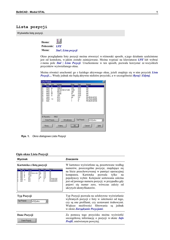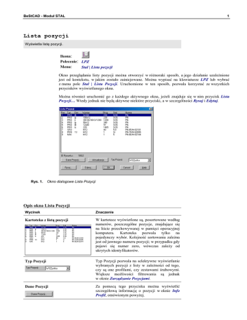 BeStCAD - Moduł STAL 1 Lista pozycji Wyświetla listę pozycji. Ikona: Polecenie: LPZ Menu: Stal | Lista pozycji Okno przeglądania listy pozycji można otworzyć w różnoraki sposób, a jego działanie uzależnione jest od kontekstu, w jakim zostało zainicjowane. Można wypisać na klawiaturze LPZ lub wybrać z menu pole Stal | Lista Pozycji. Uruchomione w ten sposób, pozwala korzystać ze wszystkich przycisków wyświetlanego okna. Można również uruchomić go z każdego aktywnego okna, jeżeli znajduje się w nim przycisk Lista Pozycji… Wtedy jednak nie będą aktywne niektóre przyciski, a w szczególności Rysuj i Edytuj. Rys. 1. Okno dialogowe Lista Pozycji Opis okna Lista Pozycji Wycinek Znaczenie Kartoteka z listą pozycji W kartotece wyświetlone są, posortowane według numerów, poszczególne pozycje, znajdujące się na liście przechowywanej w pamięci operacyjnej komputera. Kartoteka pozwala tylko na pojedynczy wybór. Kolejność sortowania zależna jest od jawnego numeru pozycji; w przypadku gdy pojawi się numer zero, wówczas zależy od ukrytych identyfikatorów. Typ Pozycji Typ Pozycji pozwala na selektywne wyświetlanie wybranych pozycji z listy w zależności od tego, czy są one profilami, czy zestawami śrubowymi. Większe możliwości filtrowania są jednak w oknie Zarządzanie Pozycjami. Dane Pozycji Za pomocą tego przycisku można wyświetlić szczegółową informację o pozycji w oknie Info Profil, omówionym powyżej. BeStCAD - Moduł STAL 2 Wycinek Znaczenie Aktualizacja Ponieważ lista pozycji przechowywana jest w pamięci operacyjnej i może być modyfikowana tylko za pomocą specjalnych narzędzi, w przypadku zmian wykonanych na rysunku zwykłymi poleceniami AutoCAD-a, np. wymazania pozycji z rysunku, nie nastąpi żadna zmiana na liście. Może to powodować fikcyjne kolizje numerów. Należy wówczas przeprowadzić aktualizację listy pozycji. Polega ona na stworzeniu całej listy od nowa na podstawie aktualnego stanu rysunku. W przypadku dużej ilości obiektów proces ten może potrwać nawet kilkadziesiąt sekund. Rysuj Przycisk ten jest dostępny tylko w przypadku uruchomienia polecenia w sposób bezpośredni, a nie z wnętrza innych okien. Po naciśnięciu przycisku Rysuj… okno Lista Pozycji jest definitywnie zamykane, a uruchamia się polecenie STI z oknem Rysowanie Istniejącego Profilu. Jest ono wypełnione informacjami odpowiadającymi pozycji, wybranej wcześniej z listy. Można w ten sposób rysować powtórnie wybrane na liście pozycje. W obecnej wersji programu nie ma możliwości rysowania zestawów śrubowych na podstawie wybranej z listy śruby lub nakrętki. Edytuj Przycisk ten jest dostępny tylko w przypadku uruchomienia polecenia w sposób bezpośredni, a nie z wnętrza innych okien. Po naciśnięciu przycisku Edytuj okno Lista Pozycji jest definitywnie zamykane, a uruchamia się polecenie STE z oknem Edycja Profilu. Jest ono wypełnione informacjami odpowiadającymi pozycji, wybranej wcześniej z listy. Można w ten sposób edytować wybrane na liście pozycje. W obecnej wersji programu nie ma możliwości edytowania zestawów śrubowych.