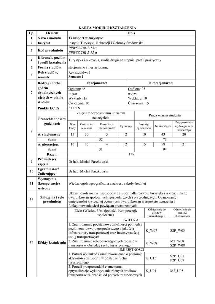 Lp. Element 1 Nazwa modułu 2 Instytut 3 4 5 6 7 Kod przedmiotu Kierunek, poziom i profil kształcenia Forma studiów Rok studiów, semestr 10 11 12 13 Turystyka i rekreacja, studia drugiego stopnia, profil praktyczny stacjonarne i niestacjonarne Rok studiów: I Semestr: I Stacjonarne: Rodzaj i liczba godzin dydaktycznych ujętych w planie studiów Niestacjonarne: Ogółem: 45 w tym Wykłady: 15 Ćwiczenia: 30 5 ECTS Punkty ECTS Zajęcia z bezpośrednim udziałem nauczyciela Pracochłonność w godzinach WyĆwiczenia/ Konsultacje 8 9 KARTA MODUŁU KSZTAŁCENIA Opis Transport w turystyce Instytut Turystyki, Rekreacji i Ochrony Środowiska PPWSZ-TiR-2-13-s PPWSZ-TiR-2-13-n st. stacjonarne Suma st. niestacjon. Suma Razem Prowadzący zajęcia Egzaminator/ Zaliczający Wymagania (kompetencje) wstępne Ogółem: 25 w tym Wykłady: 10 Ćwiczenia: 15 Praca własna studenta Projekty/ opracowania Nauka własna 43 73 58 94 kłady seminaria obowiązkowe Egzaminy 15 30 5 2 10 10 15 4 2 15 52 31 Przygotowanie się do egzaminu końcowego 20 21 125 Dr hab. Michał Paszkowski Dr hab. Michał Paszkowski Wiedza ogólnogeograficzna z zakresu szkoły średniej Ukazanie roli różnych sposobów transportu dla rozwoju turystyki i rekreacji na tle uwarunkowań społecznych, gospodarczych i przyrodniczych. Opanowanie umiejętności krytycznej oceny tych uwarunkowań w aspekcie tworzenia i funkcjonowania sieci powiązań przestrzennych. Odniesienie do Odniesienie do Efekt (Wiedza, Umiejętności, Kompetencje efektów efektów społeczne) kierunkowych obszarowych WIEDZA 1. Zna i rozumie podstawowe zależności pomiędzy poziomem rozwoju gospodarczego a jakością K_W07 S2P_W03 infrastruktury transportowej oraz intensywnością usług transportowych M2_W08 Efekty kształcenia 2. Zna i rozumie rolę poszczególnych rodzajów K_W08 transportu w obsłudze ruchu turystycznego S2P_W08 UMIEJĘTNOŚCI 1. Potrafi wyszukać i zanalizować dane o poziomie S2P_U01 aktywności transportu w obsłudze ruchu K_U15 P2P_U07 turystycznego 2. Potrafi przeprowadzić elementarną optymalizację wykorzystania różnych środków K_U04 M2_U05 transportu w zależności od potrzeb transportowych Założenia i cele przedmiotu 2 i walorów turystycznych obsługiwanego obszaru KOMPETENCJE SPOŁECZNE 1. Rozumie konieczność posiadania wiedzy dotyczącej technicznych, ekonomicznych i K_K01 kulturowych uwarunkowań funkcjonowania K_K02 transportu. Zna swoje kompetencje w tym zakresie Efekt kształcenia 14 15 16 17 18 19 M2_K01 M2_K02 Sposób potwierdzenia (weryfikacji) 1. Zna i rozumie podstawowe Właściwe wnioskowanie przyczynowozależności pomiędzy poziomem skutkowe. rozwoju gospodarczego a jakością Efekty zadanych prac projektowych. infrastruktury transportowej oraz Rezultaty sprawdzianów i egzaminu intensywnością usług transportowych 2. Zna i rozumie rolę poszczególnych rodzajów transportu w obsłudze ruchu Rezultaty sprawdzianów i egzaminu turystycznego 3.Potrafi wyszukać i zanalizować dane Forma i warunki Umiejętność posługiwania się źródłami o poziomie aktywności transportu w potwierdzenia danych i ich właściwy dobór do problemu obsłudze ruchu turystycznego efektu kształcenia 4. Potrafi przeprowadzić elementarną Umiejętność dopasowania środków do optymalizację wykorzystania różnych założonych celów w ramach prezentacji i środków transportu w zależności od realizacji zadań ćwiczeniowych. Efekty potrzeb transportowych i walorów ćwiczeniowych prac projektowych turystycznych obsługiwanego obszaru 5. Rozumie konieczność posiadania wiedzy dotyczącej technicznych, Reakcja na zadania ćwiczeniowe – ekonomicznych i kulturowych selektywny wybór tematyki do prezentacji. uwarunkowań funkcjonowania Sposób opisu dyskutowanego problemu transportu. Zna swoje kompetencje w tym zakresie Metody podające – wykład informacyjny w postaci prezentacji multimedialnej. Stosowane metody Metody ćwiczące umiejętności – wykonanie określonych zadań. Analiza wybranych dydaktyczne przypadków. Dyskusja na ćwiczeniach. Wykłady: Pojęcia podstawowe: droga, szlak, węzeł transportowy, przewozy, praca przewozowa. Historia transportu. Charakterystyka poszczególnych typów sieci infrastrukturalnych transportu. Specyficzne cechy poszczególnych rodzajów transportu Treści w obsłudze ruchu turystycznego. Szczególna rola transportu lotniczego zarówno merytoryczne rozkładowego, jak i czarterowego w obsłudze turystów. Wybrane morskie szlaki przedmiotu wycieczkowe. Środki transportu turystyki survivalowej. Ćwiczenia: Analiza przypadków. Prezentacje własne studentów. Realizacja zadanych prac odpowiadających tematom wykładowym. Egzamin po sem. I Forma i warunki Warunkiem dopuszczenia do egzaminu jest zaliczenie ćwiczeń. Warunkiem zaliczenia ćwiczeń jest uzyskanie pozytywnych ocen z dwóch projektów wykonanych w trakcie zaliczenia semestru. Egzamin pisemny sprawdza zakładany poziom wiedzy, umiejętności oraz modułu, w tym kompetencji personalnych i społecznych. Do zaliczenia na ocenę dostateczną zasady wymagane jest: dopuszczenia do - osiągnięcie wiedzy i umiejętności w wysokości 60% całego zasobu wiedzy i egzaminu umiejętności, /zaliczenia - wykazanie w 100% zakładanych kompetencji personalnych i społecznych. 1. Pawlusiński R. 2007. Transport w turystyce [w:] Kurek W. (red), Turystyka, Wykaz literatury Warszawa, PWN. podstawowej 2. Rydzykowski W., Wojewódzka-Król K. (red.) 2008. Transport, Warszawa, PWN. Wykaz literatury 1. Koźlak A. 2007. Ekonomika transportu. Teoria i praktyka gospodarcza, Gdańsk, Wydawnictwo UG. uzupełniającej 2. Meyer B. 2006. Obsługa ruchu turystycznego, Warszawa, PWN. (pomocniczej)