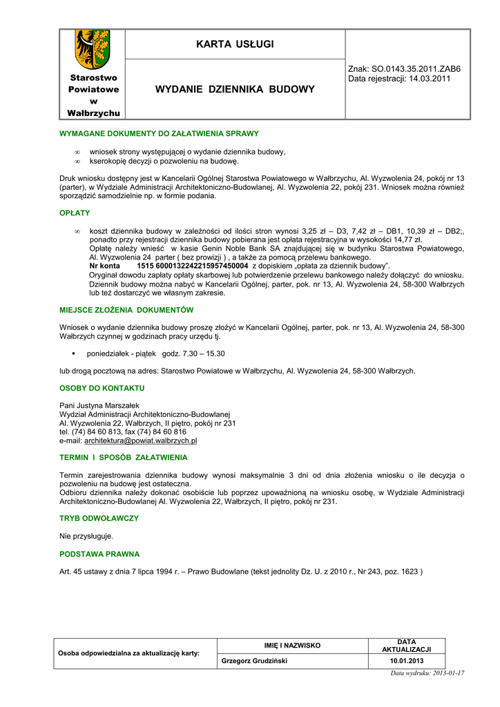 KARTA USŁUGI Starostwo Powiatowe w Wałbrzychu Znak: SO.0143.35.2011.ZAB6 Data rejestracji: 14.03.2011 WYDANIE DZIENNIKA BUDOWY WYMAGANE DOKUMENTY DO ZAŁATWIENIA SPRAWY • • wniosek strony występującej o wydanie dziennika budowy, kserokopię decyzji o pozwoleniu na budowę. Druk wniosku dostępny jest w Kancelarii Ogólnej Starostwa Powiatowego w Wałbrzychu, Al. Wyzwolenia 24, pokój nr 13 (parter), w Wydziale Administracji Architektoniczno-Budowlanej, Al. Wyzwolenia 22, pokój 231. Wniosek można również sporządzić samodzielnie np. w formie podania. OPŁATY • koszt dziennika budowy w zależności od ilości stron wynosi 3,25 zł – D3, 7,42 zł – DB1, 10,39 zł – DB2;, ponadto przy rejestracji dziennika budowy pobierana jest opłata rejestracyjna w wysokości 14,77 zł. Opłatę należy wnieść w kasie Genin Noble Bank SA znajdującej się w budynku Starostwa Powiatowego, Al. Wyzwolenia 24 parter ( bez prowizji ) , a także za pomocą przelewu bankowego. Nr konta 1515 6000132242215957450004 z dopiskiem „opłata za dziennik budowy”. Oryginał dowodu zapłaty opłaty skarbowej lub potwierdzenie przelewu bankowego należy dołączyć do wniosku. Dziennik budowy można nabyć w Kancelarii Ogólnej, parter, pok. nr 13, Al. Wyzwolenia 24, 58-300 Wałbrzych lub też dostarczyć we własnym zakresie. MIEJSCE ZŁOŻENIA DOKUMENTÓW Wniosek o wydanie dziennika budowy proszę złożyć w Kancelarii Ogólnej, parter, pok. nr 13, Al. Wyzwolenia 24, 58-300 Wałbrzych czynnej w godzinach pracy urzędu tj. poniedziałek - piątek godz. 7.30 – 15.30 lub drogą pocztową na adres: Starostwo Powiatowe w Wałbrzychu, Al. Wyzwolenia 24, 58-300 Wałbrzych. OSOBY DO KONTAKTU Pani Justyna Marszałek Wydział Administracji Architektoniczno-Budowlanej Al. Wyzwolenia 22, Wałbrzych, II piętro, pokój nr 231 tel. (74) 84 60 813, fax (74) 84 60 816 e-mail: [email protected] TERMIN I SPOSÓB ZAŁATWIENIA Termin zarejestrowania dziennika budowy wynosi maksymalnie 3 dni od dnia złożenia wniosku o ile decyzja o pozwoleniu na budowę jest ostateczna. Odbioru dziennika należy dokonać osobiście lub poprzez upoważnioną na wniosku osobę, w Wydziale Administracji Architektoniczno-Budowlanej Al. Wyzwolenia 22, Wałbrzych, II piętro, pokój nr 231. TRYB ODWOŁAWCZY Nie przysługuje. PODSTAWA PRAWNA Art. 45 ustawy z dnia 7 lipca 1994 r. – Prawo Budowlane (tekst jednolity Dz. U. z 2010 r., Nr 243, poz. 1623 ) IMIĘ I NAZWISKO Osoba odpowiedzialna za aktualizację karty: Grzegorz Grudziński DATA AKTUALIZACJI 10.01.2013 Data wydruku: 2013-01-17