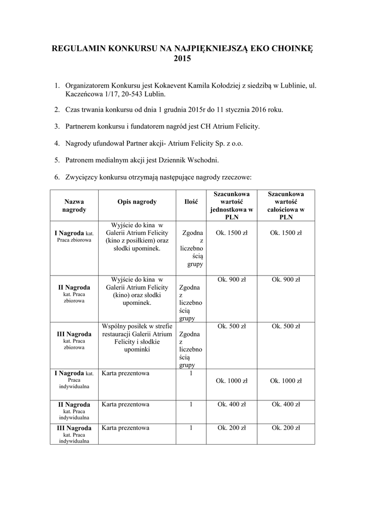 REGULAMIN KONKURSU NA NAJPIĘKNIEJSZĄ EKO CHOINKĘ 2015 1. Organizatorem Konkursu jest Kokaevent Kamila Kołodziej z siedzibą w Lublinie, ul. Kaczeńcowa 1/17, 20-543 Lublin. 2. Czas trwania konkursu od dnia 1 grudnia 2015r do 11 stycznia 2016 roku. 3. Partnerem konkursu i fundatorem nagród jest CH Atrium Felicity. 4. Nagrody ufundował Partner akcji- Atrium Felicity Sp. z o.o. 5. Patronem medialnym akcji jest Dziennik Wschodni. 6. Zwycięzcy konkursu otrzymają następujące nagrody rzeczowe: Nazwa nagrody I Nagroda kat. Praca zbiorowa II Nagroda kat. Praca zbiorowa III Nagroda kat. Praca zbiorowa I Nagroda kat. Opis nagrody Wyjście do kina w Galerii Atrium Felicity (kino z posiłkiem) oraz słodki upominek. Wyjście do kina w Galerii Atrium Felicity (kino) oraz słodki upominek. Wspólny posiłek w strefie restauracji Galerii Atrium Felicity i słodkie upominki Karta prezentowa Ilość Zgodna z liczebno ścią grupy Szacunkowa wartość całościowa w PLN Ok. 1500 zł Ok. 1500 zł Ok. 900 zł Ok. 900 zł Ok. 500 zł Ok. 500 zł Ok. 1000 zł Ok. 1000 zł Zgodna z liczebno ścią grupy Zgodna z liczebno ścią grupy 1 Praca indywidualna II Nagroda Szacunkowa wartość jednostkowa w PLN Karta prezentowa 1 Ok. 400 zł Ok. 400 zł Karta prezentowa 1 Ok. 200 zł Ok. 200 zł kat. Praca indywidualna III Nagroda kat. Praca indywidualna 7. Warunkiem wzięcia udziału w Konkursie jest dostarczenie należycie opisanej Eko Choinki (autorstwo, placówka - w przypadku prac grupowych, dane adresowe i telefon) do dnia 19 grudnia 2015r. do Biura Administracji CH Atrium Felicity (II piętro, Al. Witosa 32, 20-315 Lublin). Aby praca została zakwalifikowana do konkursu musi zostać wykonana z materiałów ekologicznych lub poddawanych recyclingowi. Dopuszczone materiały obejmują m.in.: drewno, szyszki, zboża, kasztany, pióra, gałązki, makaron, suszone owoce, tektura, butelki PET, sznurki, korki itp. Organizator zastrzega sobie prawo niedopuszczenia do konkursu prac niewykonanych zgodnie z powyższymi wymogami. 8. Wystawa Eko Choinek odbędzie się w dniach 21 grudnia 2015 – 10 stycznia 2016 w CH Atrium Felicity. 9. Spośród wszystkich dostarczonych Eko Choinek, powołana przez Organizatora Komisja Konkursowa wybierze w dniu 11 stycznia 2016r. najlepsze, zdaniem Komisji, prace. Autorom najciekawszych prac zostaną przyznane poszczególne nagrody, o których mowa w Punkcie 4 powyżej. 10. Uczestnicy Konkursu dostarczą Organizatorowi najpóźniej w dniu rozpoczęcia konkursu pisemną zgodę opiekuna prawnego na opublikowanie zdjęć zgłoszonych przez nich Eko Choinek oraz na podanie ich danych osobowych (autorstwo pracy) na stronie internetowej Organizatora (www.atrium-felicity.pl) oraz na łamach prasy. 11. Lista osób nagrodzonych zostanie opublikowana na stronie internetowej Organizatora w ciągu 4 dni od dnia zakończenia Konkursu. Ponadto poszczególni uczestnicy zostaną poinformowani o przyznanych nagrodach do dnia 15 stycznia 2016 roku. 12. Nagrody będą wydawane zwycięzcom przez Organizatora konkursu na jego koszt i będą poświadczone protokołem odbioru nagrody. 13. Uczestnikowi Konkursu, któremu zostanie przyznana Nagroda (rzeczowa), Organizator przyzna również dodatkową nagrodę pieniężną, w wysokości, która po pomniejszeniu o zryczałtowany podatek dochodowy od osób fizycznych od tej nagrody pieniężnej, wystarczy na pokrycie kwoty zryczałtowanego podatku dochodowego od osób fizycznych, należnego od przyznanej Nagrody (rzeczowej). Dodatkowa nagroda pieniężna zostanie pobrana przez Organizatora, jako płatnika 10% zryczałtowanego podatku dochodowego od osób fizycznych od całkowitej wartości przyznanych w konkursie nagród (art. 30 ust. 1 pkt. 2 ustawy z dnia 26 lipca 1991 roku o podatku dochodowym od osób fizycznych) i przekazana do właściwego Urzędu Skarbowego. 14. Organizator nie ponosi odpowiedzialności za brak możliwości odbioru nagrody z przyczyn leżących po stronie Zwycięzców, w tym także za brak możliwości skontaktowania się ze Zwycięzcami Konkursu pod wskazanymi przez nich adresami lub innymi danymi kontaktowymi. 15. W przypadku nieodebrania nagrody w ciągu 30 dni roboczych od ogłoszenia wyników konkursu na stronie internetowej i powiadomieniu Zwycięzców, nagroda przechodzi na własność Organizatora. 16. Organizator zastrzega sobie możliwość wyróżnienia dodatkowych prac. 17. Zwycięzcy nie mogą wymieniać nagród na równowartość w gotówce, ani zamieniać ich na inne nagrody. 18. Ewentualne reklamacje dot. Konkursu będą rozstrzygane przez Organizatora. Reklamacje należy złożyć pisemnie w siedzibie Organizatora w terminie 7 dni od dnia zakończenia Konkursu. 19. Udział w Konkursie jest dobrowolny i bezpłatny. 20. Uczestnikiem Konkursu może być każde dziecko lub grupa dzieci grupa z Lublina i regionu lubelskiego w wieku do10 lat. 21. Każdy Uczestnik Konkursu dostarczy Organizatorowi najpóźniej w dniu rozpoczęcia konkursu pisemną zgodę opiekuna prawnego na przetwarzanie danych osobowych uczestnika dla celów związanych z rozstrzygnięciem Konkursu oraz akceptację niniejszego regulaminu. 22. Dane osobowe uczestników konkursu mogą być wykorzystywane zgodnie z ustawą o ochronie danych osobowych z dnia 29 sierpnia 1997 r. (Dz. Ustaw z 2002 r. Nr 101, poz. 926) przez organizatora w niniejszym konkursie. 23. Warunkiem wzięcia udziału w konkursie jest akceptacja warunków niniejszego regulaminu. 24. Nadesłane prace przechodzą na własność Organizatora. 25. Uczestnik przystępując do konkursu wyraża zgodę na publiczne wystawianie oraz rozpowszechnianie, przystosowanie i publikowanie pracy oraz jej zwielokrotnienie jakąkolwiek techniką i w dowolnym celu. 26. Organizator zastrzega sobie prawo do ostatecznej interpretacji ewentualnych spornych kwestii wynikających z niniejszego regulaminu. 27. Organizator zastrzega sobie możliwości wprowadzenia zmian w Regulaminie. 28. Organizator ma prawo odwoł