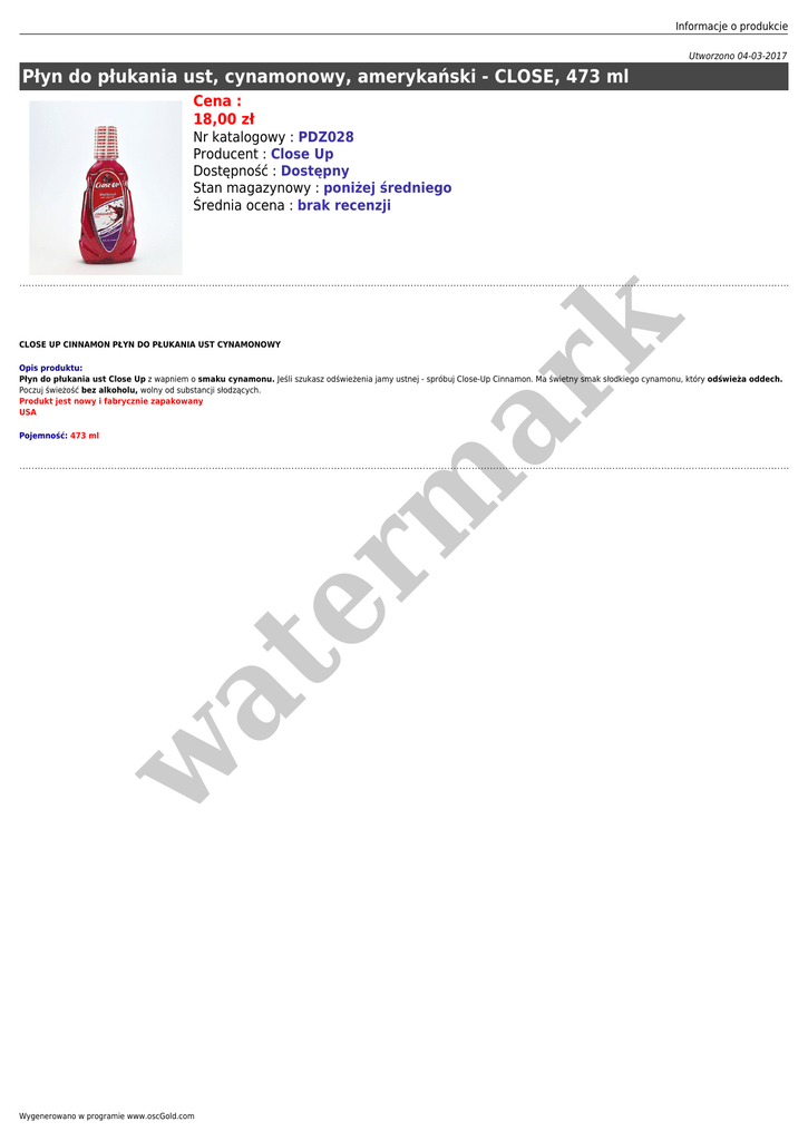 Informacje o produkcie Utworzono 04-03-2017 Płyn do płukania ust, cynamonowy, amerykański - CLOSE, 473 ml Cena : 18,00 zł er m ar k Nr katalogowy : PDZ028 Producent : Close Up Dostępność : Dostępny Stan magazynowy : poniżej średniego Średnia ocena : brak recenzji CLOSE UP CINNAMON PŁYN DO PŁUKANIA UST CYNAMONOWY Opis produktu: Płyn do płukania ust Close Up z wapniem o smaku cynamonu. Jeśli szukasz odświeżenia jamy ustnej - spróbuj Close-Up Cinnamon. Ma świetny smak słodkiego cynamonu, który odświeża oddech. Poczuj świeżość bez alkoholu, wolny od substancji słodzących. Produkt jest nowy i fabrycznie zapakowany USA w at Pojemność: 473 ml Wygenerowano w programie www.oscGold.com